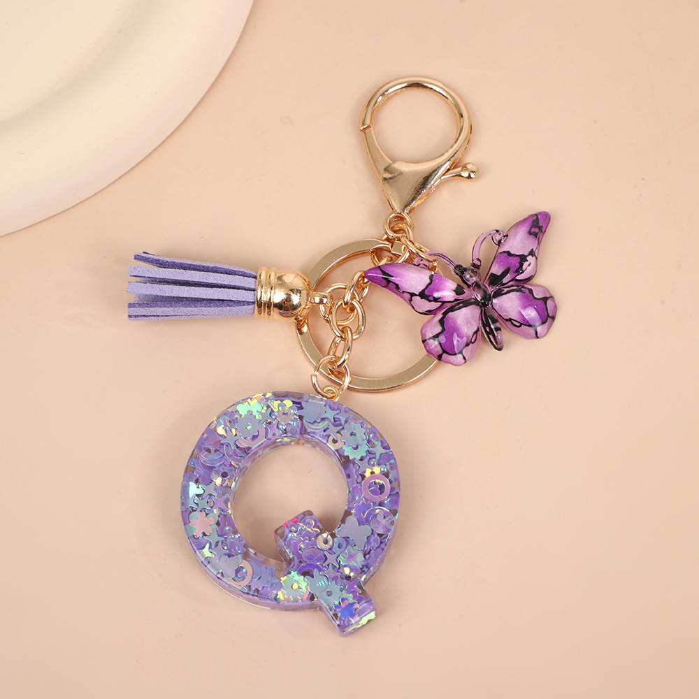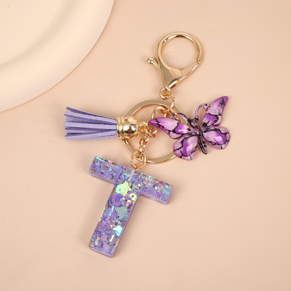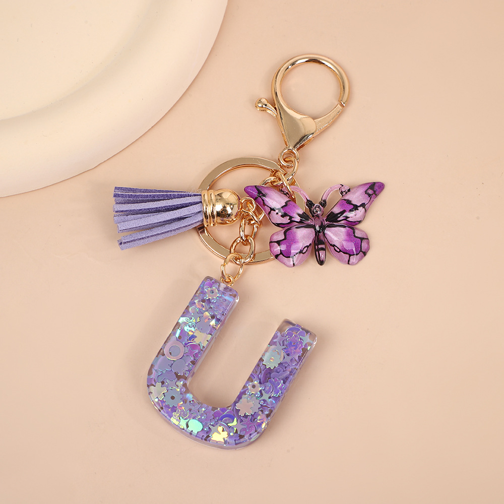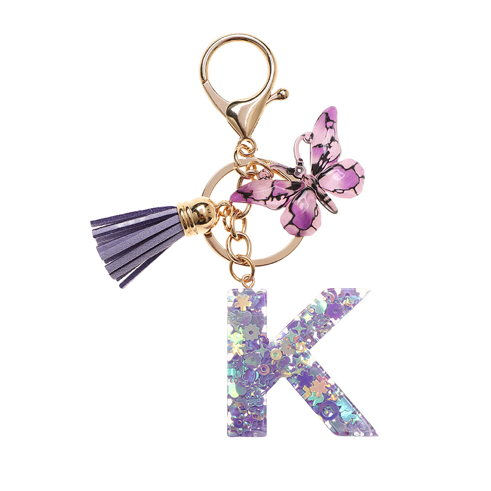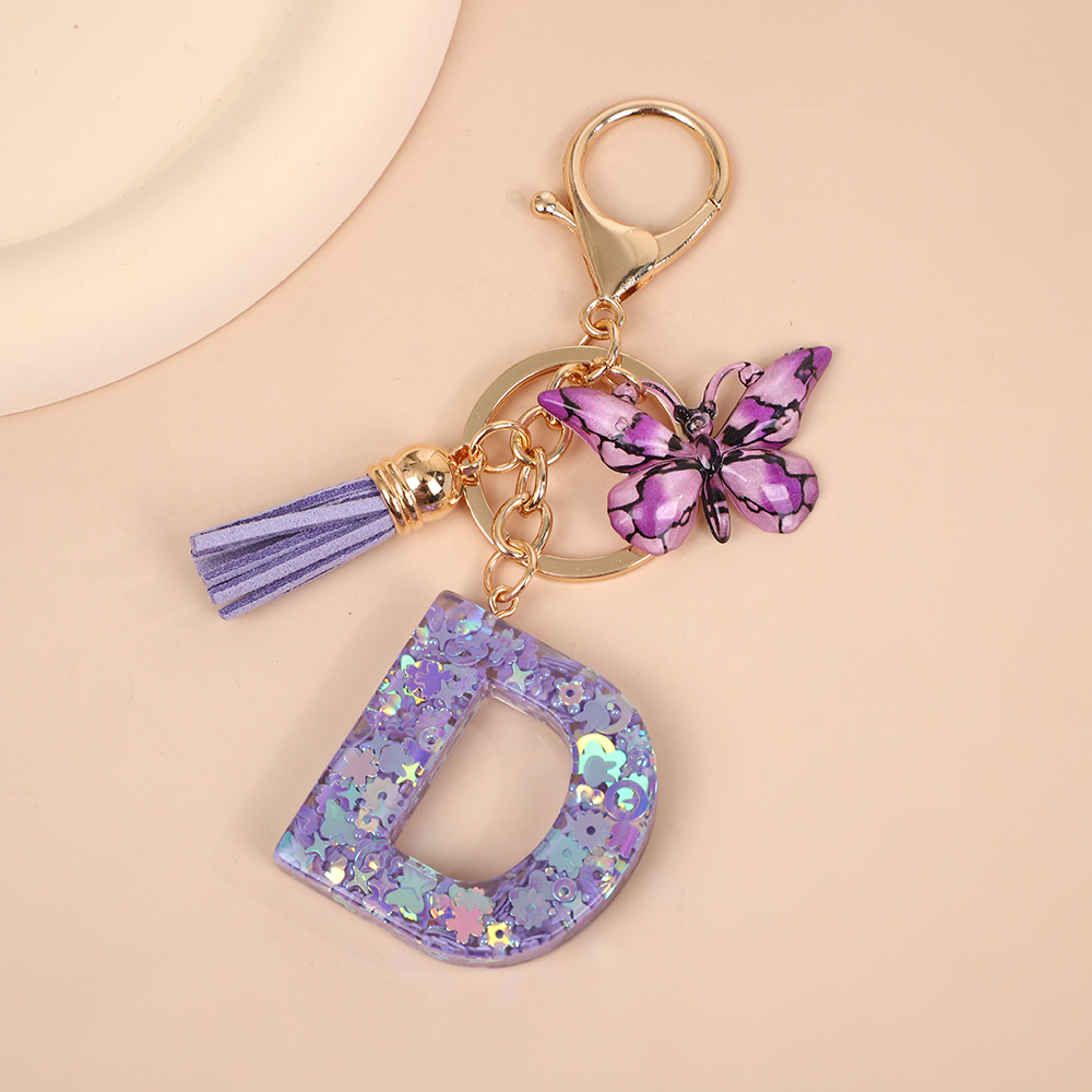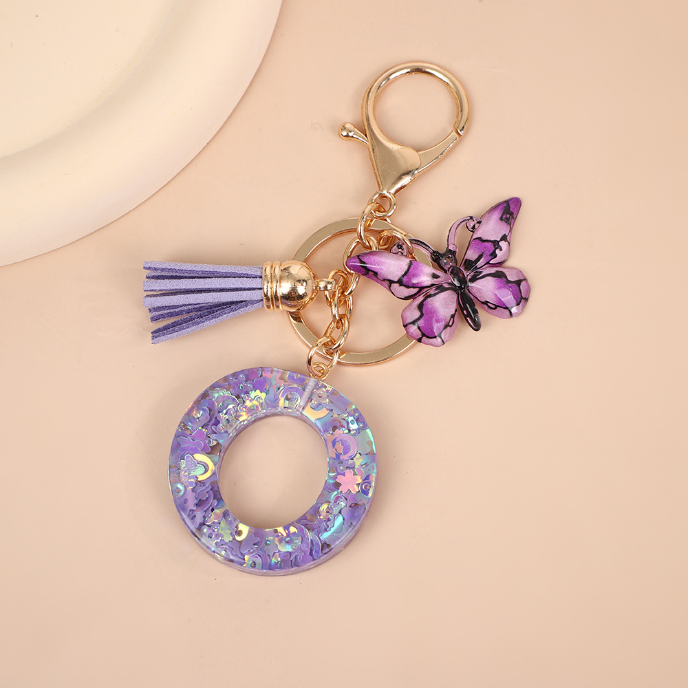 跨境紫色树脂字母钥匙扣花蝴蝶流苏滴胶26字母包挂件挂饰配件
