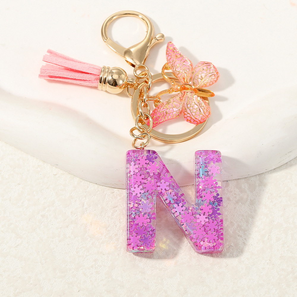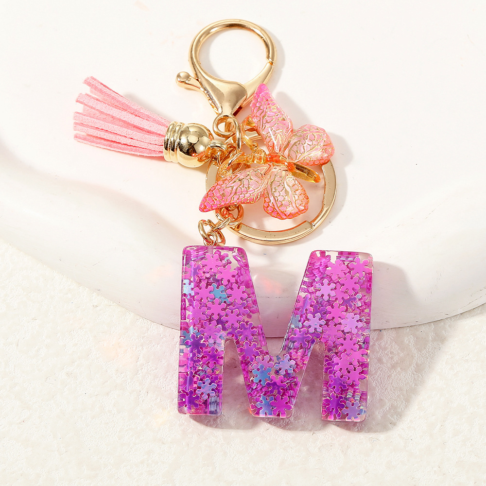 新款浅紫混色闪粉英文字母树脂钥匙挂件时尚简约蝴蝶流苏包包挂件