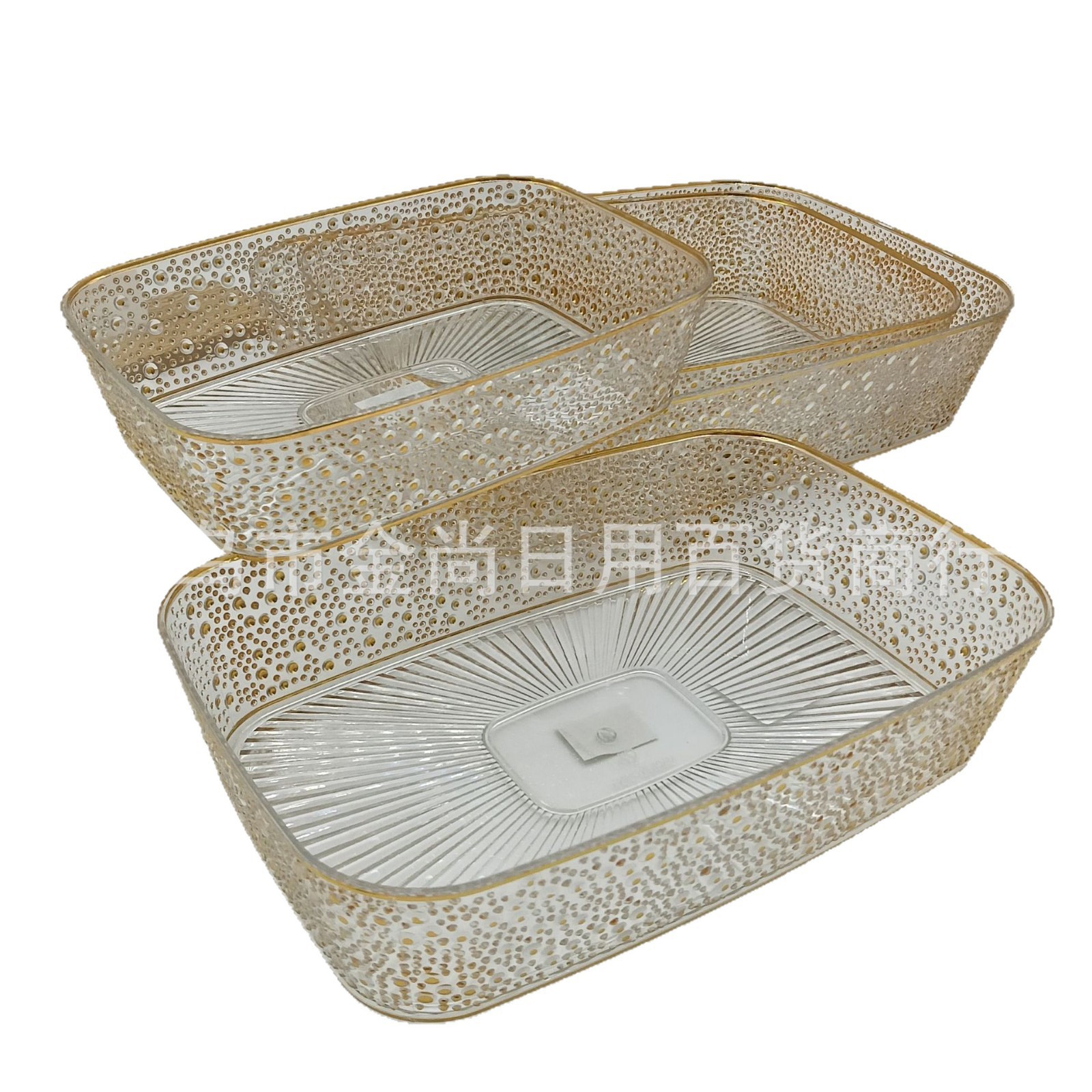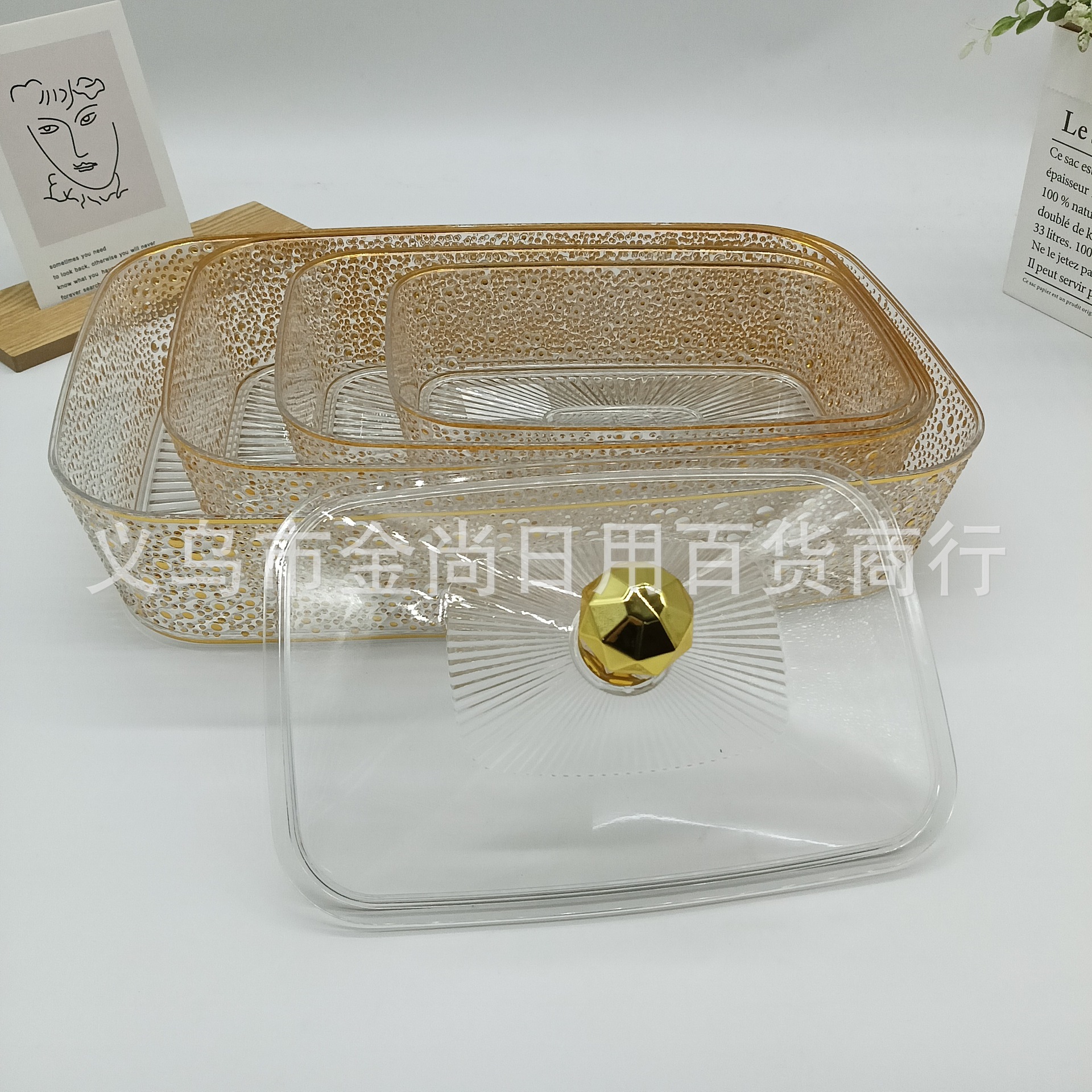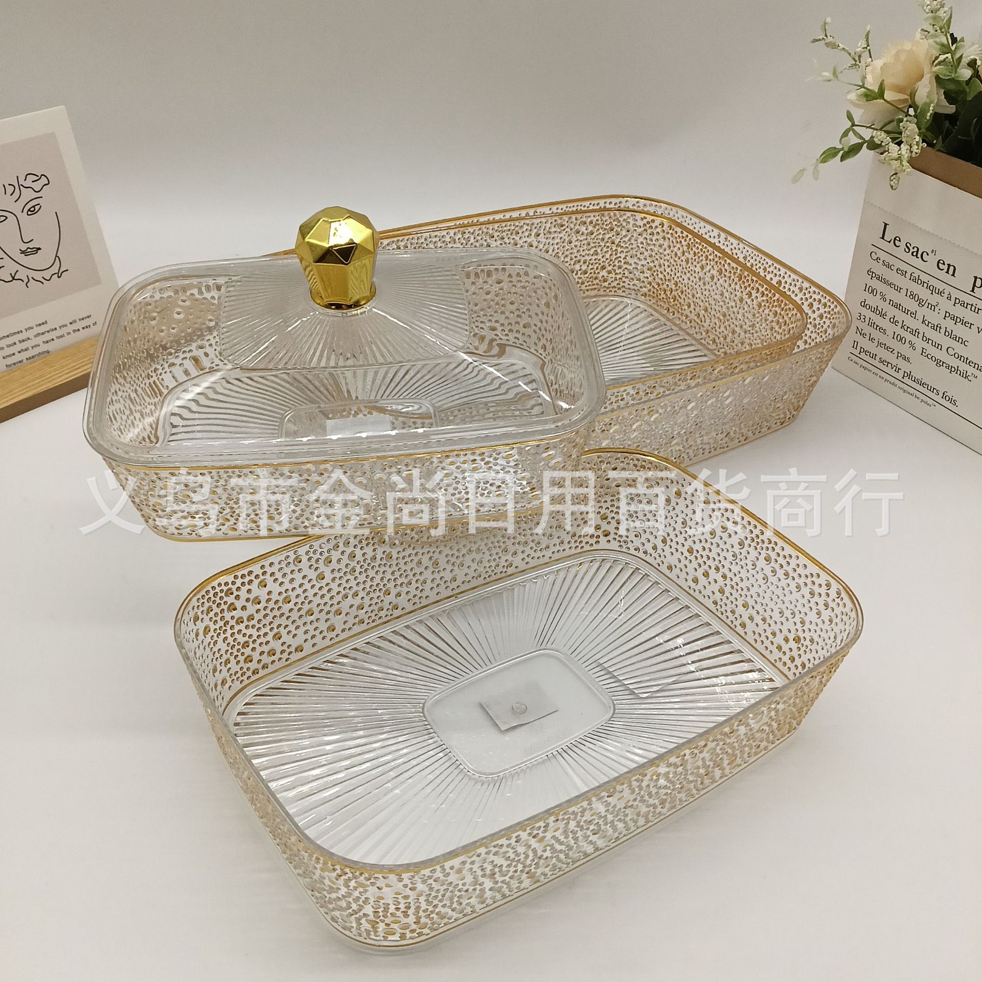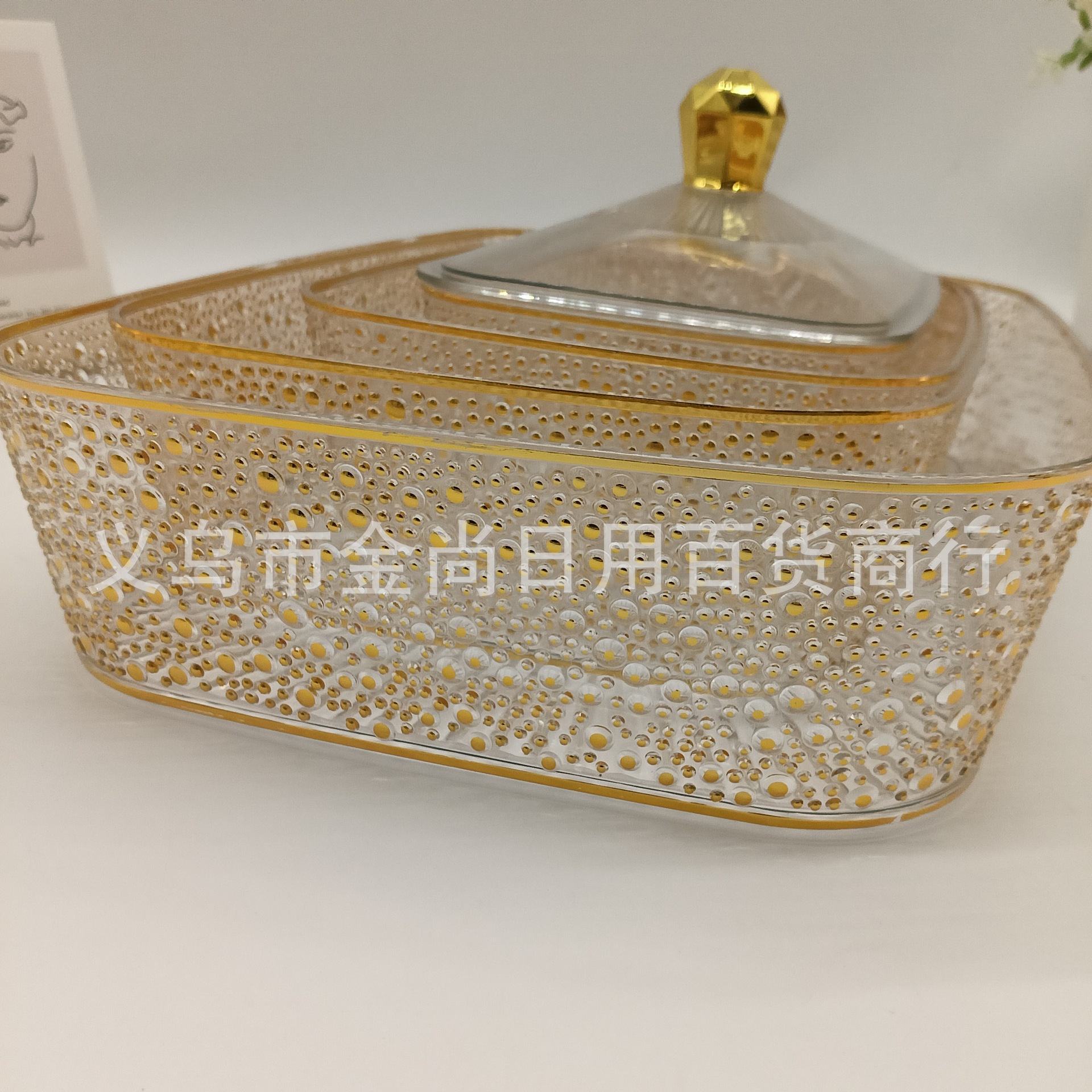 透明带盖收纳盒桌面食物零食整理储物果珍珠金色长方形水果盘金边