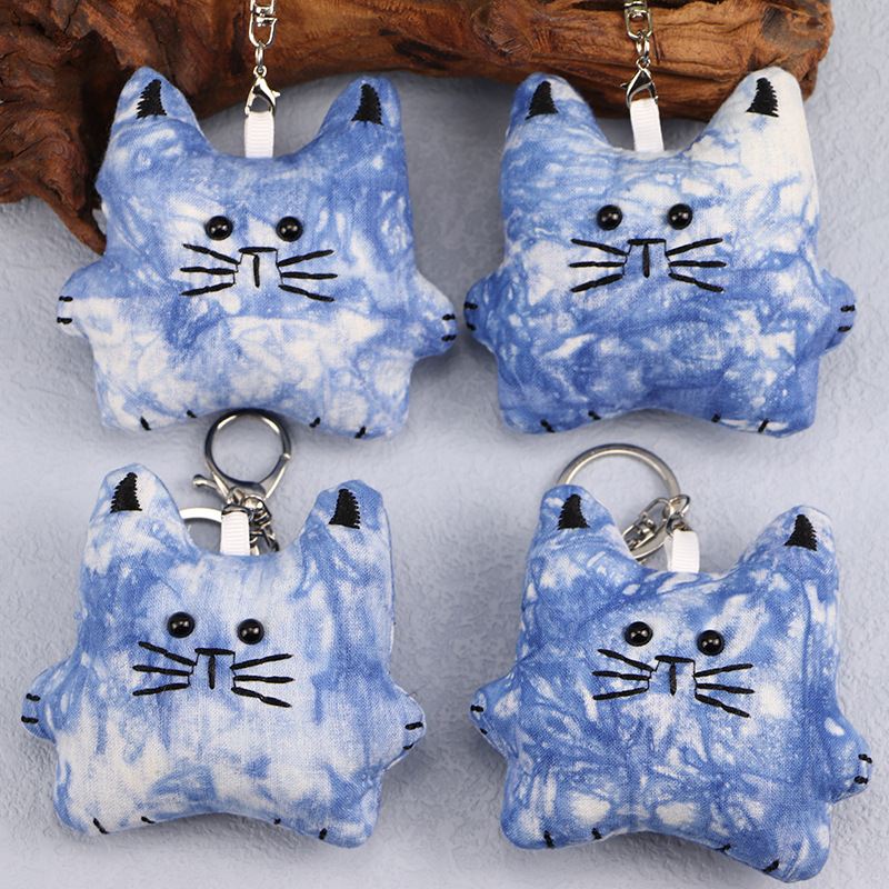 批发云南大理古城手工布艺扎染蓝染卡通小猫咪钥匙扣挂件包挂礼物