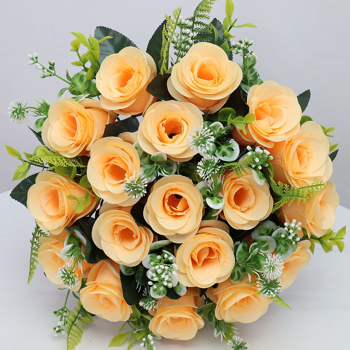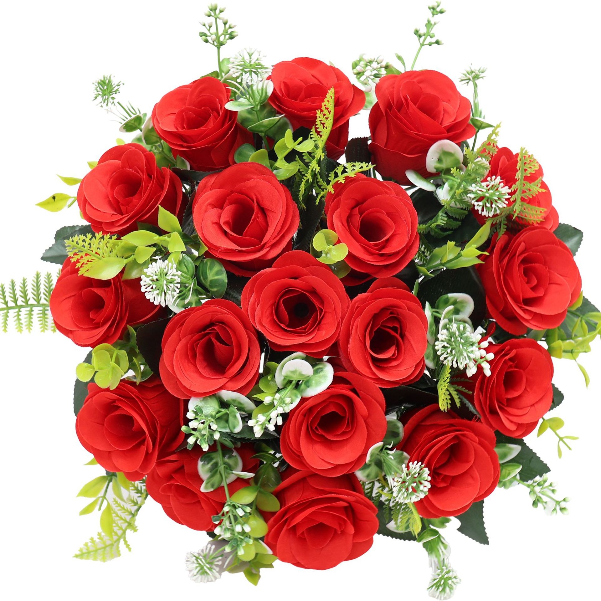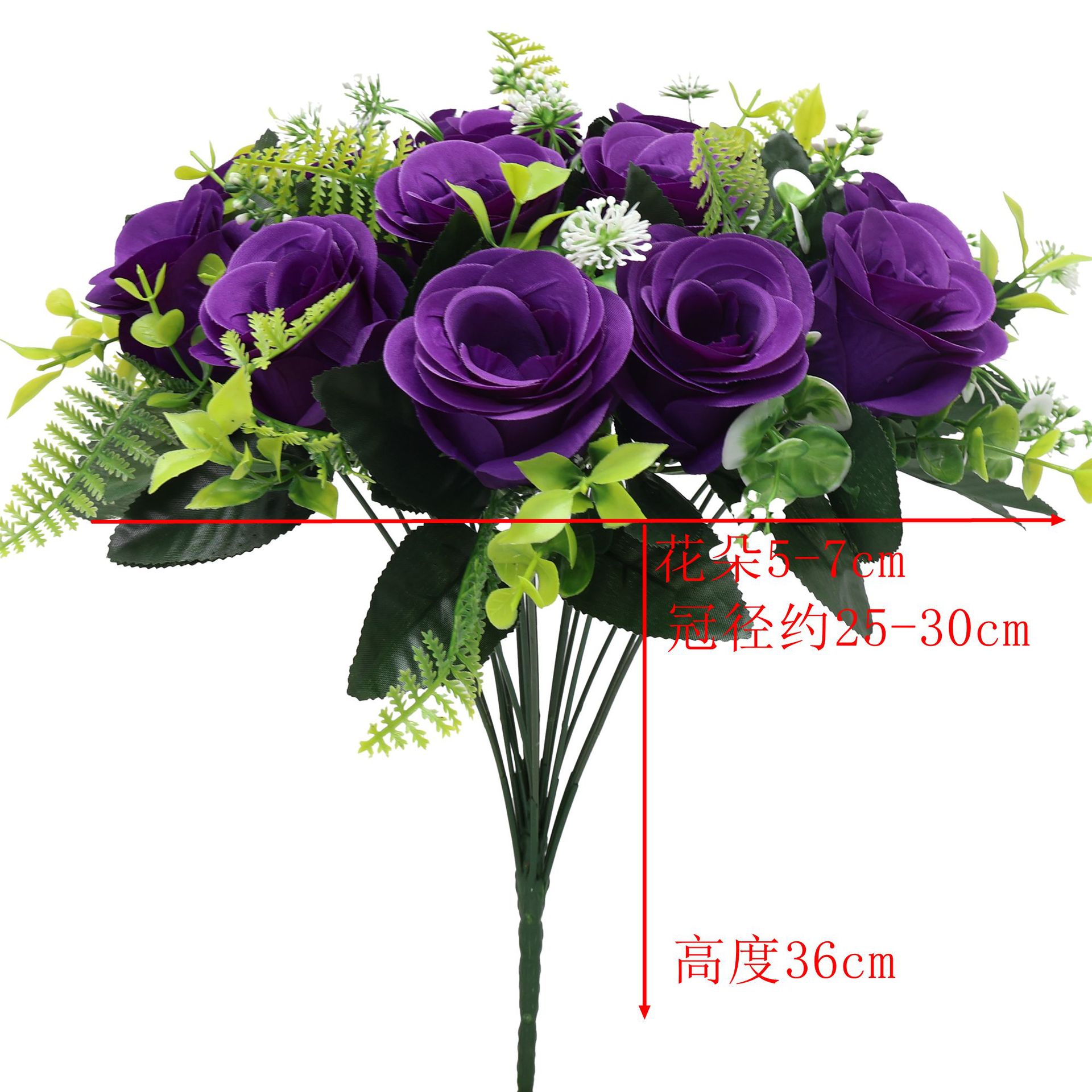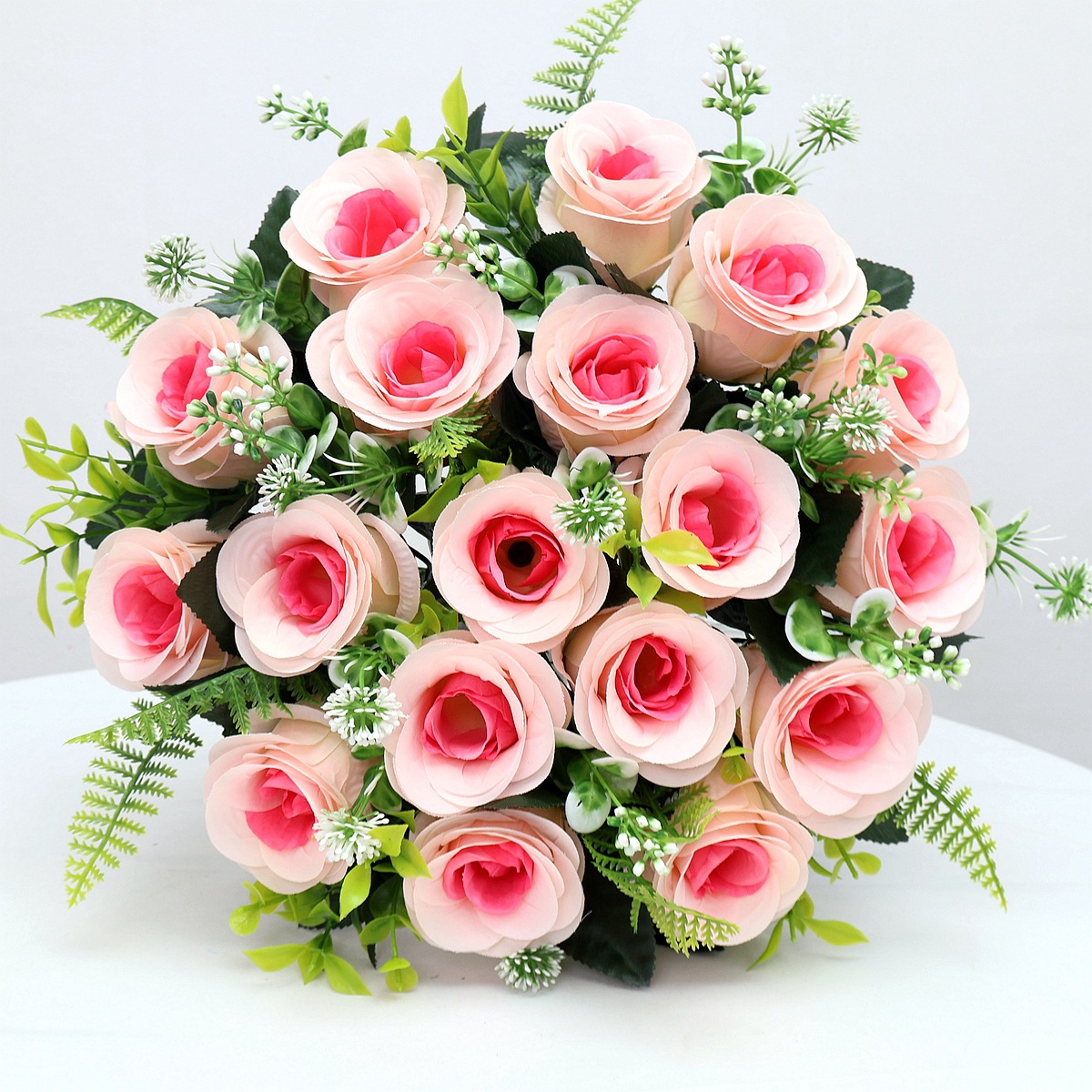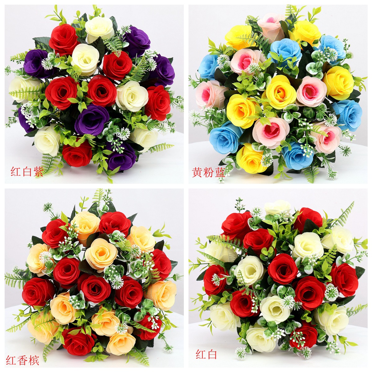 跨境仿真花新娘手捧花束18头平头仿真玫瑰手把花居家装饰假花摆放