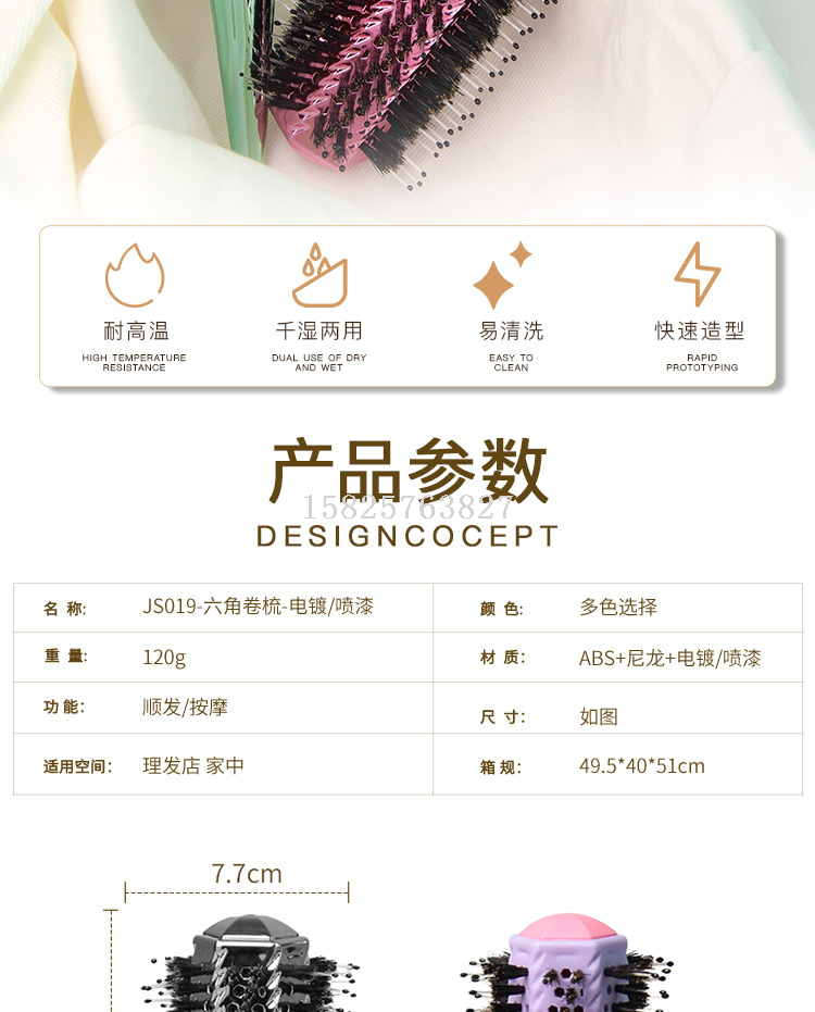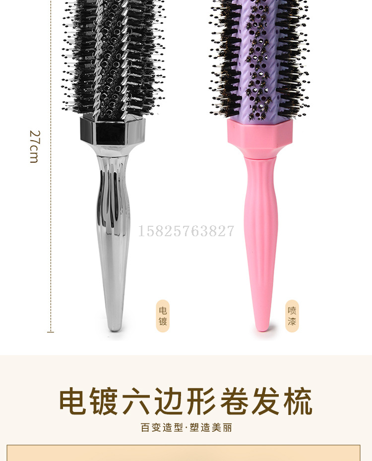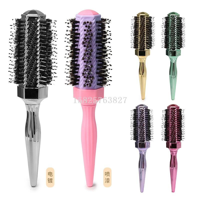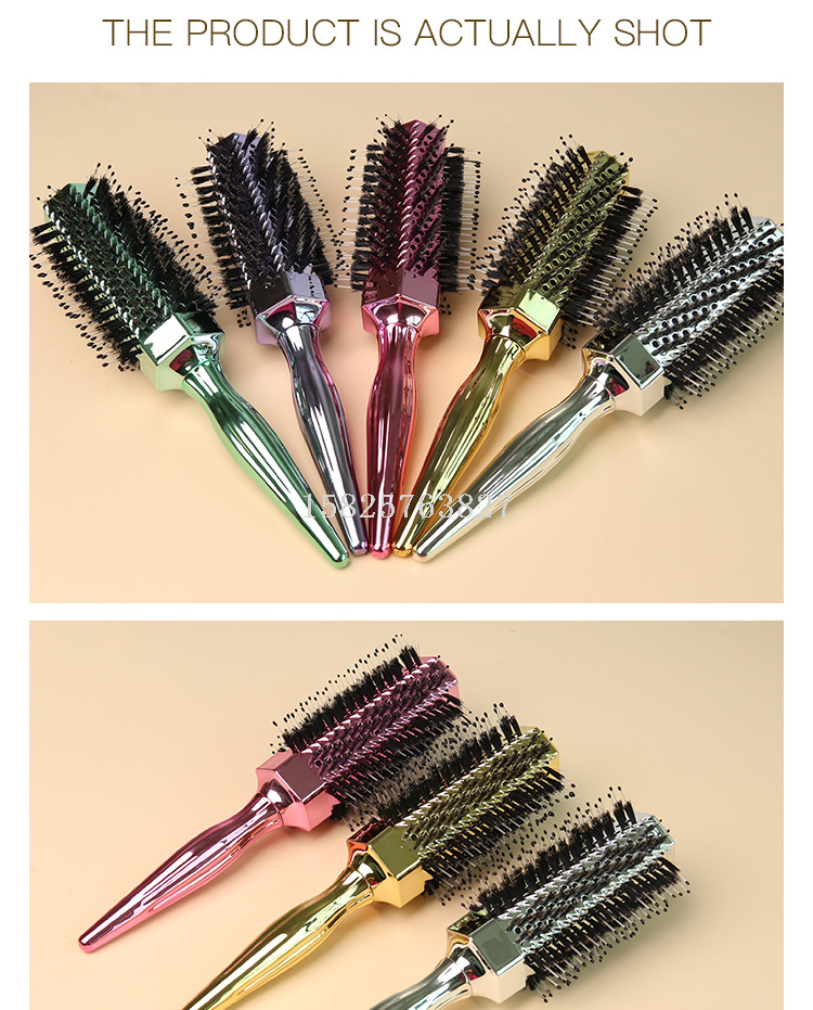 跨境新款电镀六角卷梳造型梳发廊家用刘海蓬松卷发梳滚筒梳铝管梳