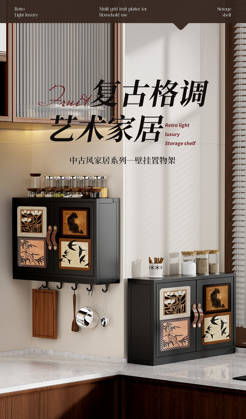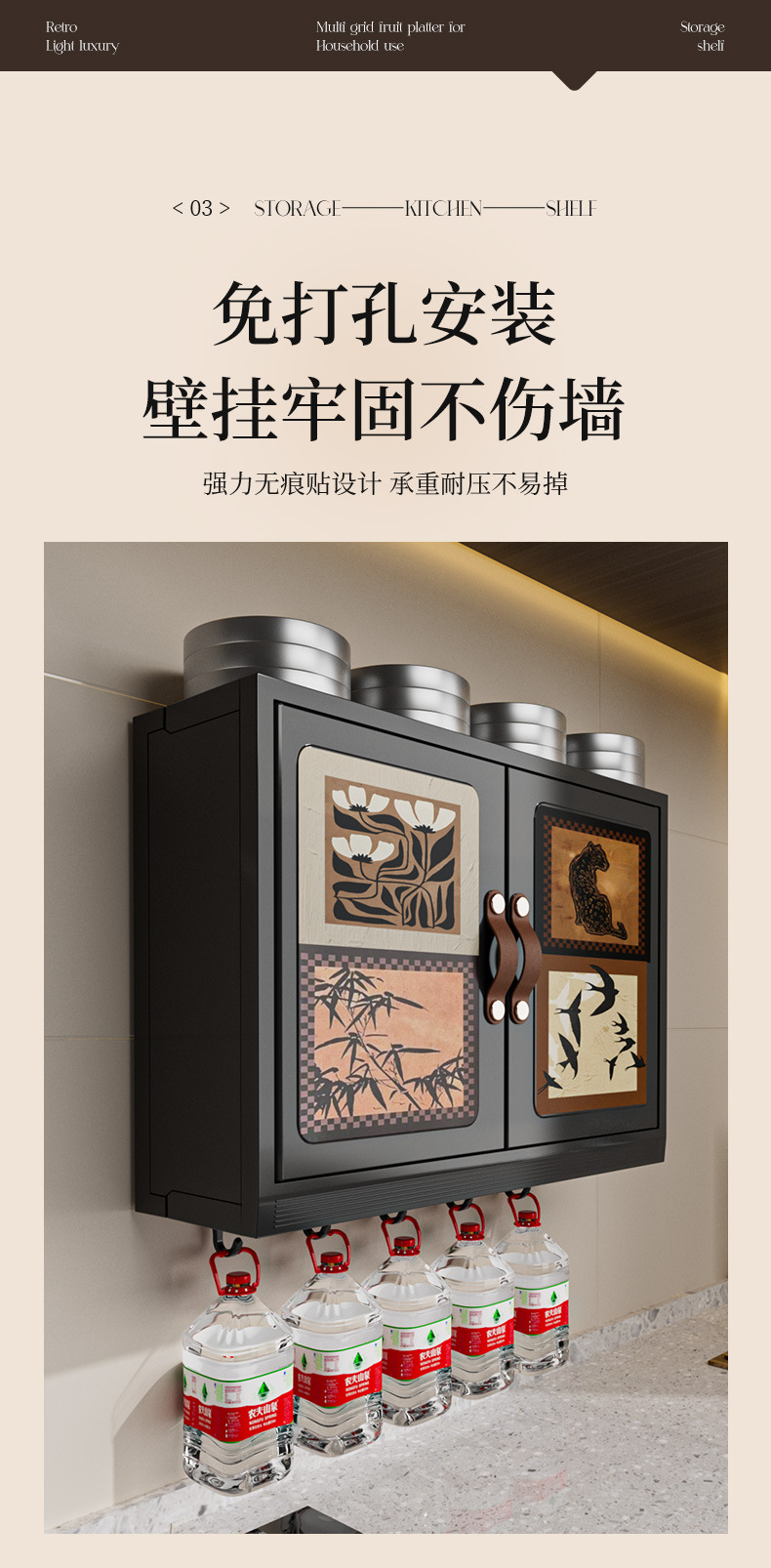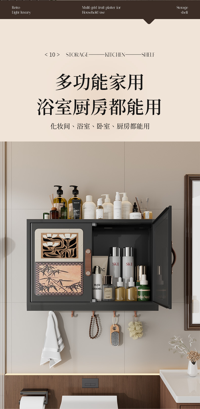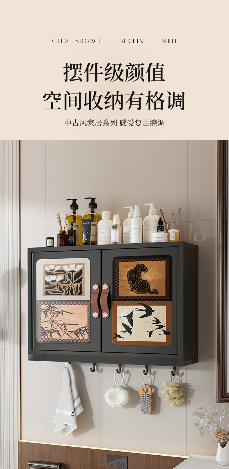 中古风厨房浴室壁挂式收纳盒免打孔挂墙带柜门带挂钩收纳架多功能