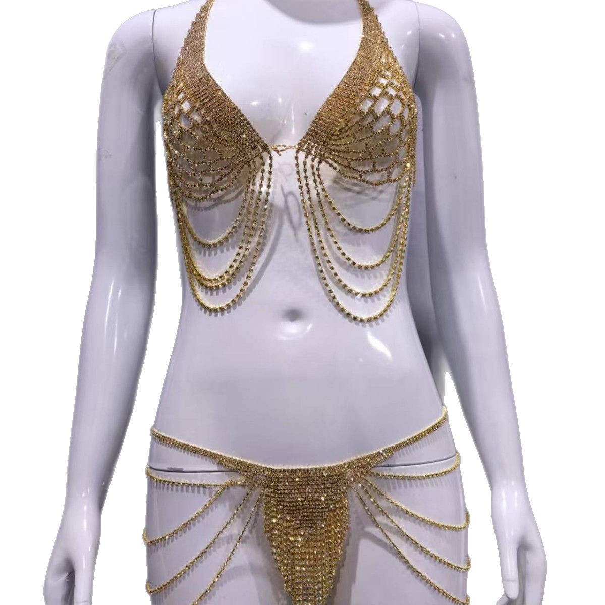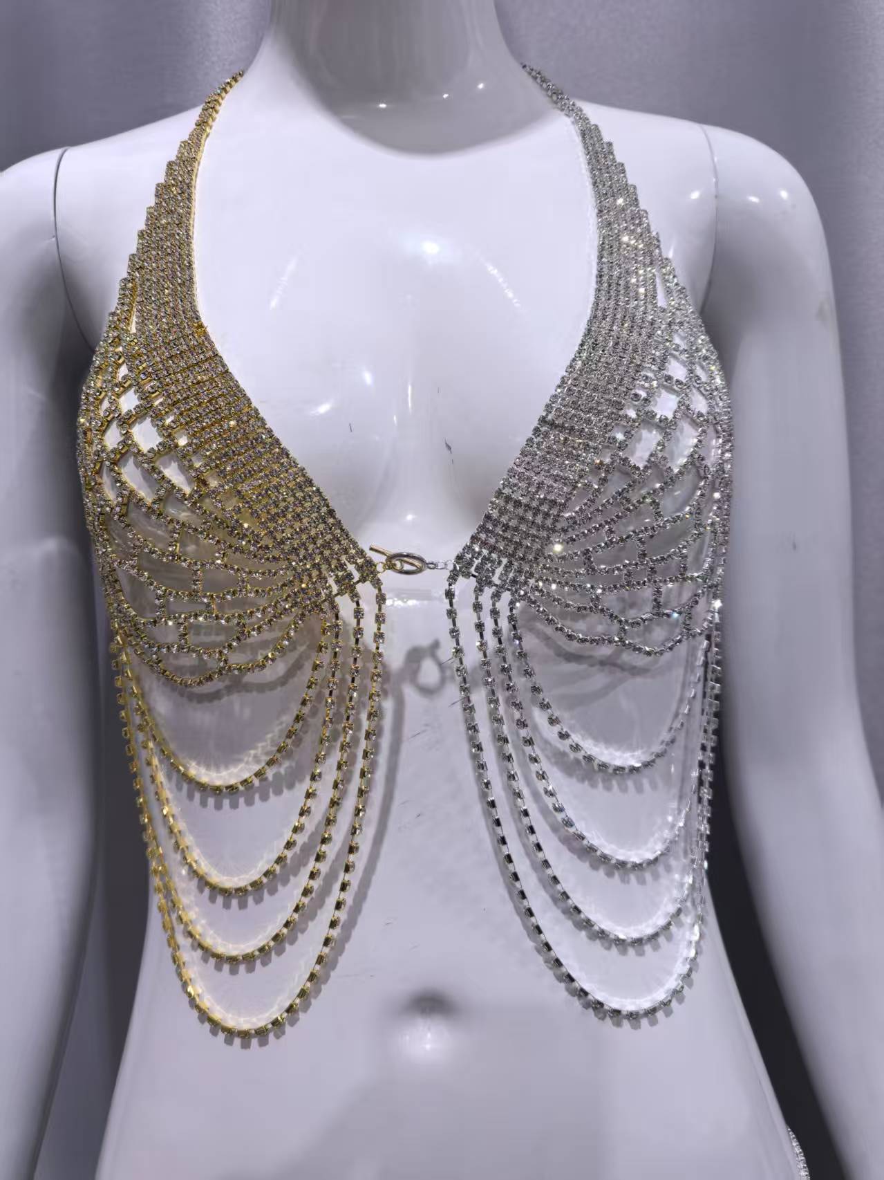 跨境时尚热销天使翅膀水钻流苏身体链 时尚满钻流苏胸链女套装