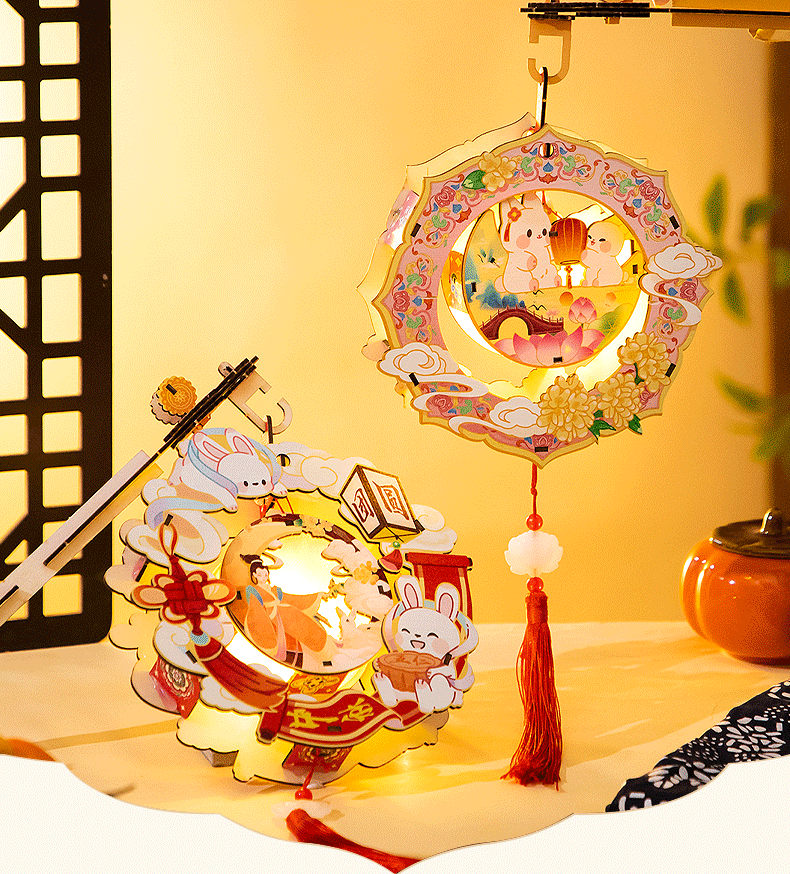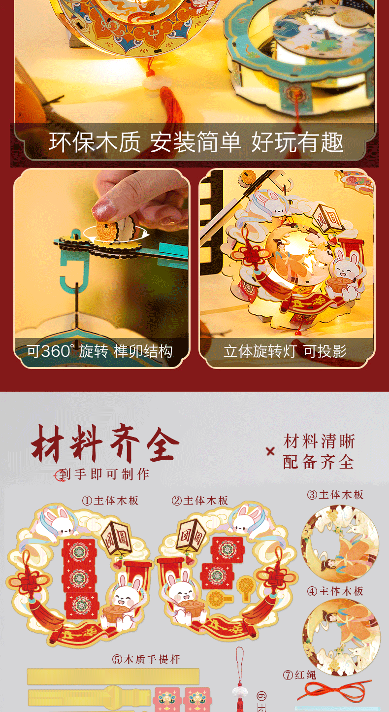 中秋节灯笼手提木质旋转花灯儿童手工diy材料小兔子发光宫灯批发