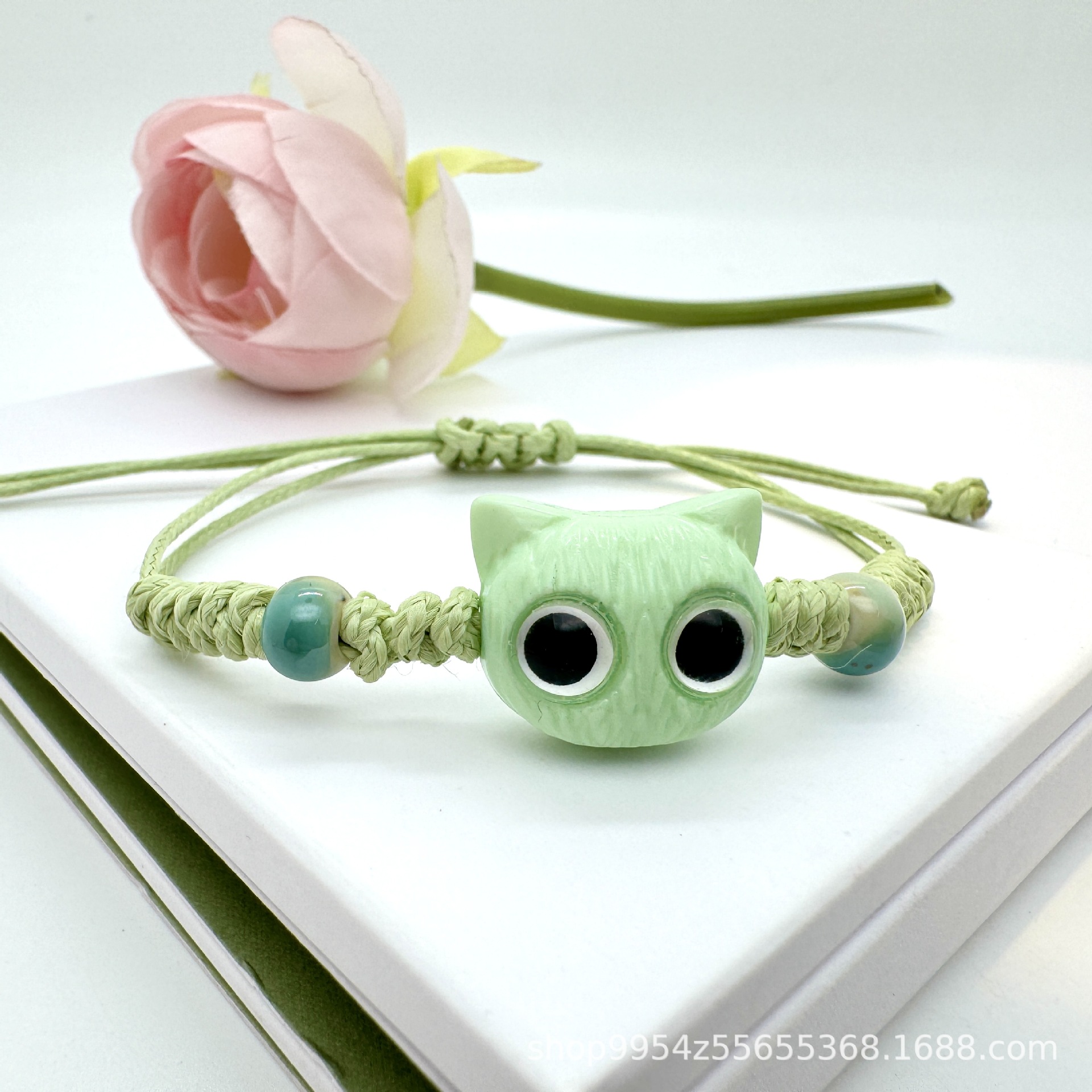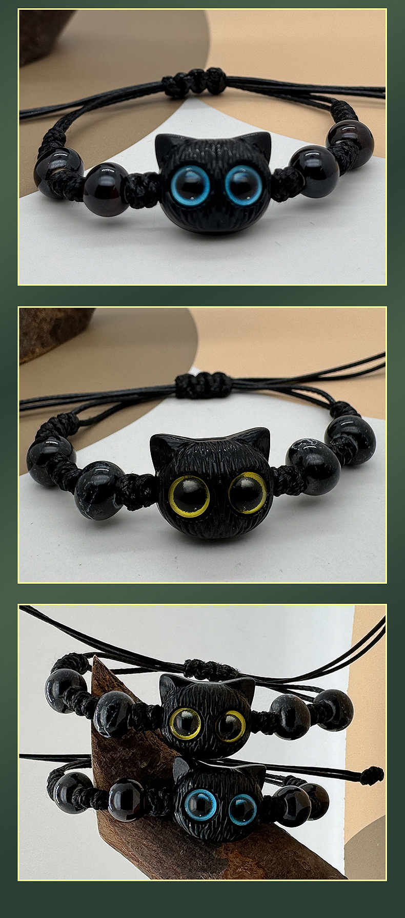 卡通可爱猫咪编织手串黑猫手串新款黑檀木黑白调可爱ins情侣手串