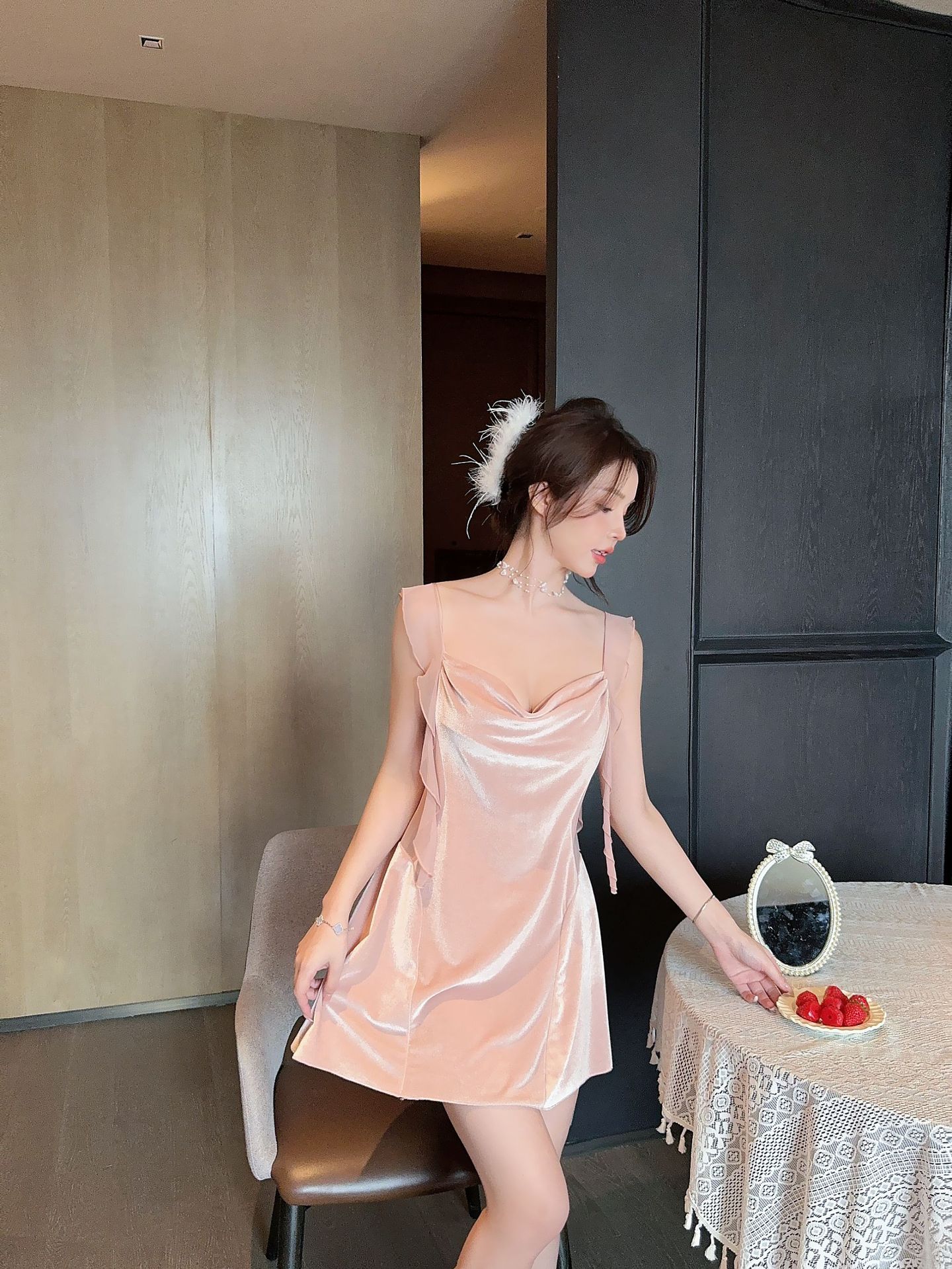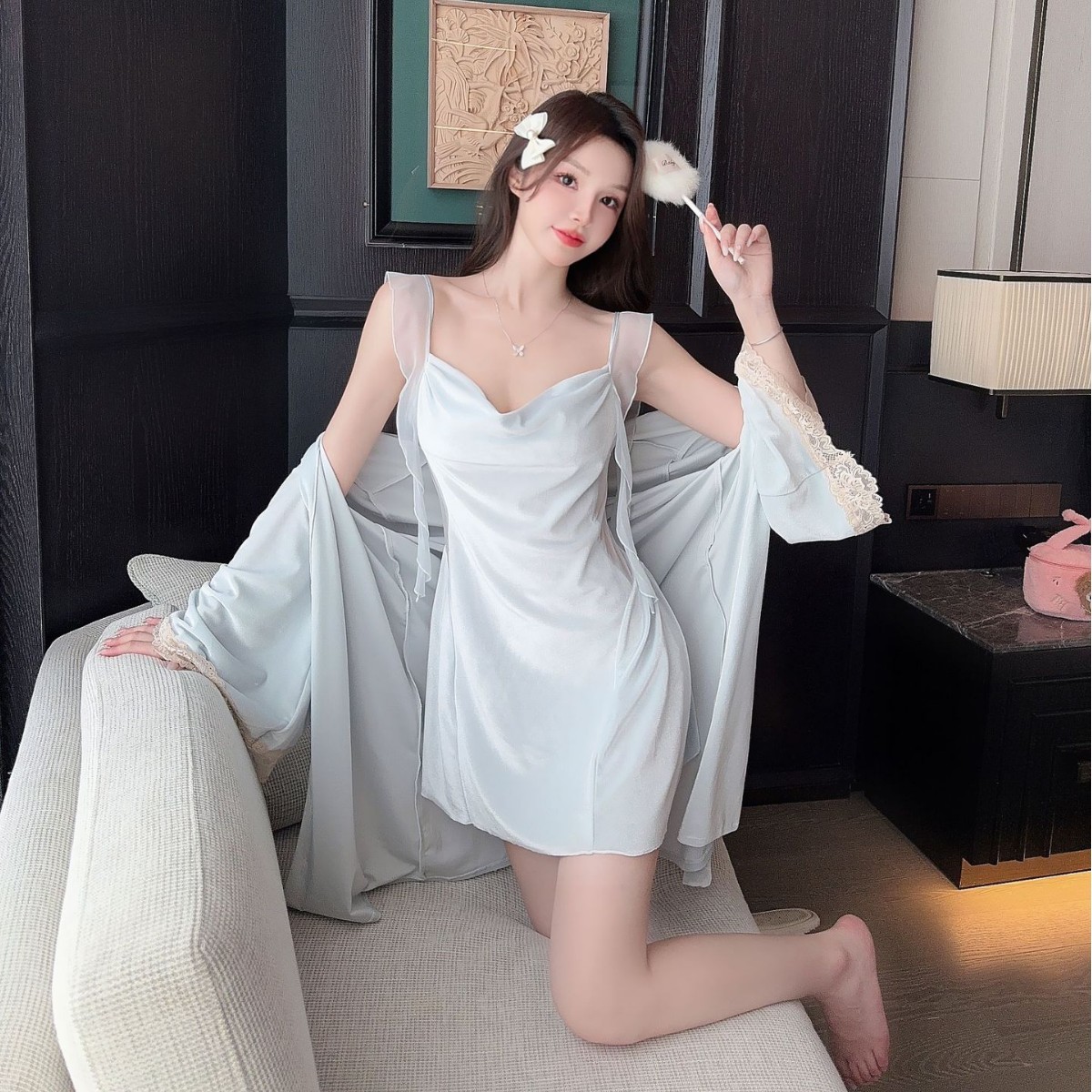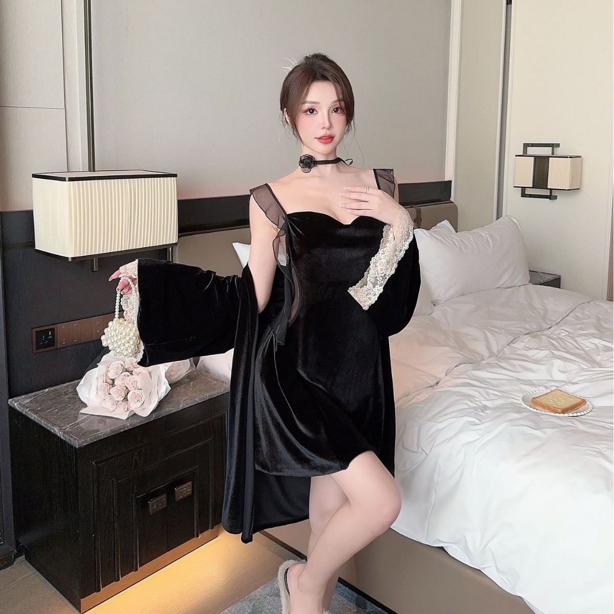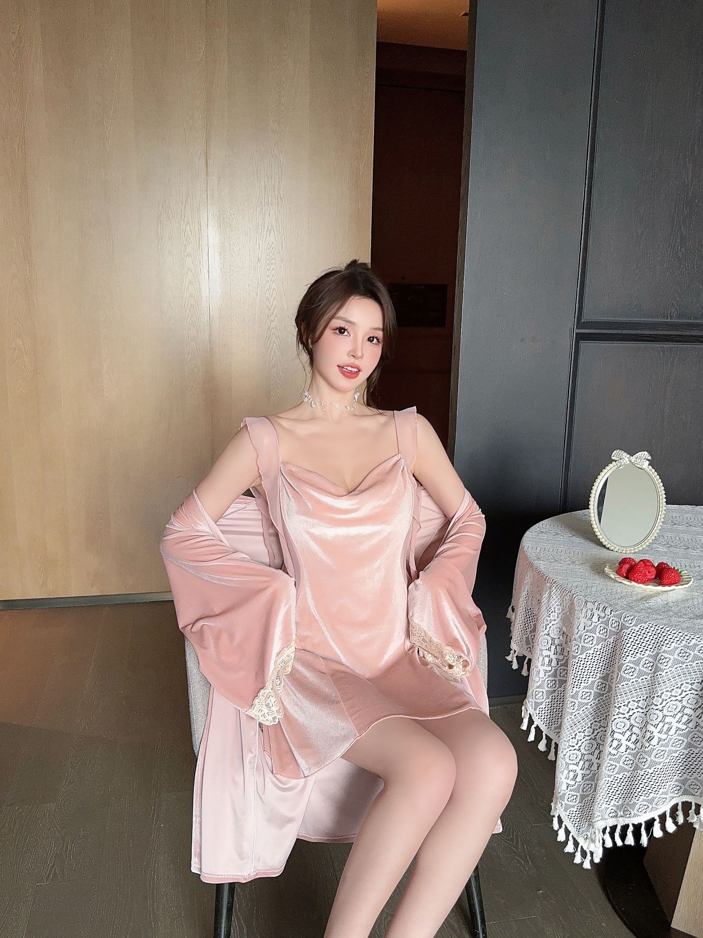 荡领性感睡衣女秋冬金丝绒带胸垫吊带睡裙睡袍纯欲风韩国绒家居服