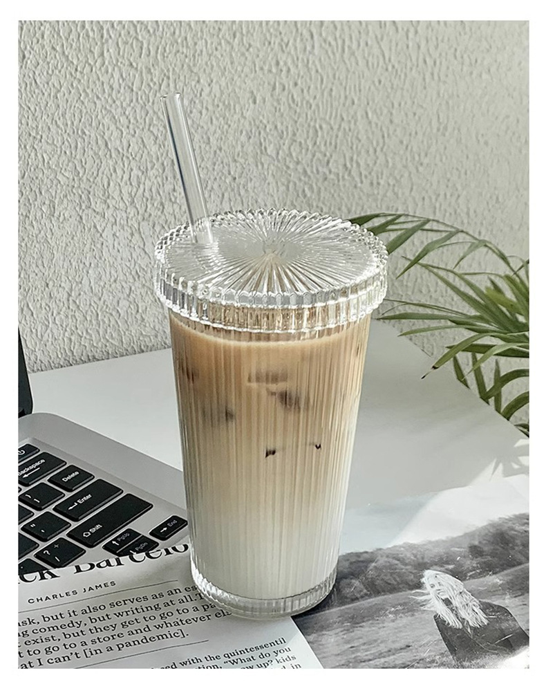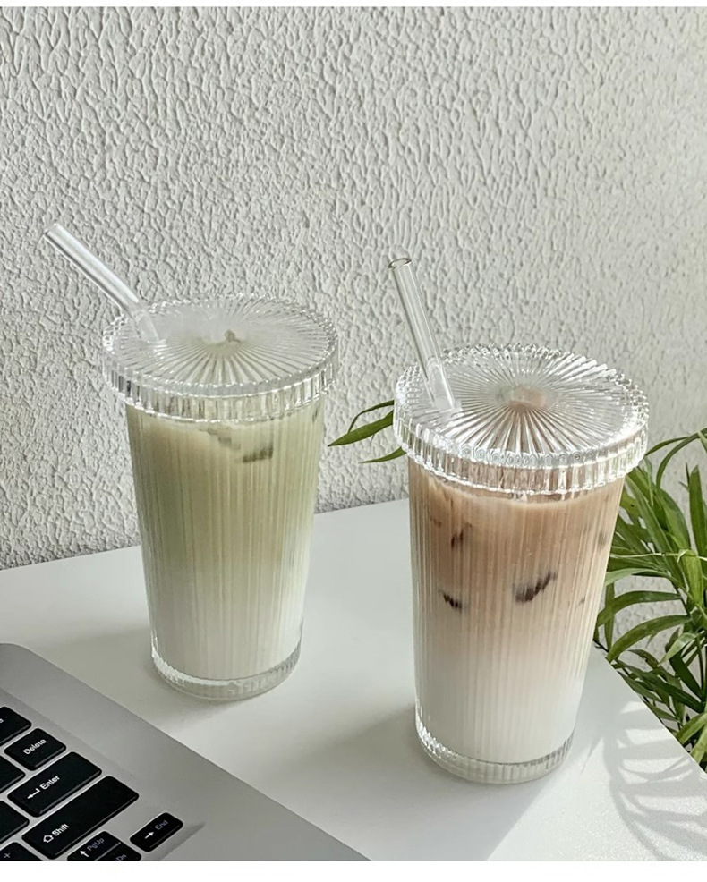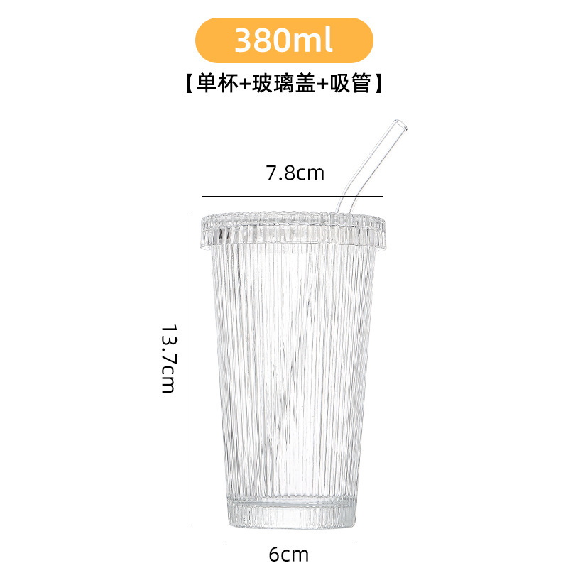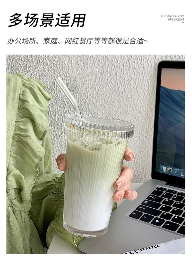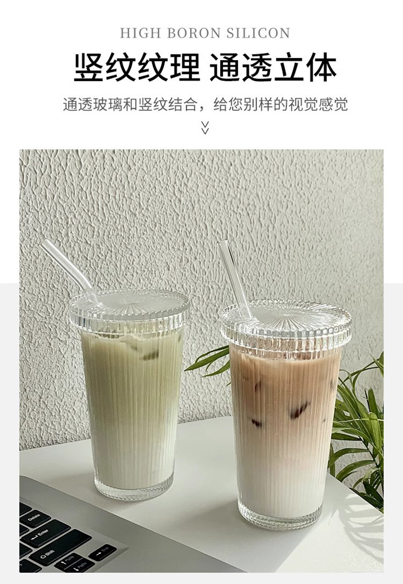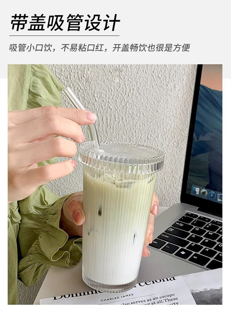 跨境 ins风简约竖条纹玻璃带盖吸管杯高颜值果汁牛奶咖啡饮料冷杯
