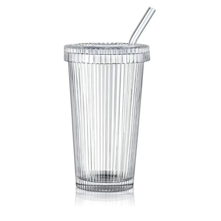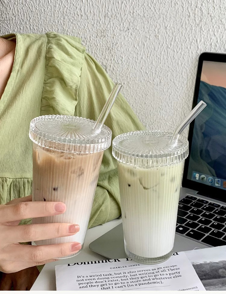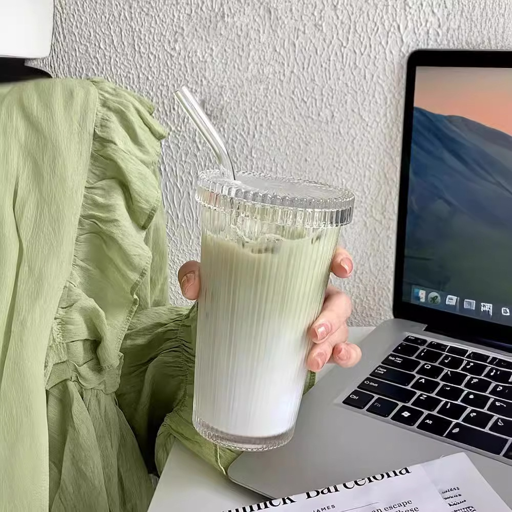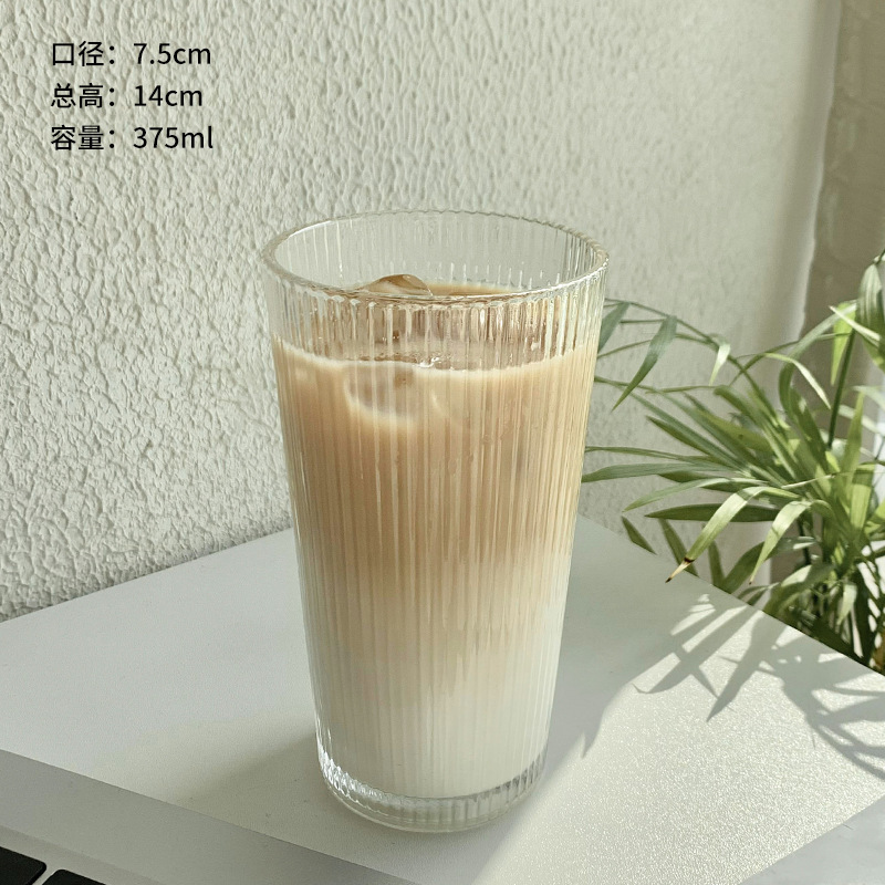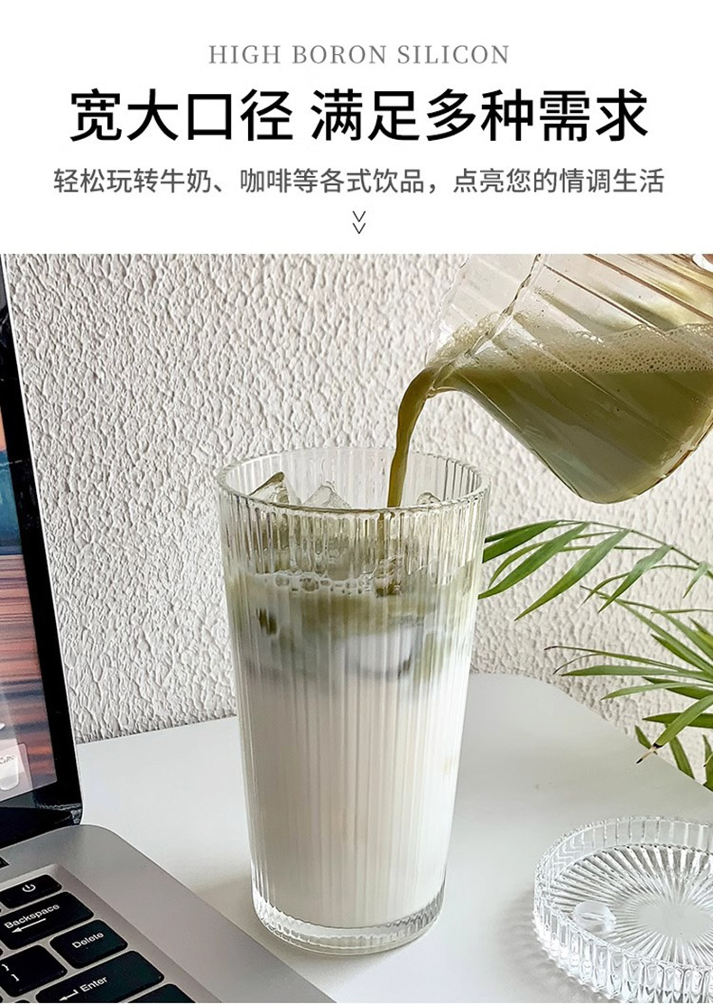 跨境 ins风简约竖条纹玻璃带盖吸管杯高颜值果汁牛奶咖啡饮料冷杯