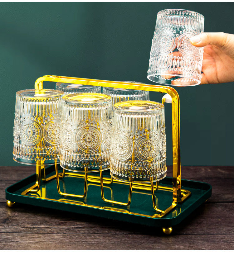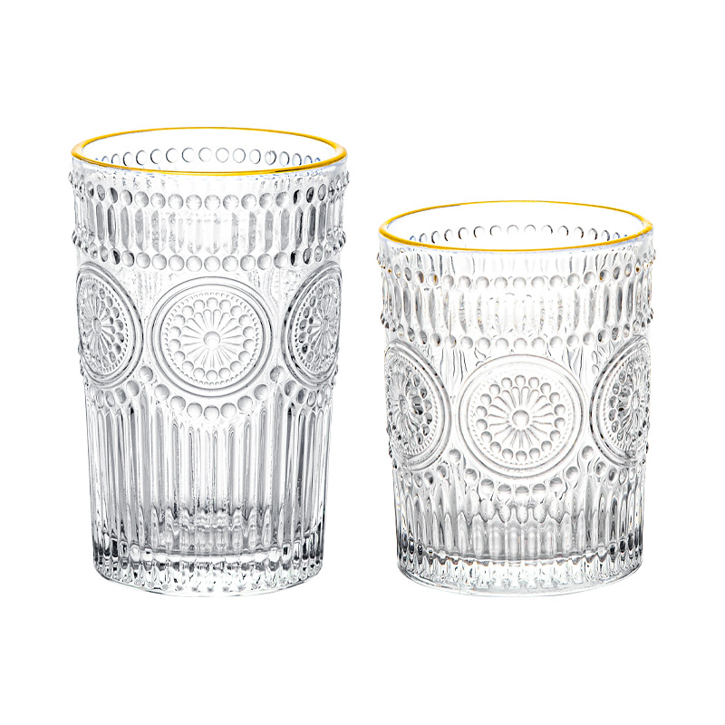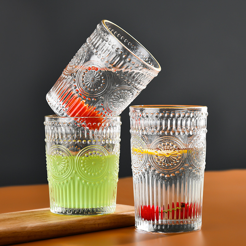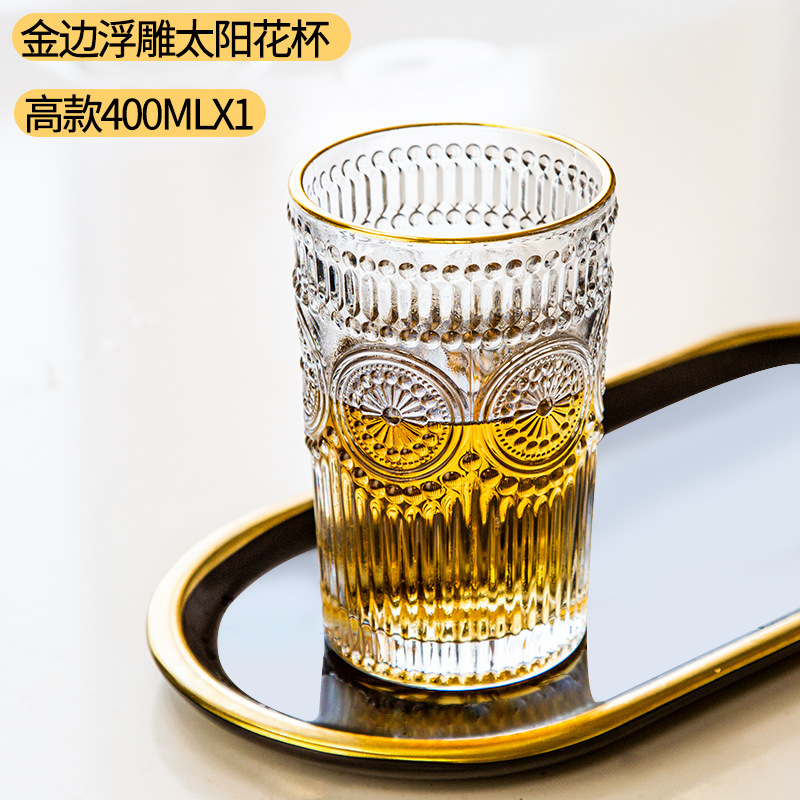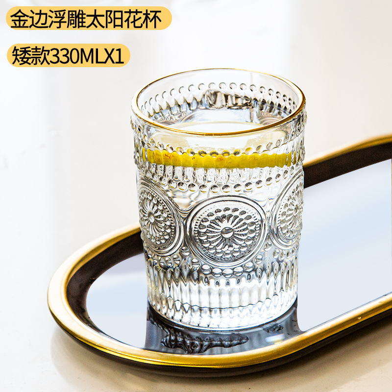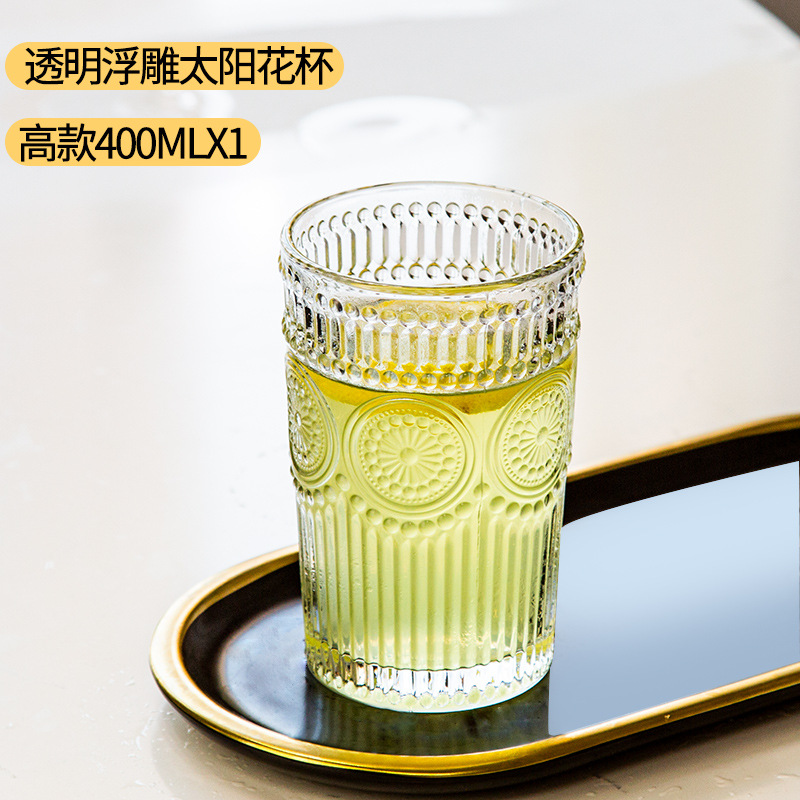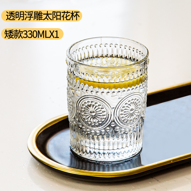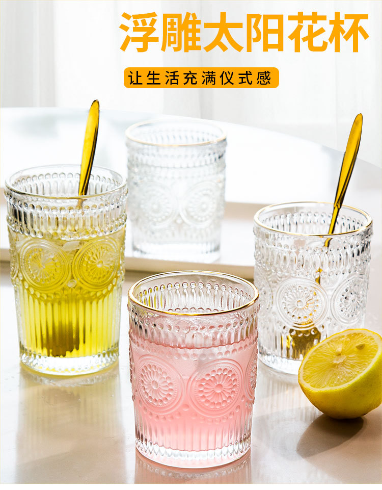 太阳花水杯浮雕透明玻璃杯创意家用办公室欧式复古果汁饮料牛奶杯