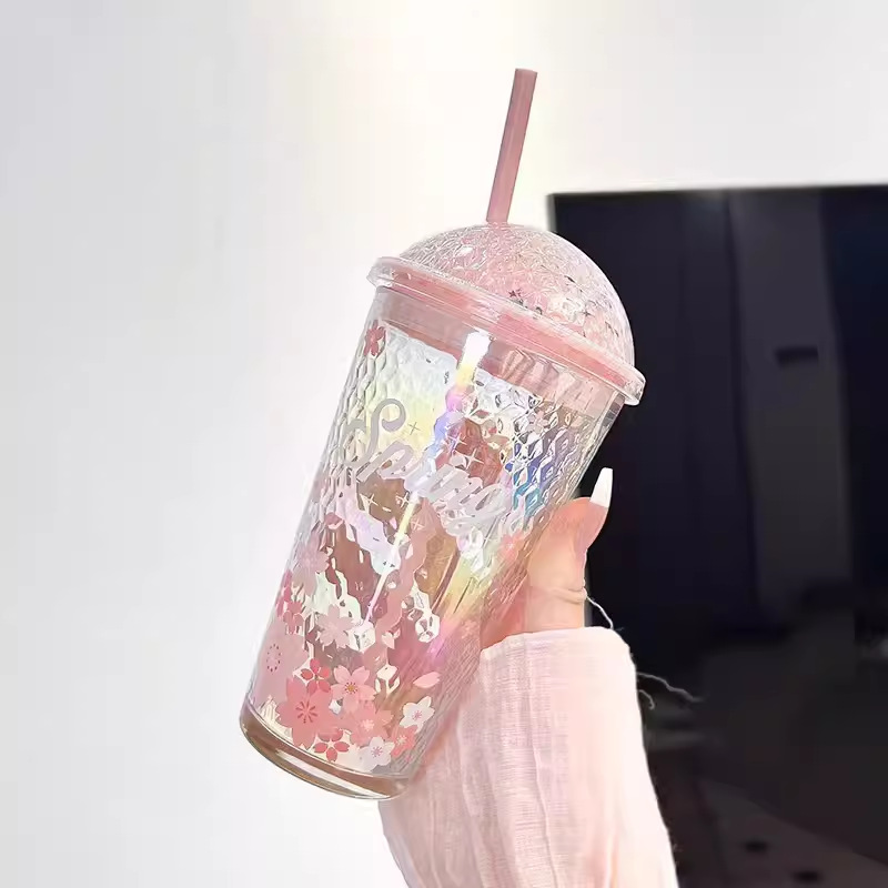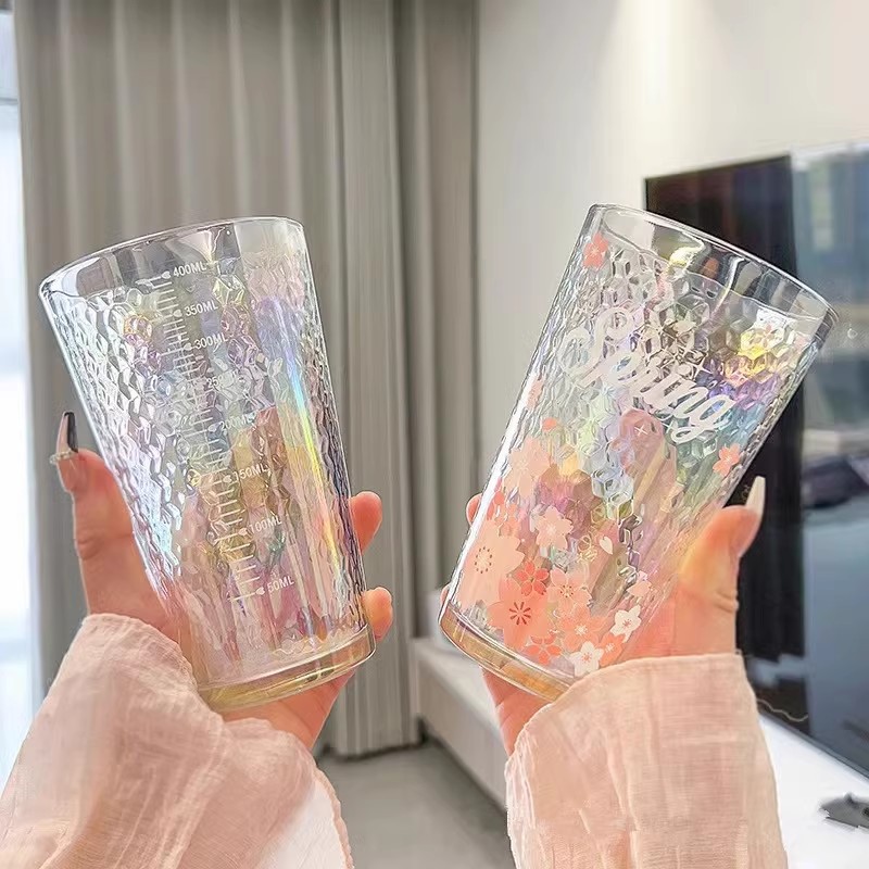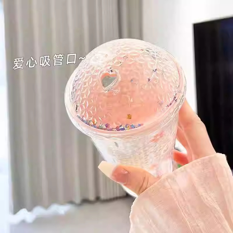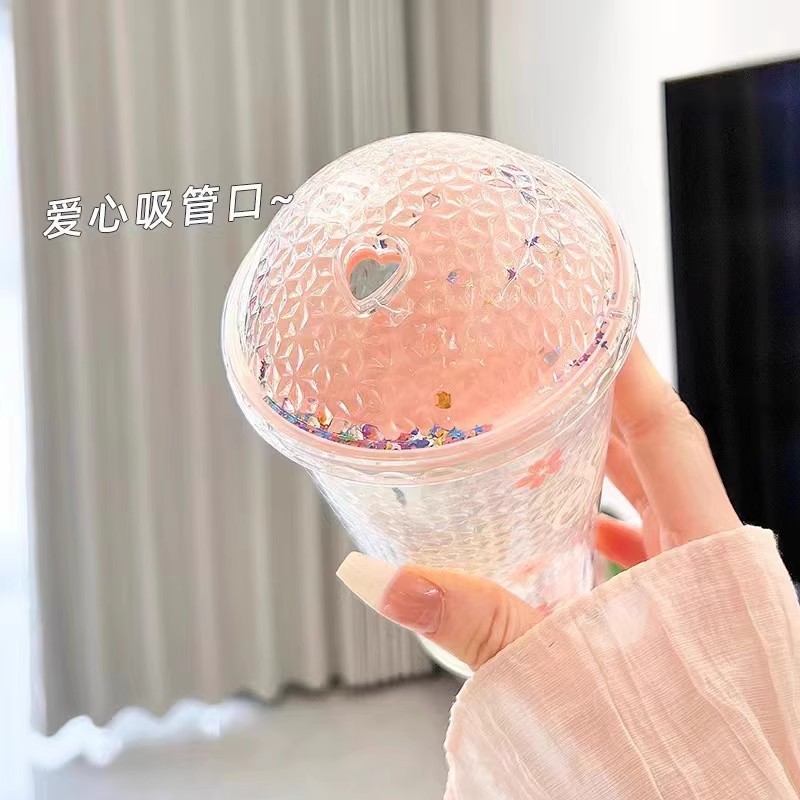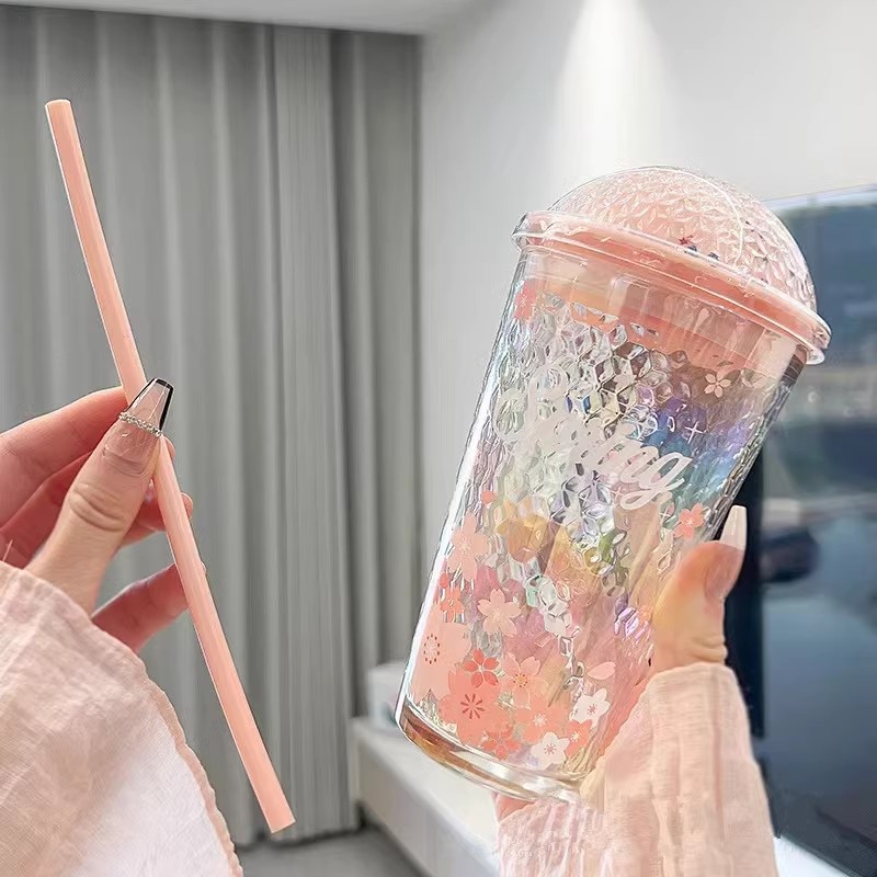 樱花玻璃杯星空水杯带盖带吸管牛奶杯ins高颜值女神杯牛奶咖啡杯