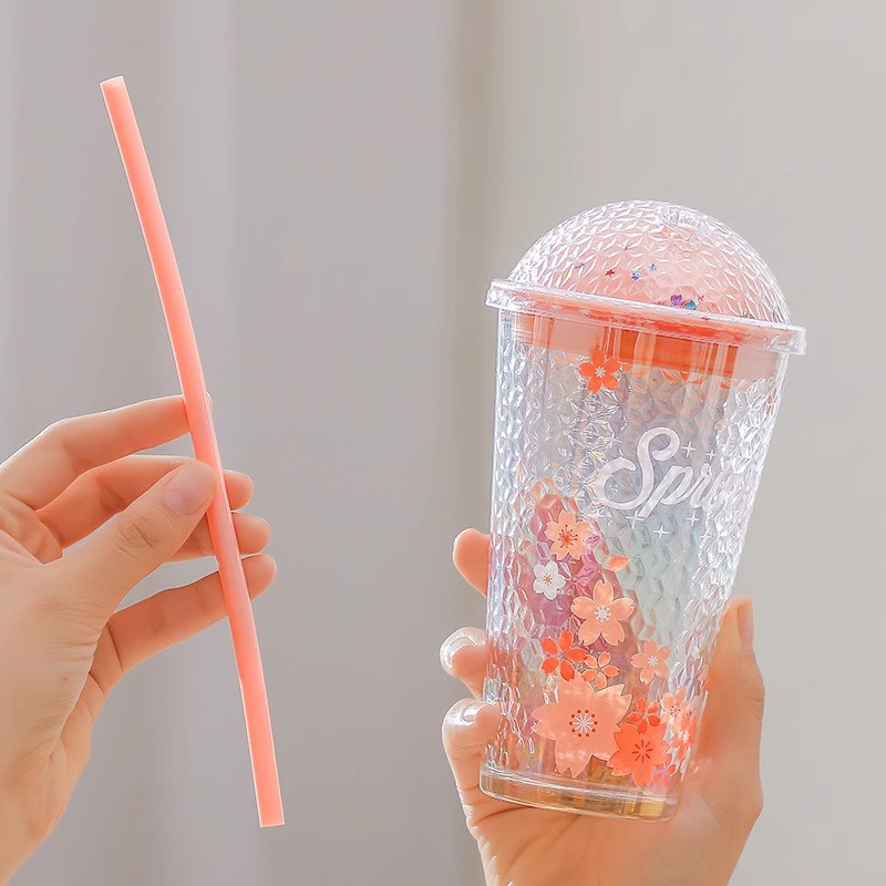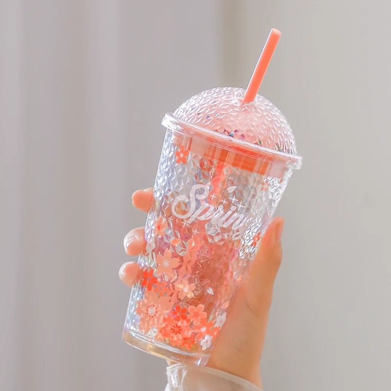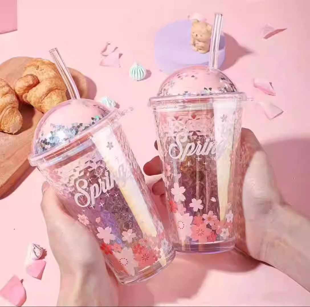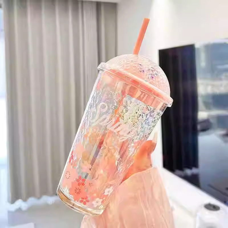 樱花玻璃杯星空水杯带盖带吸管牛奶杯ins高颜值女神杯牛奶咖啡杯