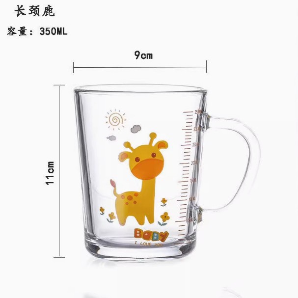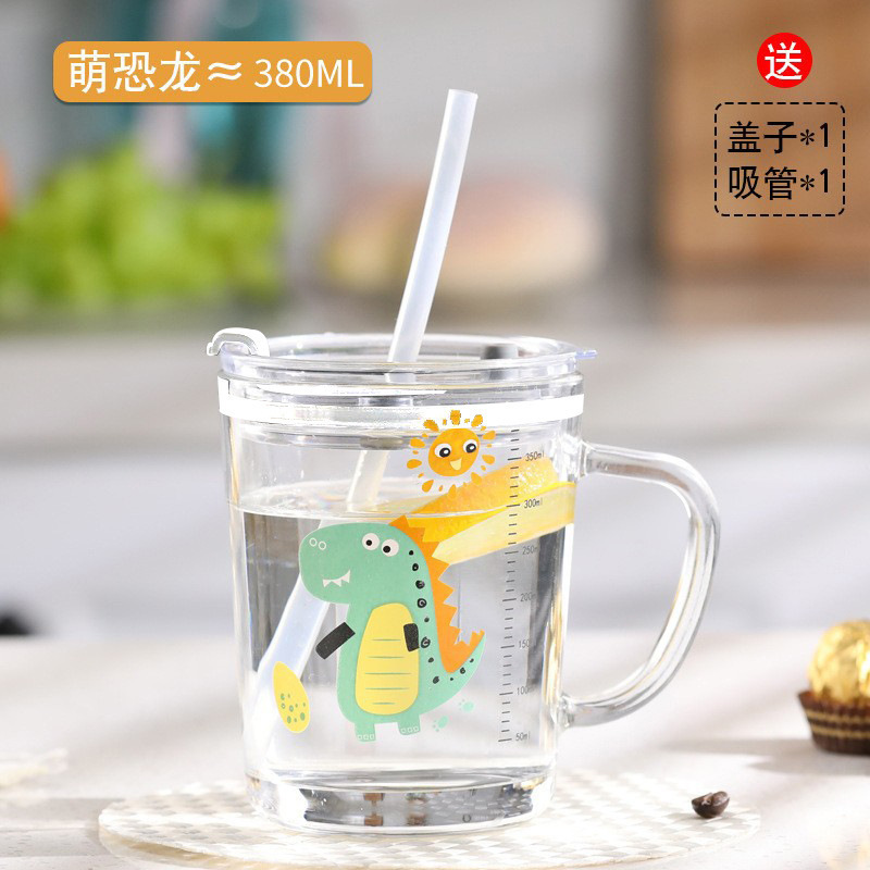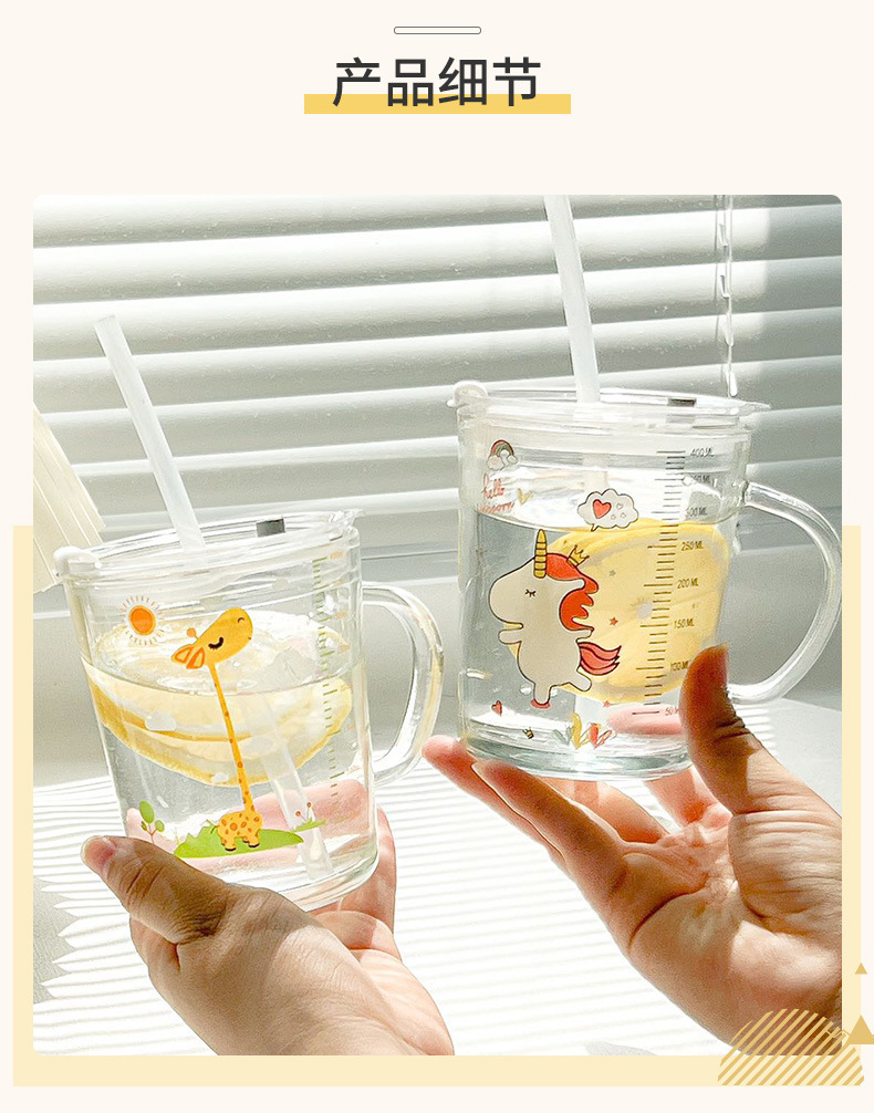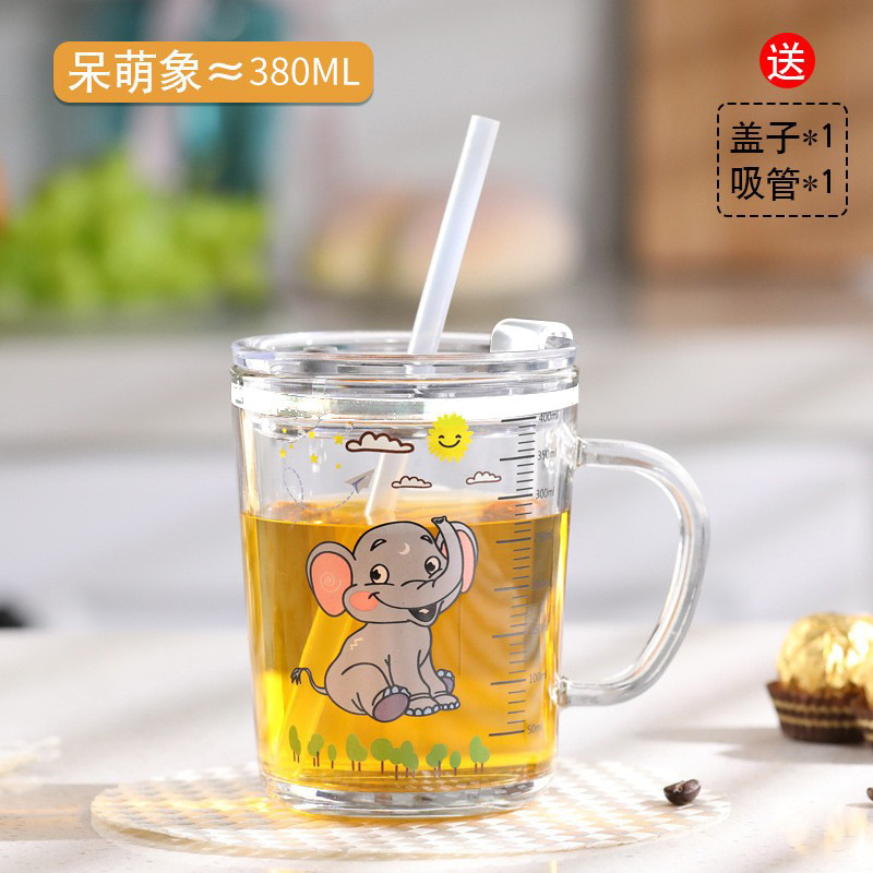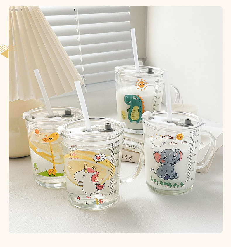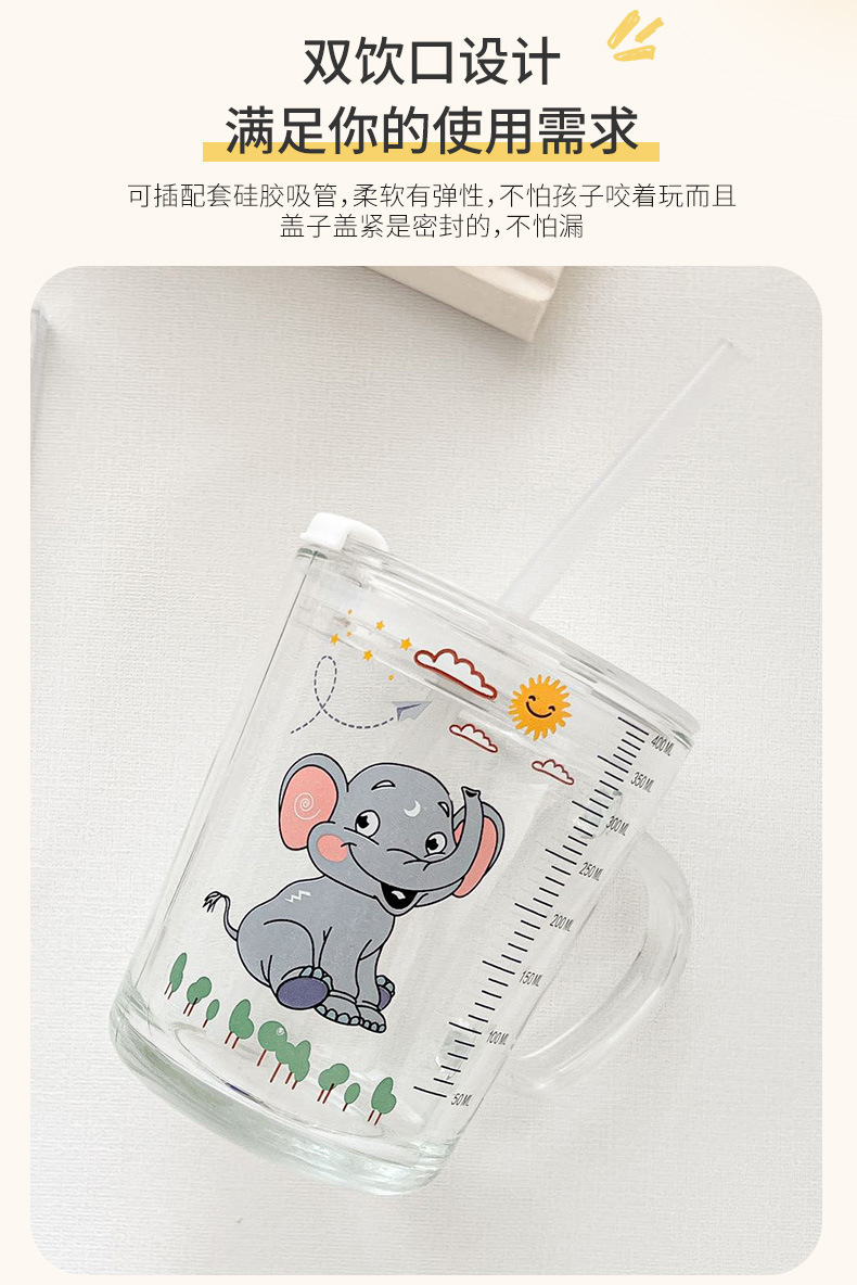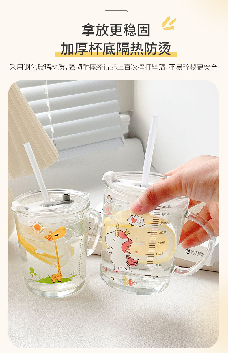 卡通玻璃杯吸管杯家用儿童牛奶早餐杯水杯创意带把刻度水杯把手杯