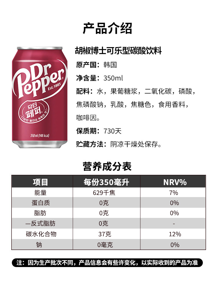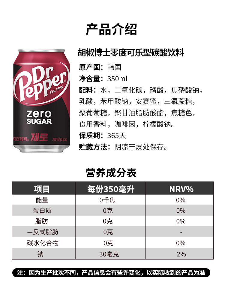韩国进口DRPEPPER胡椒博士汽水原味可乐零度可乐碳酸饮料350ml