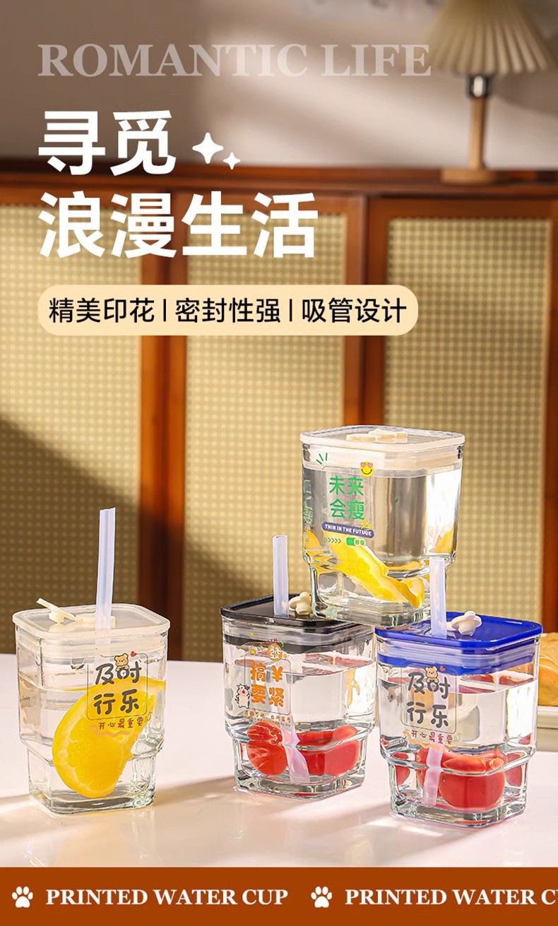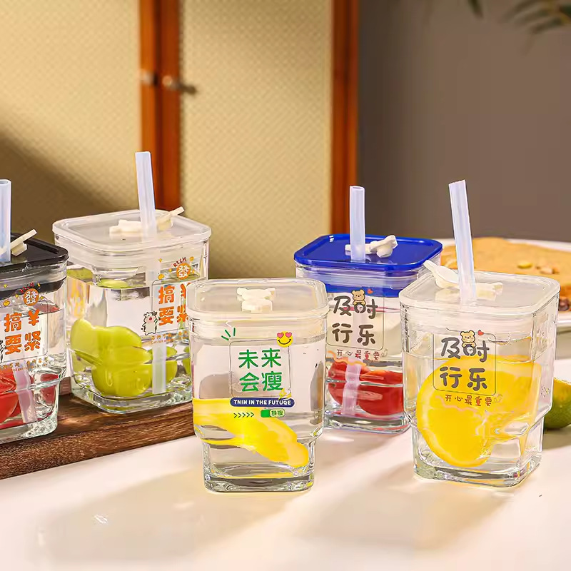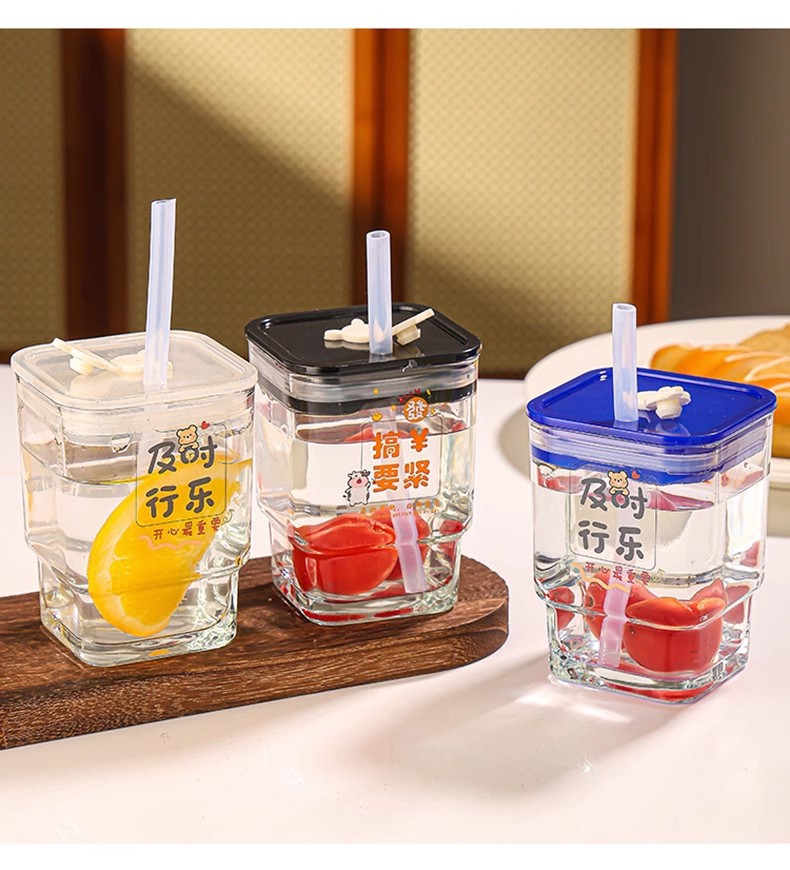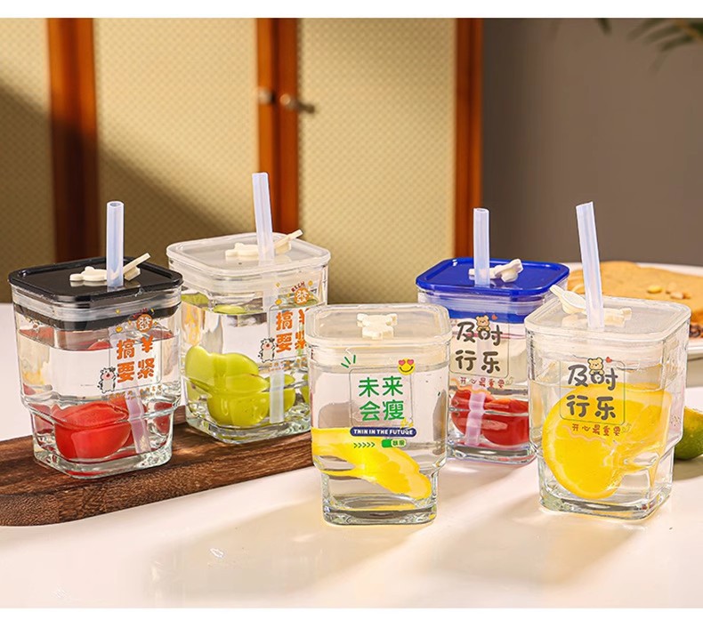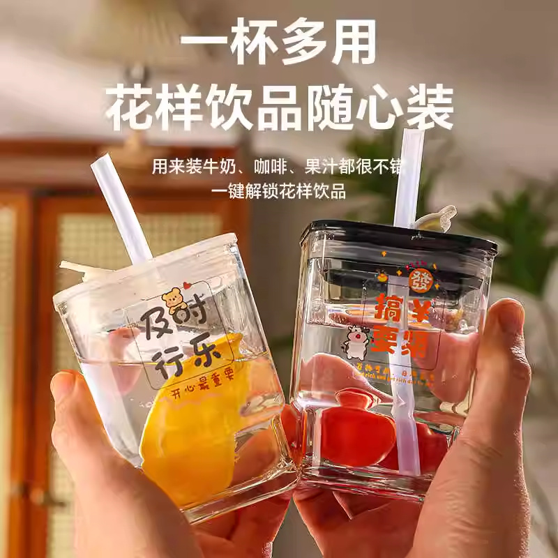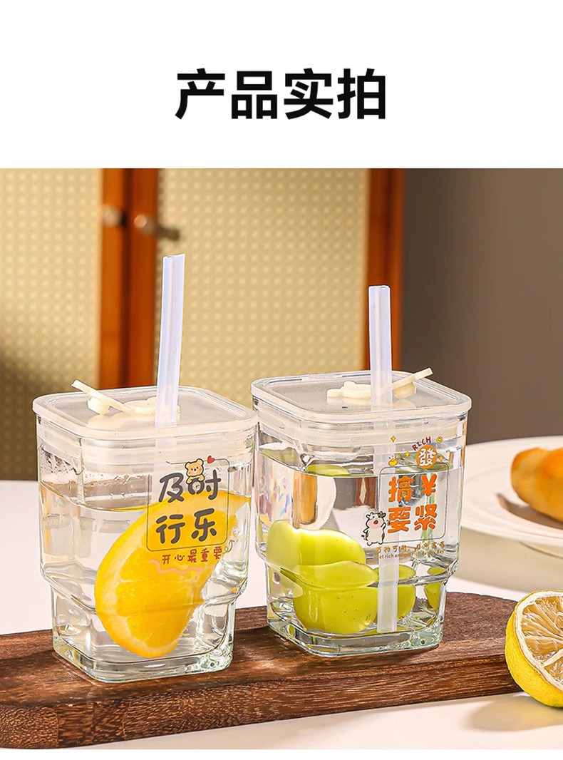 高颜值吸管杯方形玻璃水杯创意玻璃杯办公室家用双饮杯伴手礼杯子