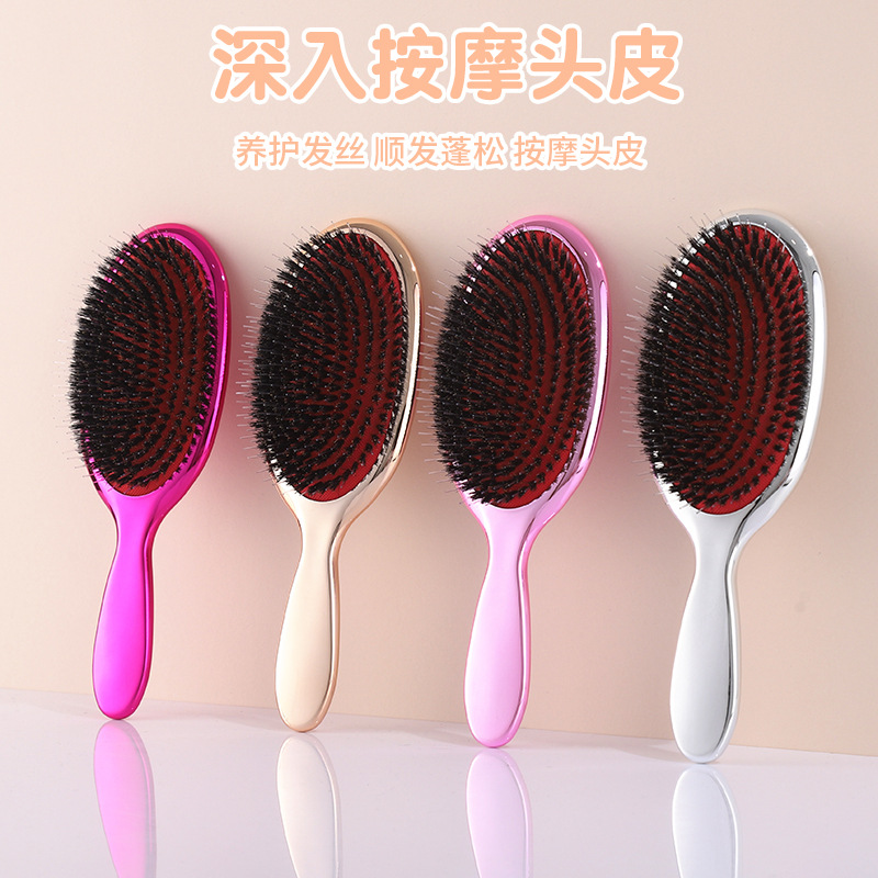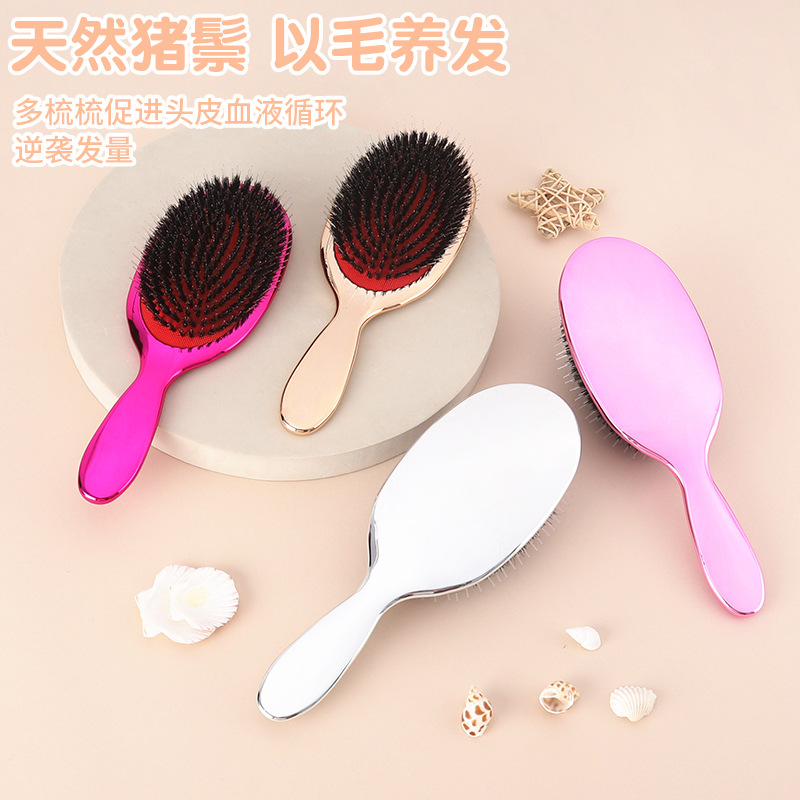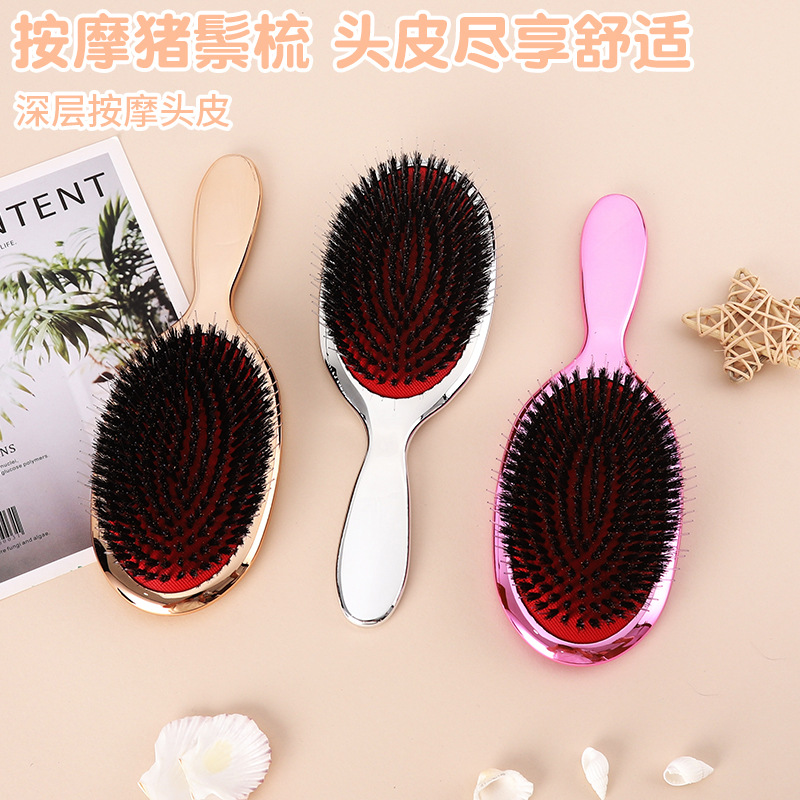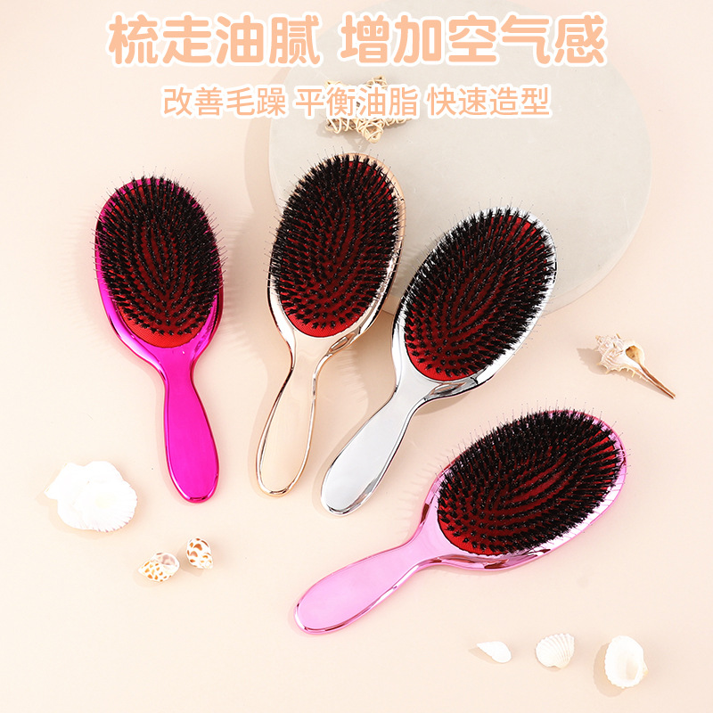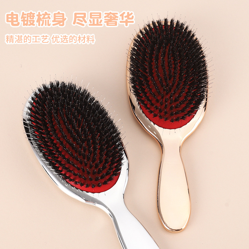 跨境专供电镀椭圆大号猪鬃毛梳美发顺发造型气垫梳头皮按摩梳子