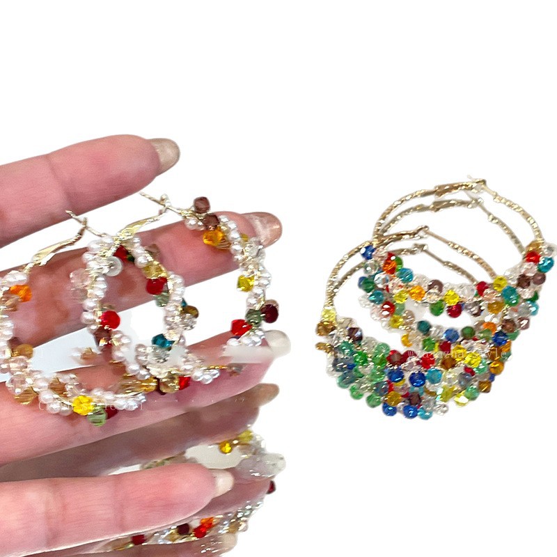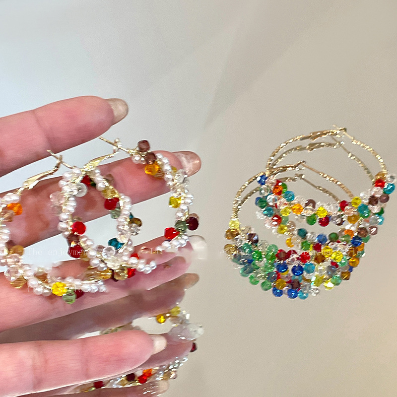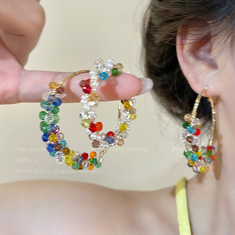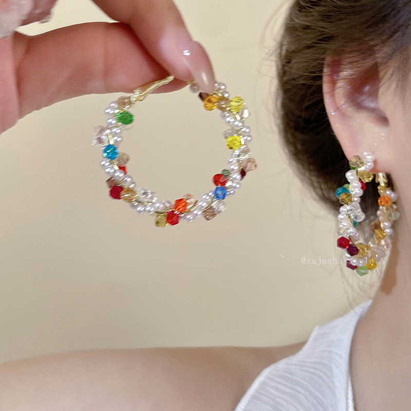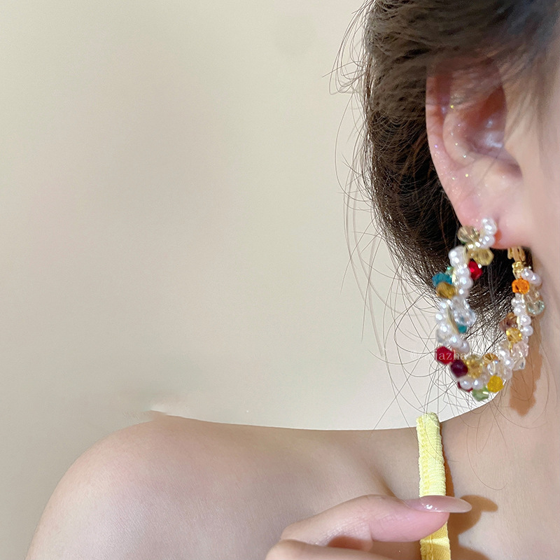 银针彩色玻璃珍珠缠绕耳圈多巴胺清新甜美气质耳环小众高级感耳饰