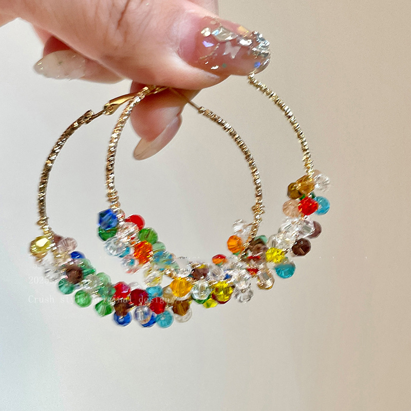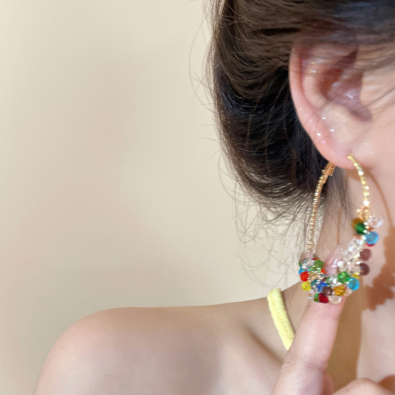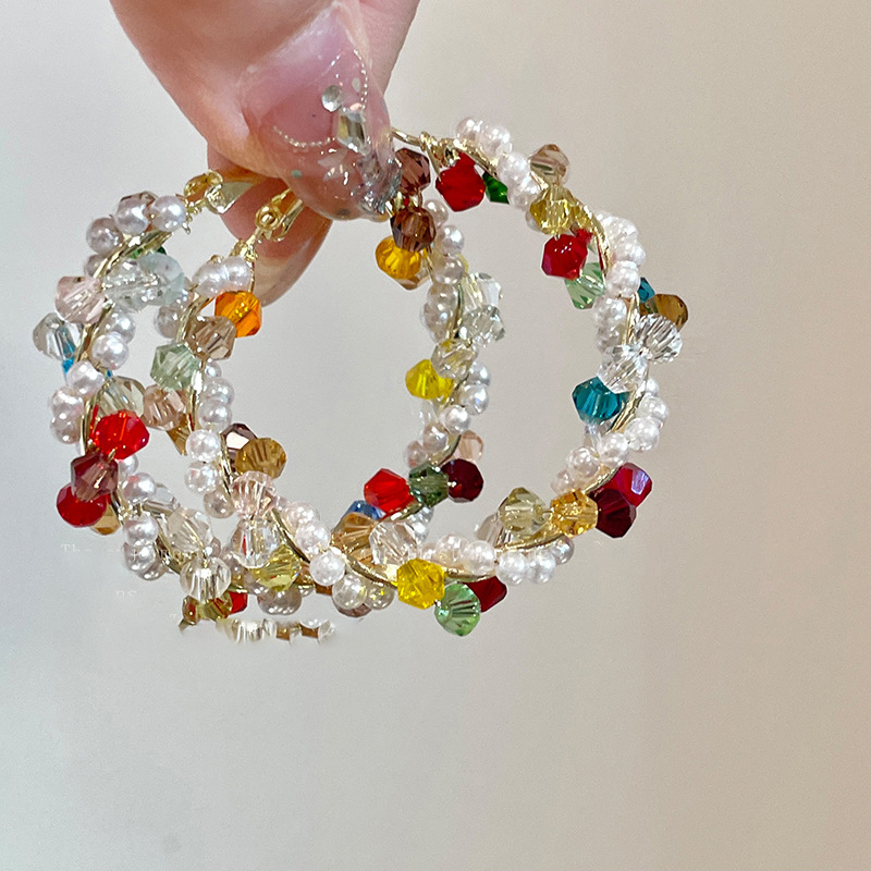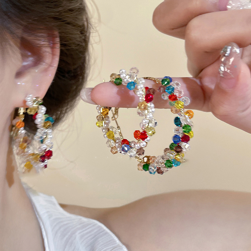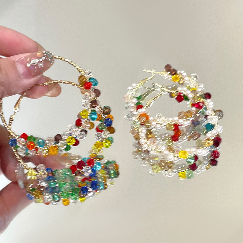 银针彩色玻璃珍珠缠绕耳圈多巴胺清新甜美气质耳环小众高级感耳饰