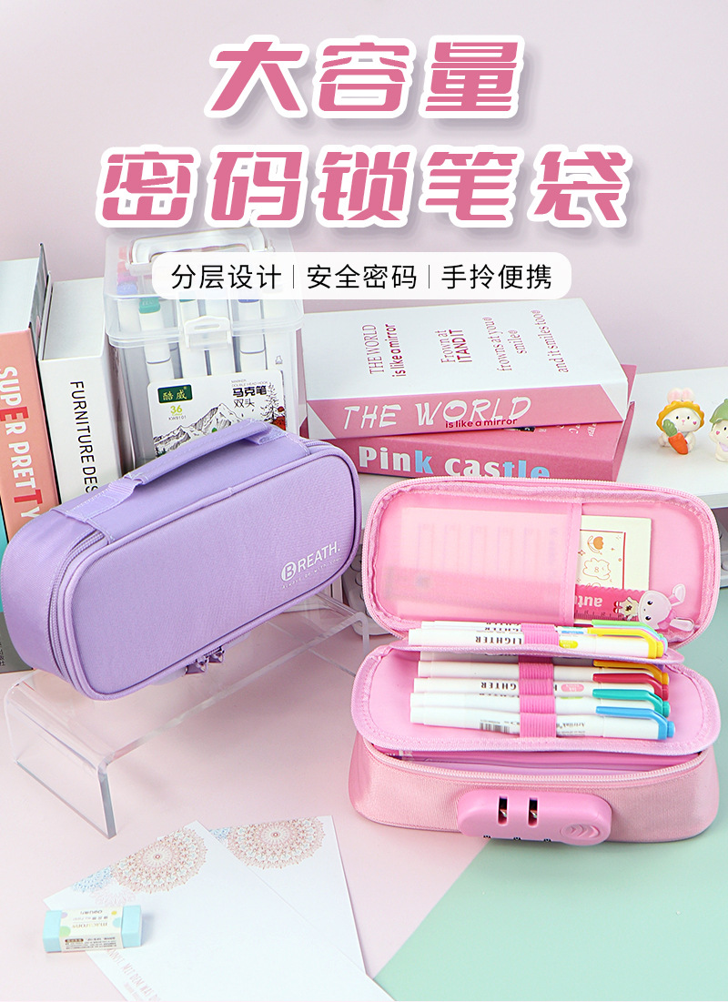 外贸跨境中小学生简约帆布笔袋手提文具袋大容量多层密码锁笔盒