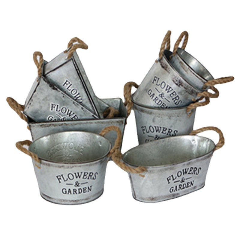 新款花桶手提麻绳铁皮桶批发欧式创意复古花盆鲜花店花盆多肉花盆