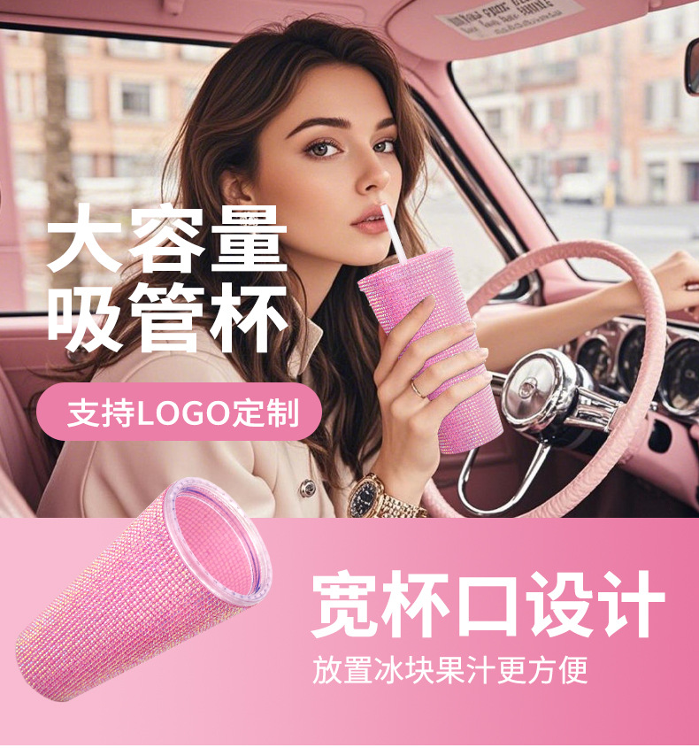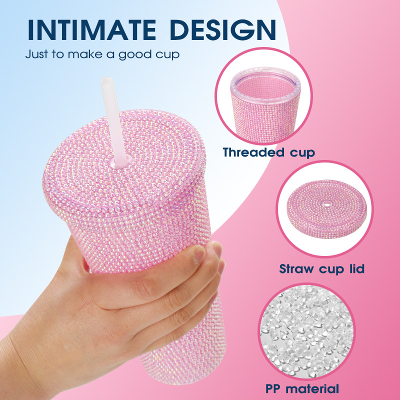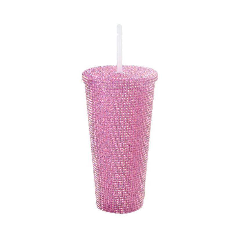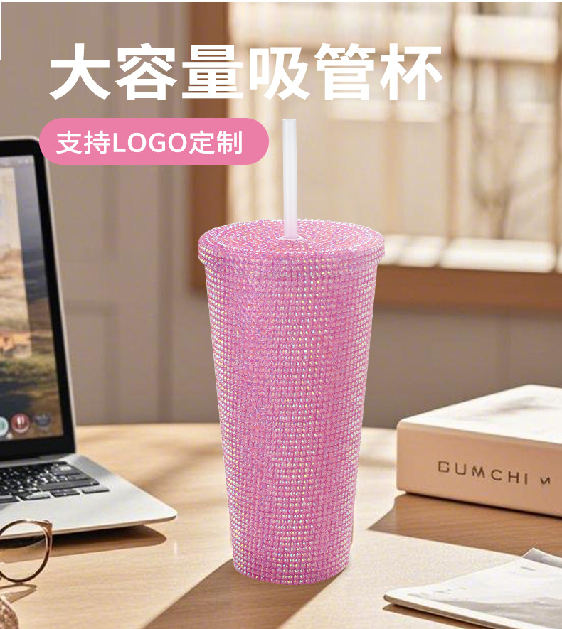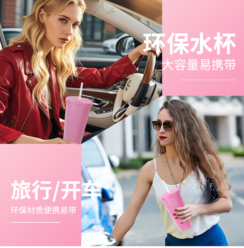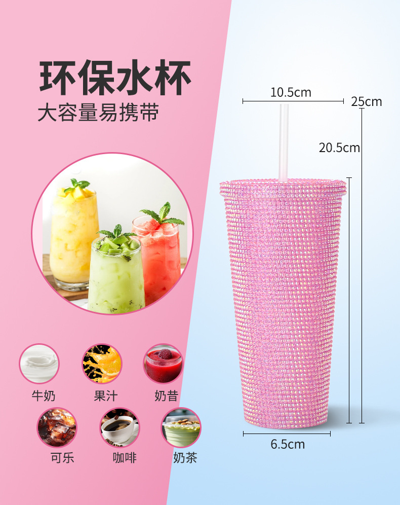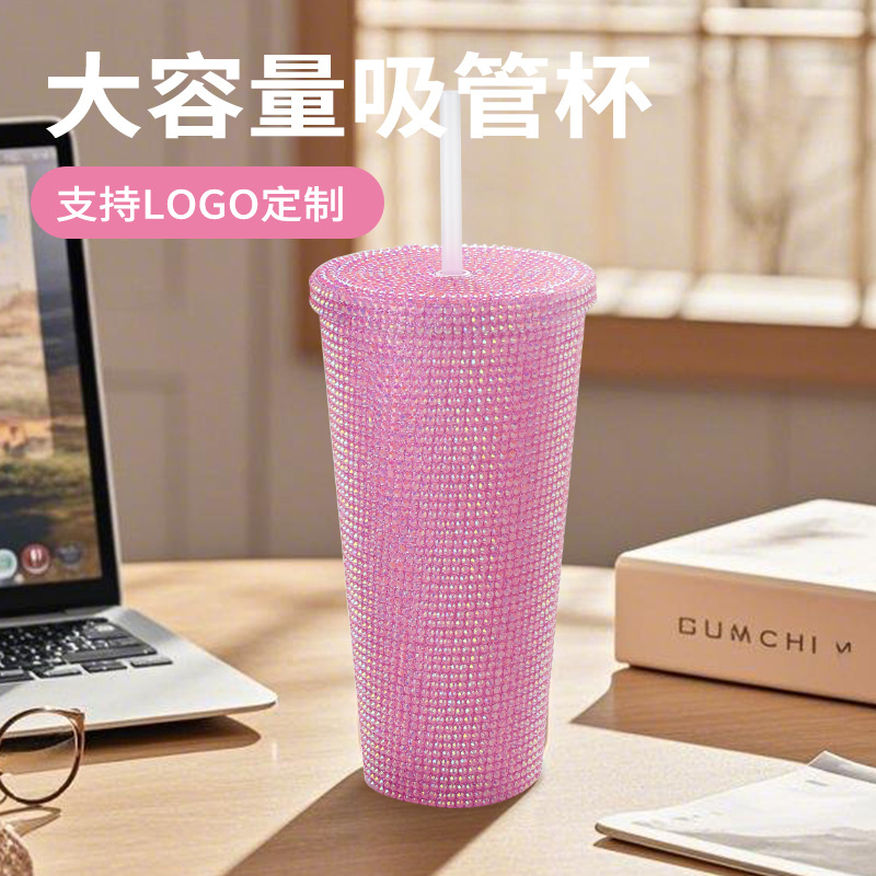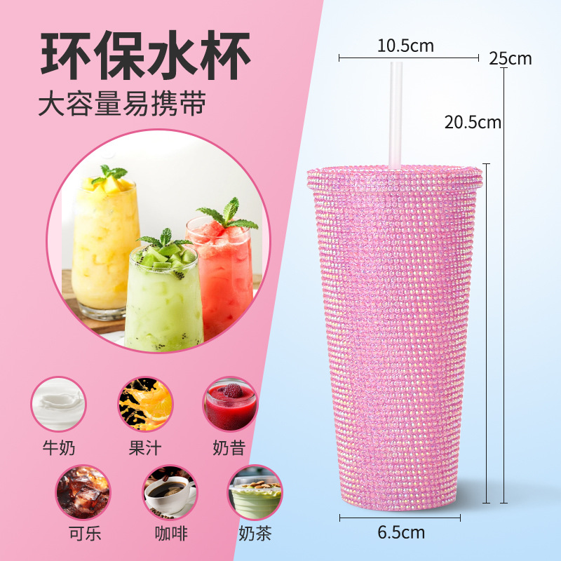 欧美亚马逊厂家货源双层钻石水杯高颜值手工贴钻杯塑料吸管杯批发