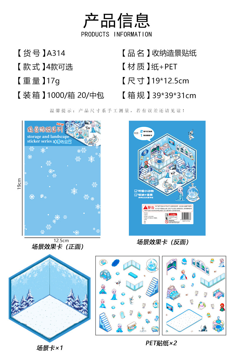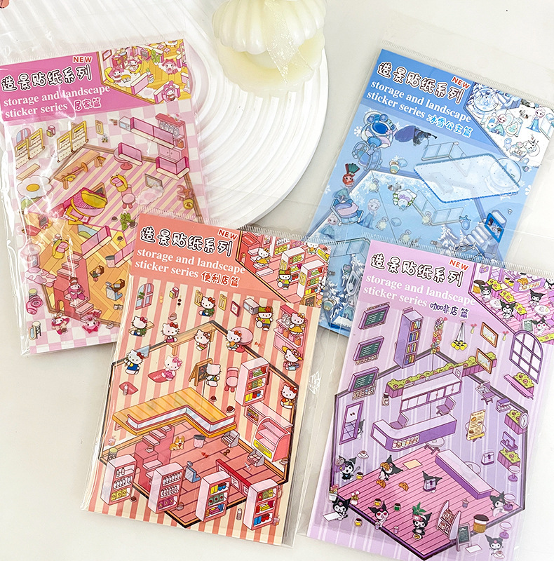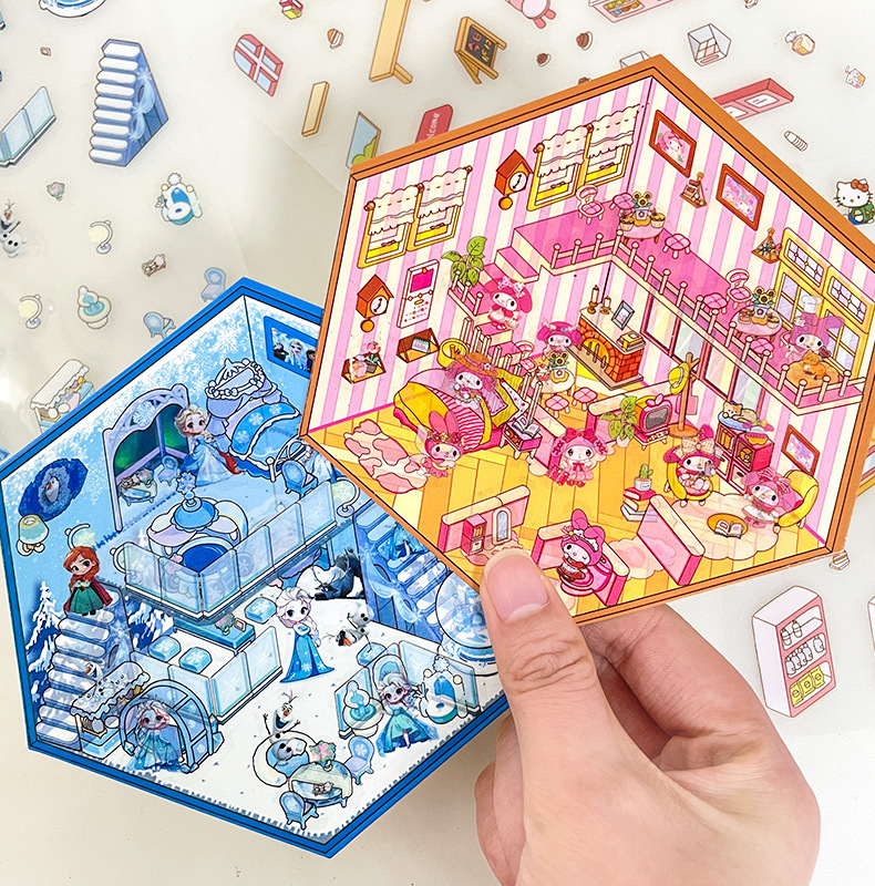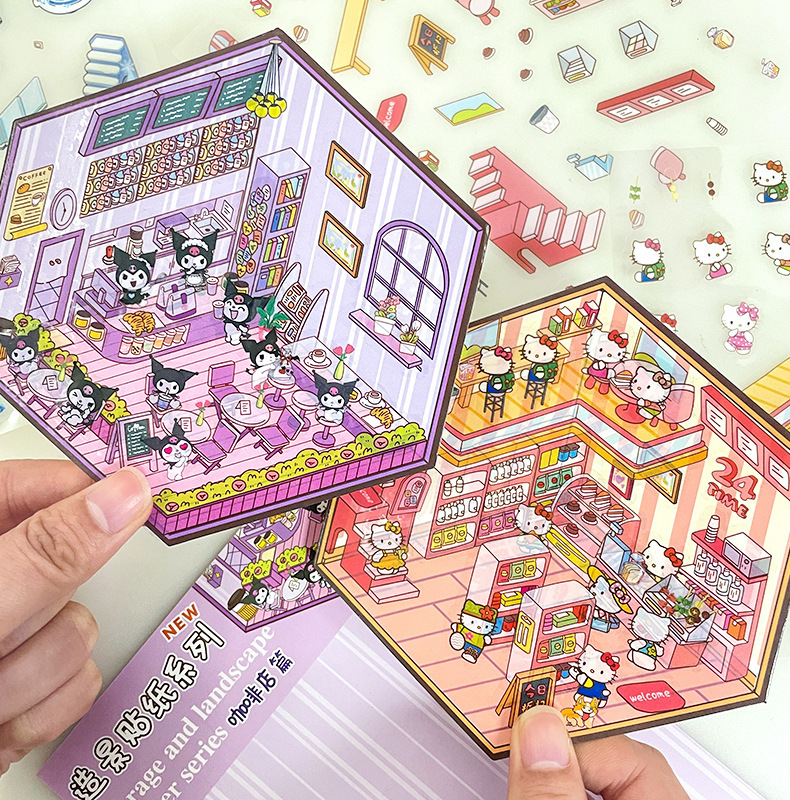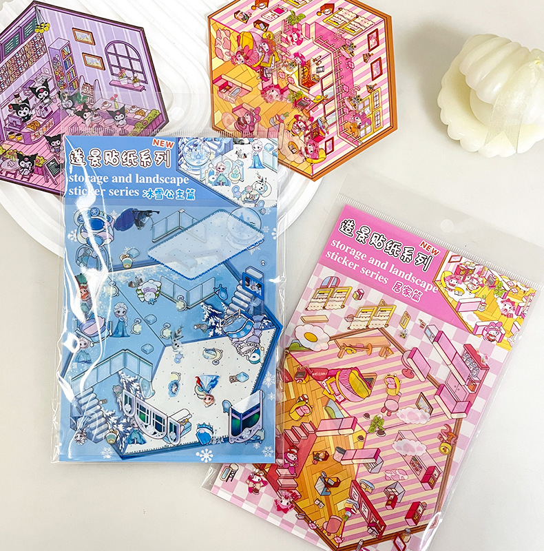 新款卡通造景贴纸韩系风可爱3D立体小屋潮流解压造景场景手账贴纸