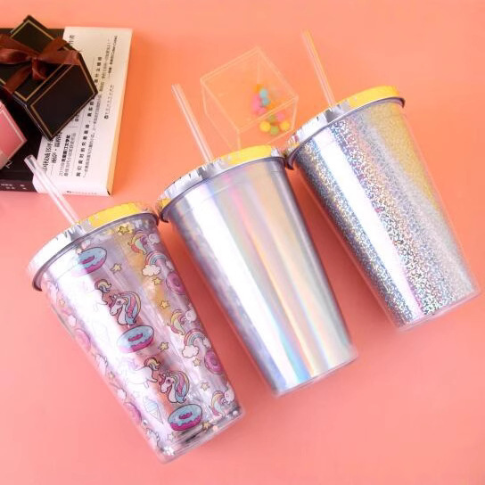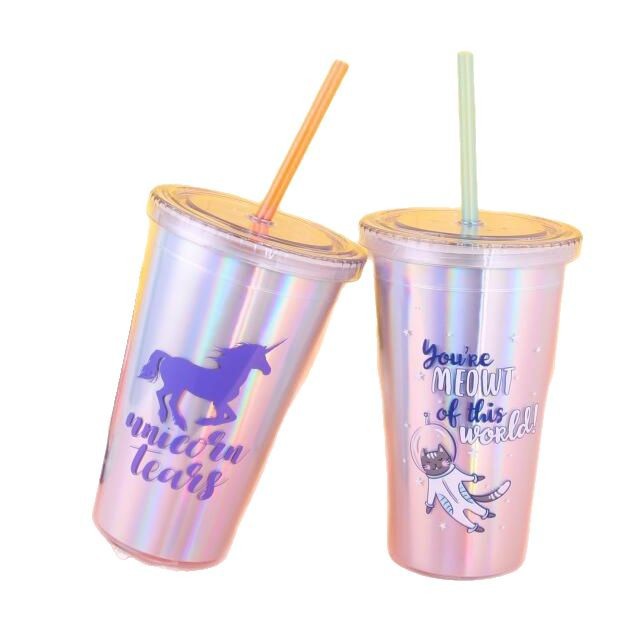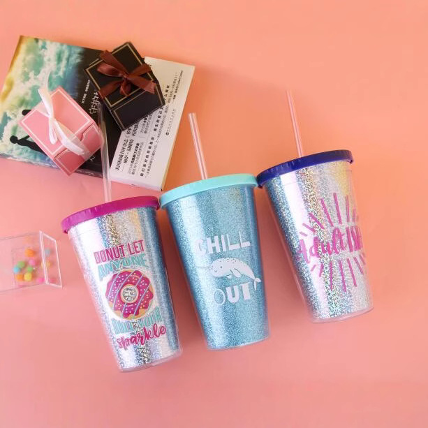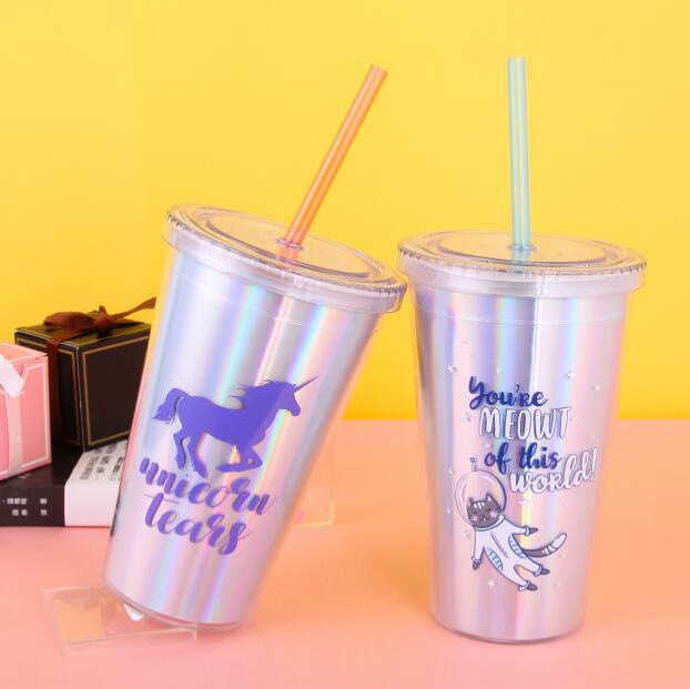 网红吸管杯双层塑料吸管杯16OZ创意果汁饮料杯可再生RAS奶茶水杯