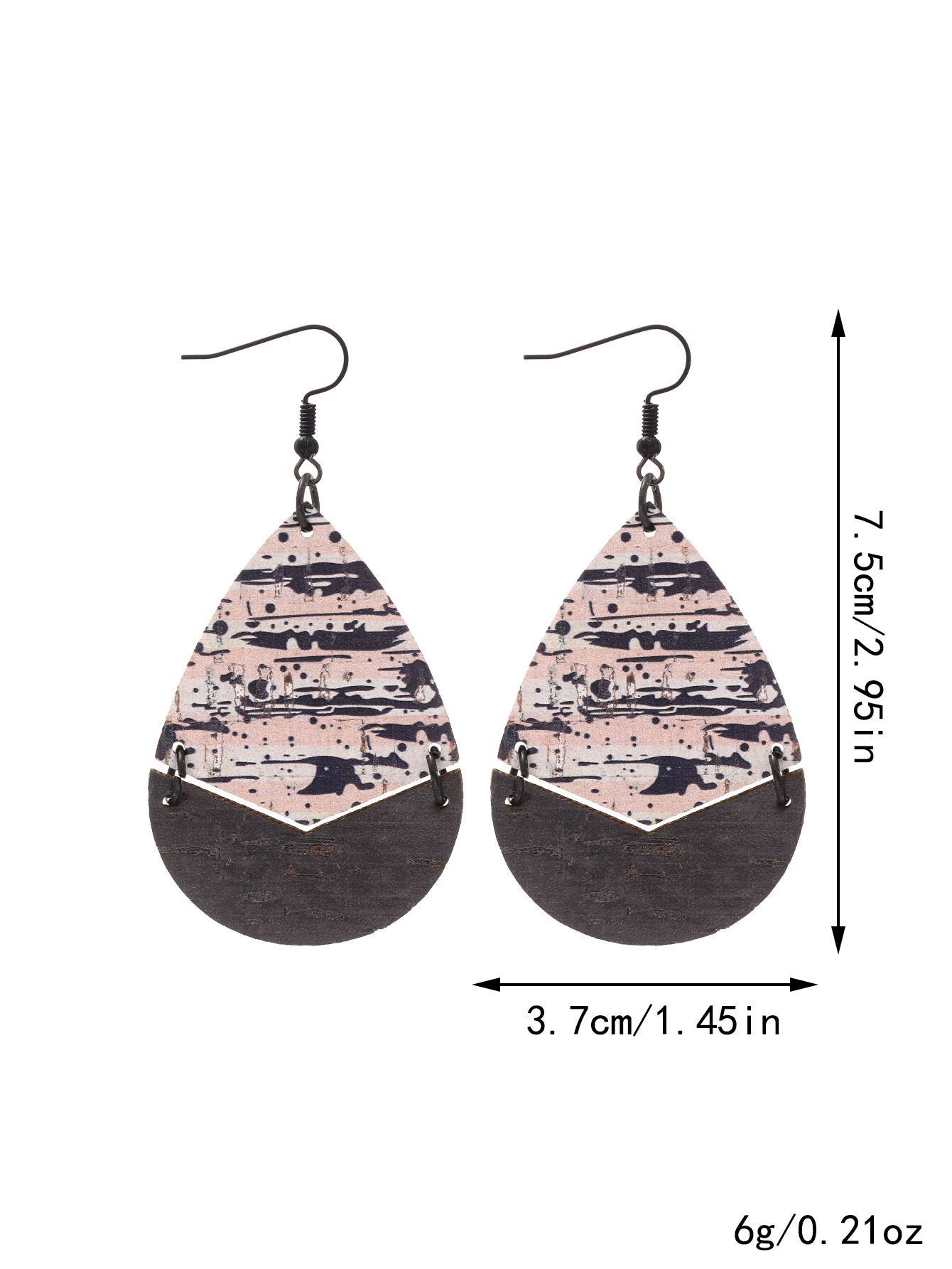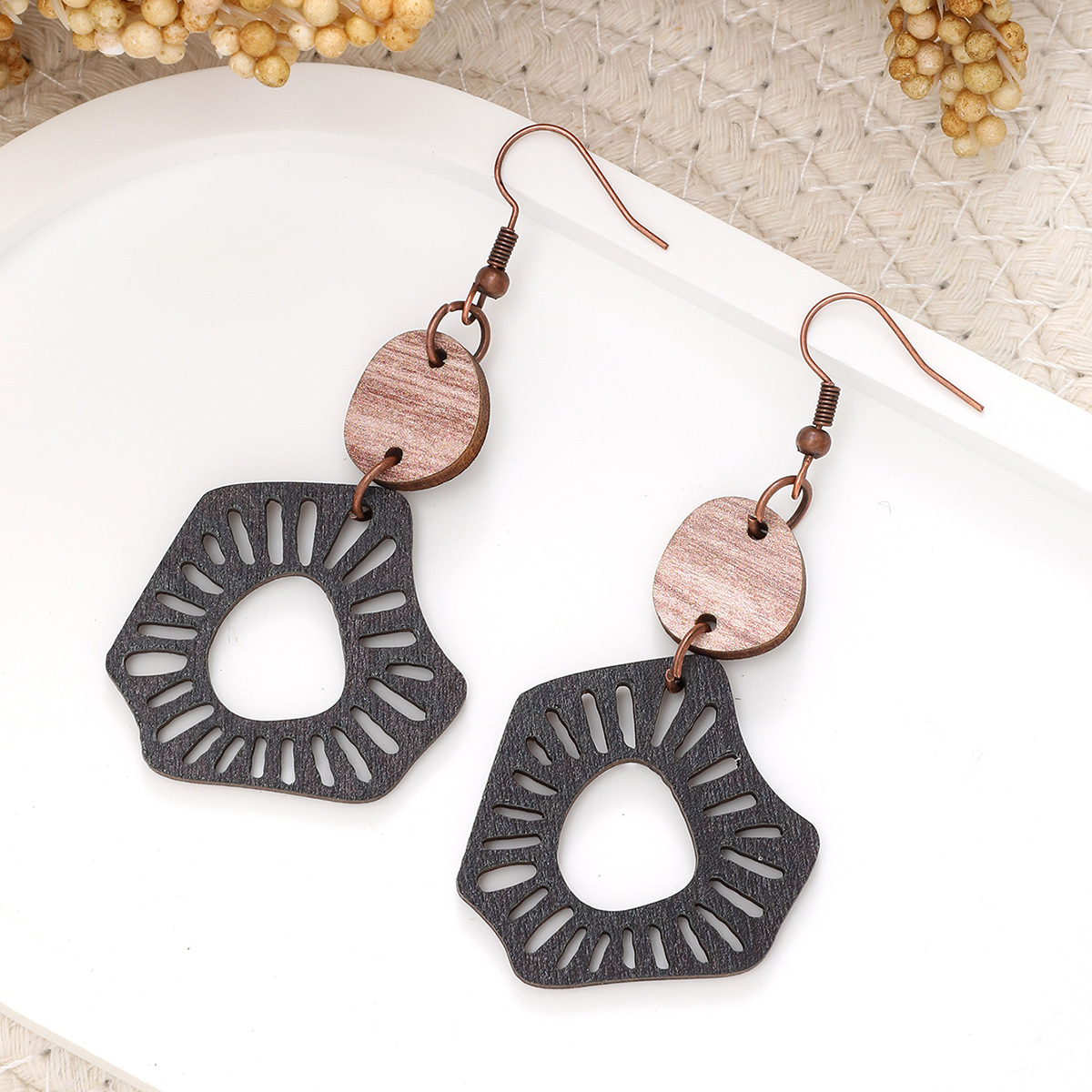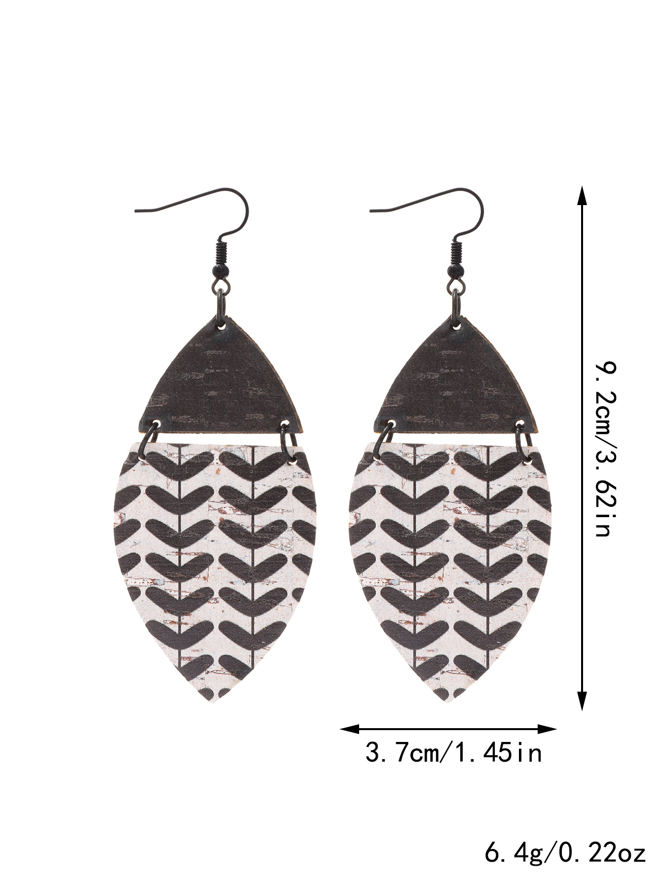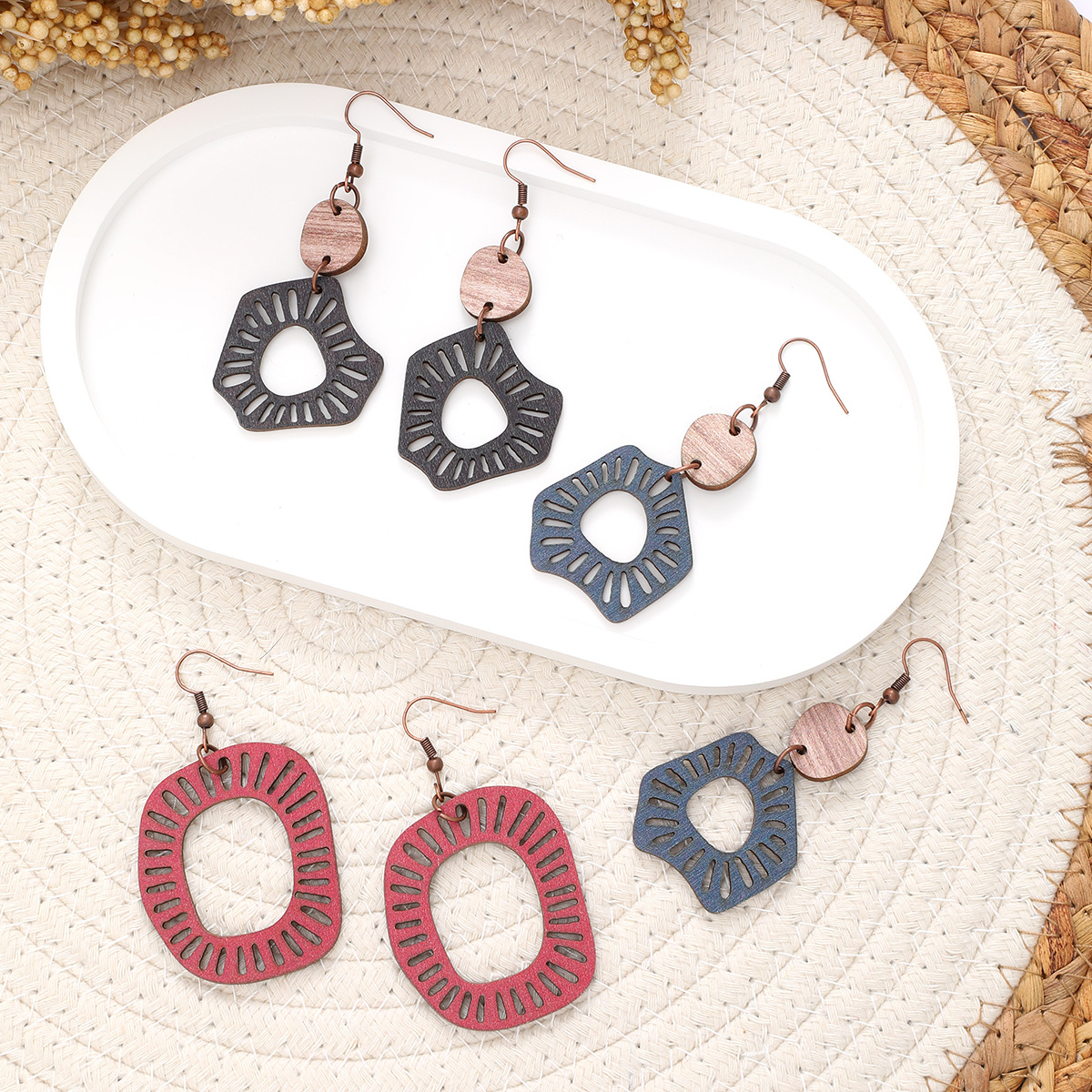 新款复古波西米亚风镂空印花PU木质耳环欧美时尚个性拼接耳坠耳