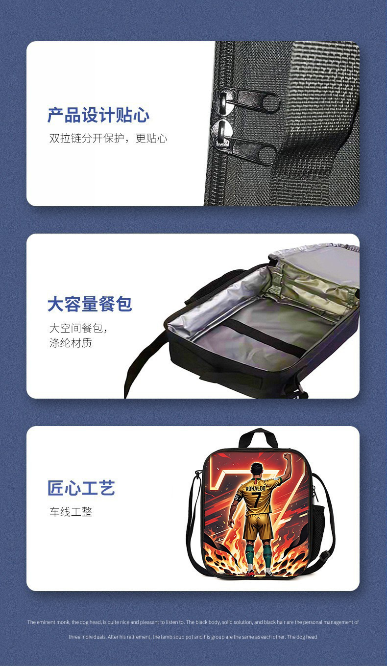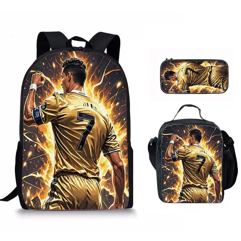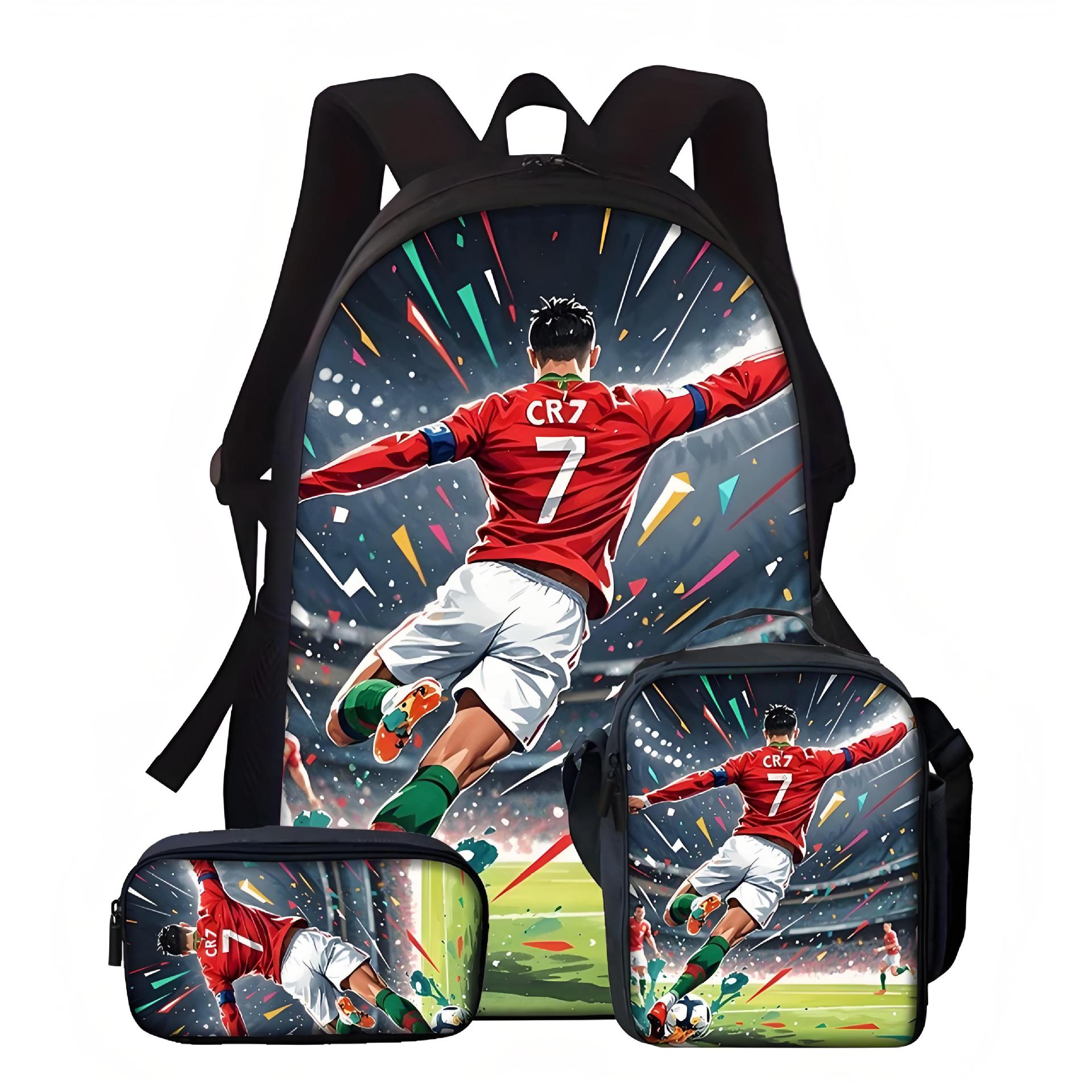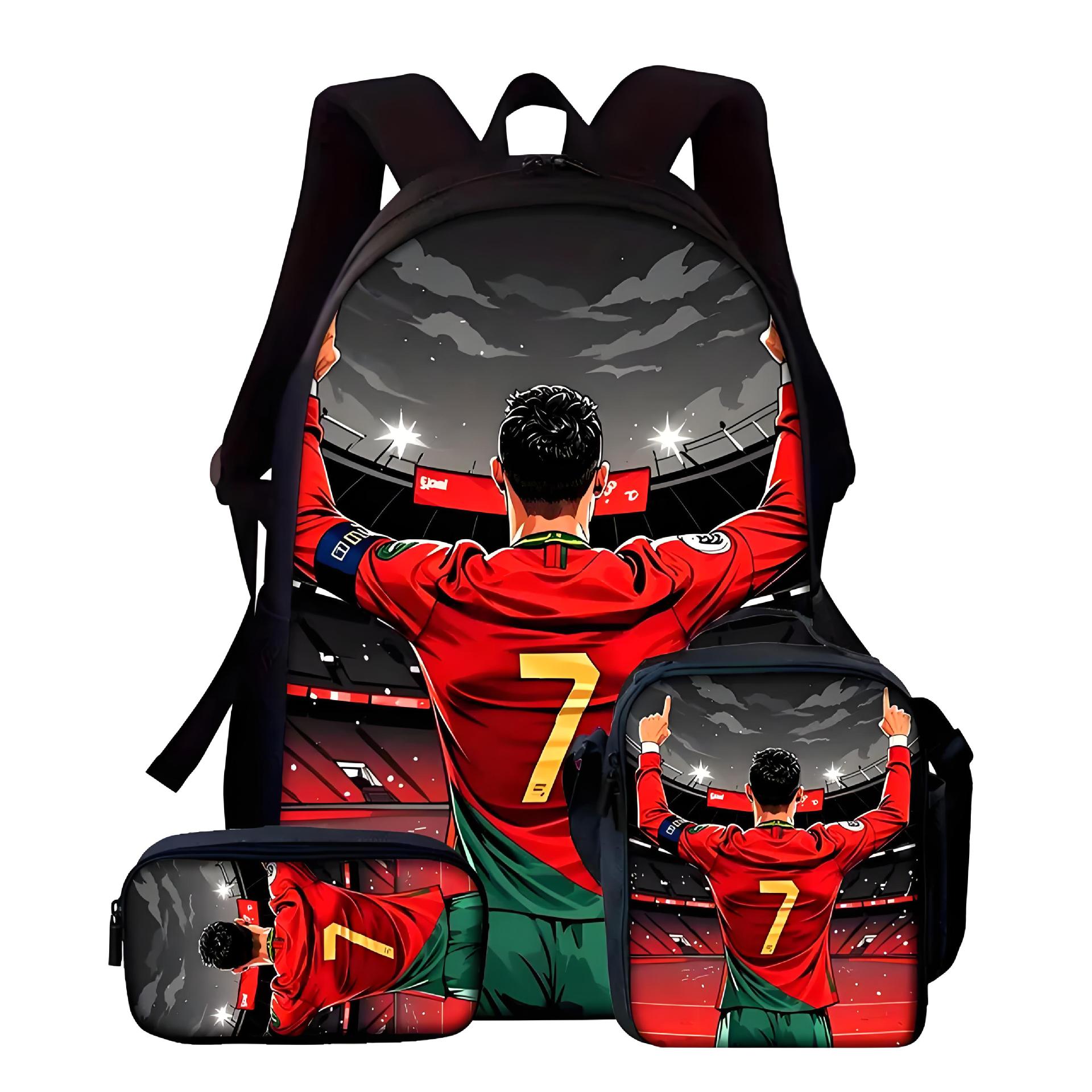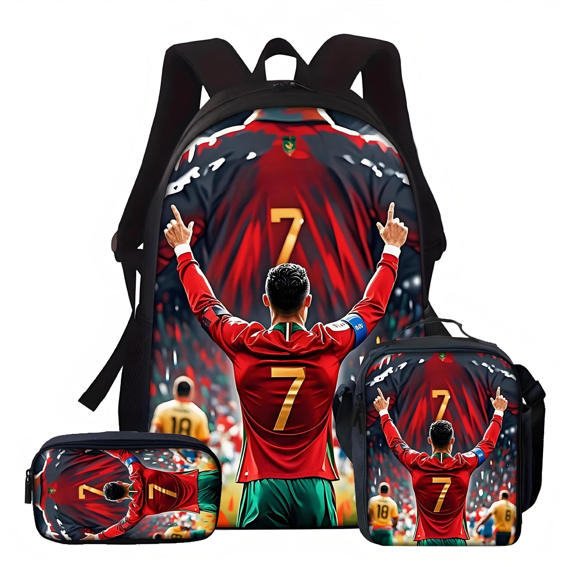 新款跨境足球运动员C罗印花背包三件套配餐包笔袋学生大容量书包