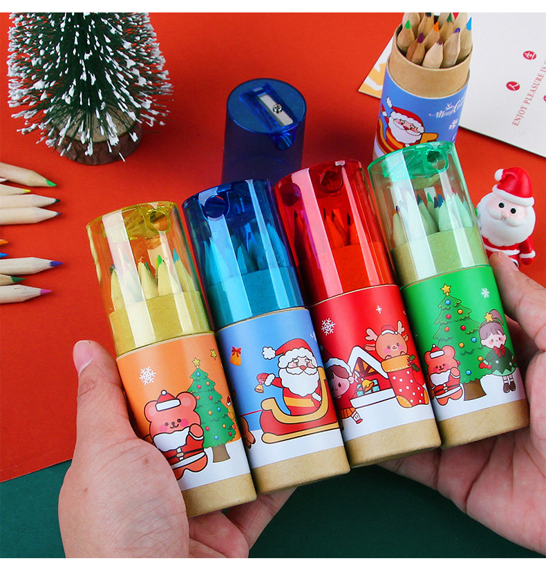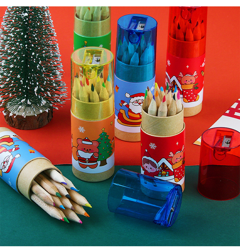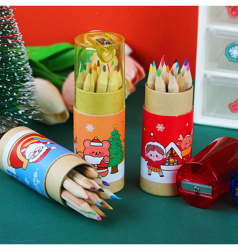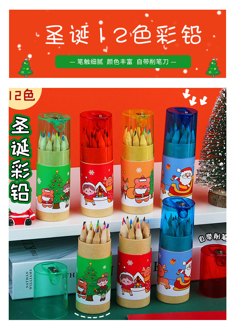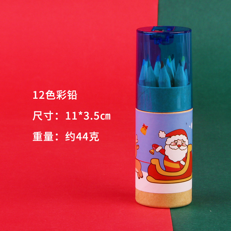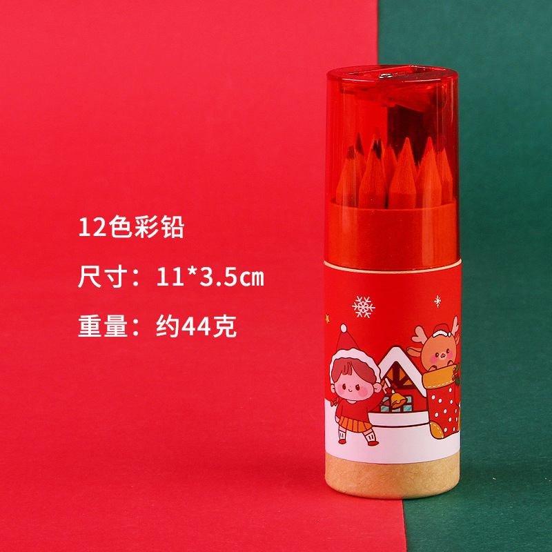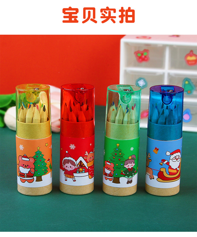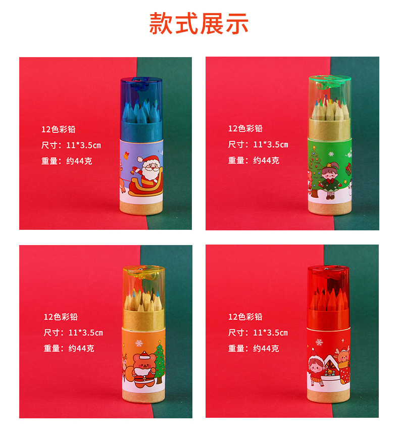 筒装彩色铅笔套装卡通圣诞12色彩铅小学生绘画铅笔圣诞节礼物批发