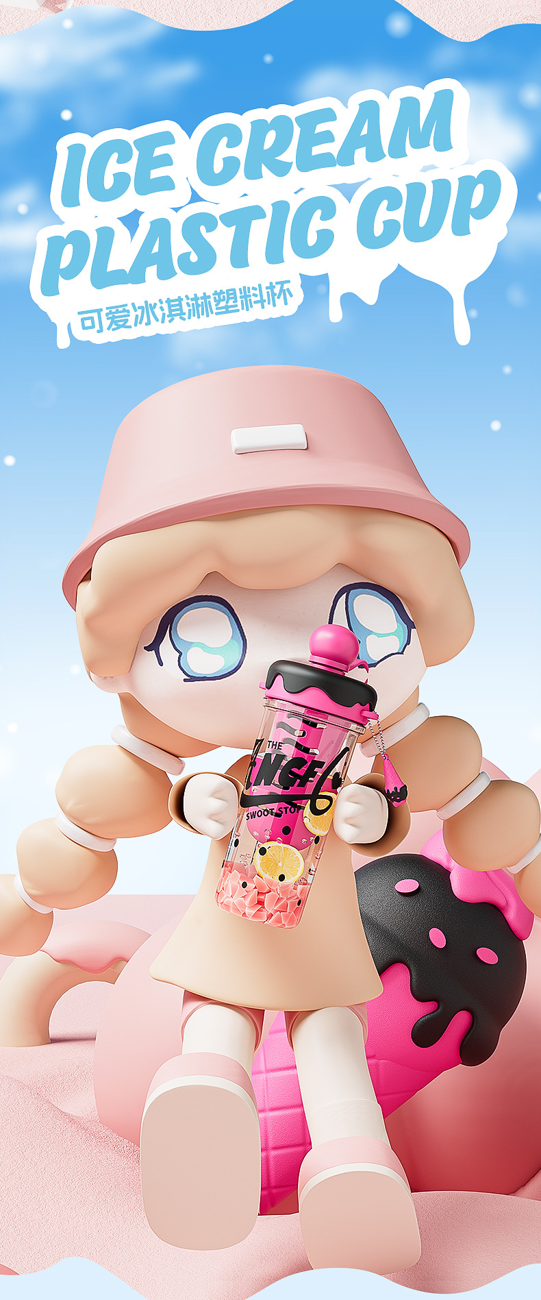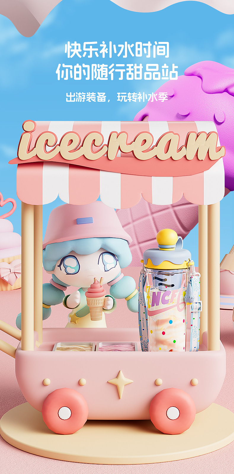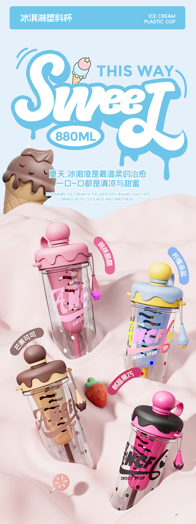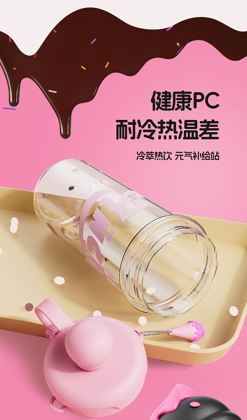 ins风夏日冰淇淋太空水杯大容量便携背带塑料杯茶水分离泡茶杯子