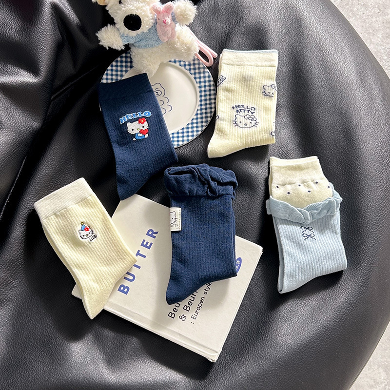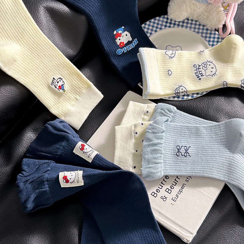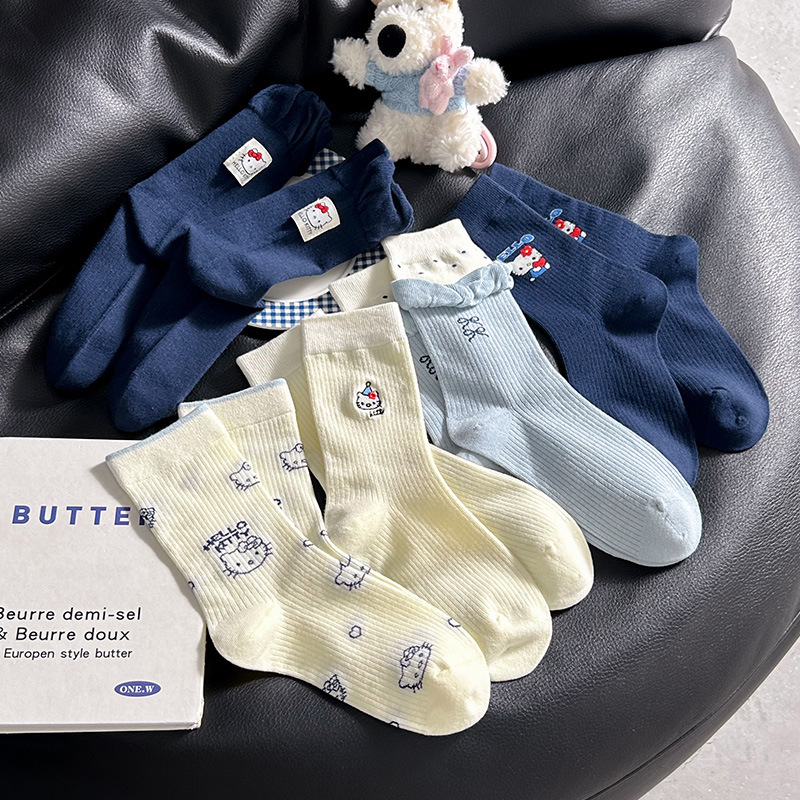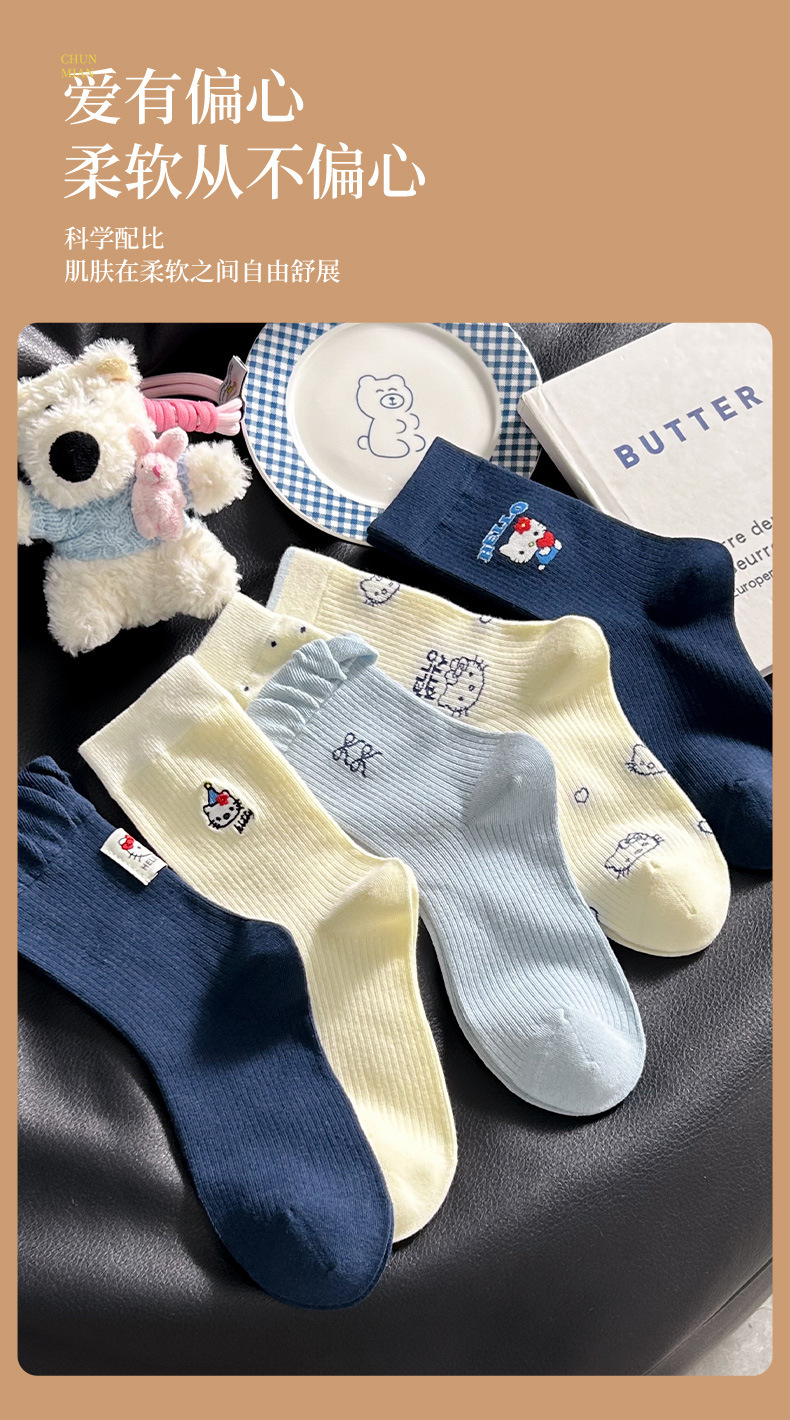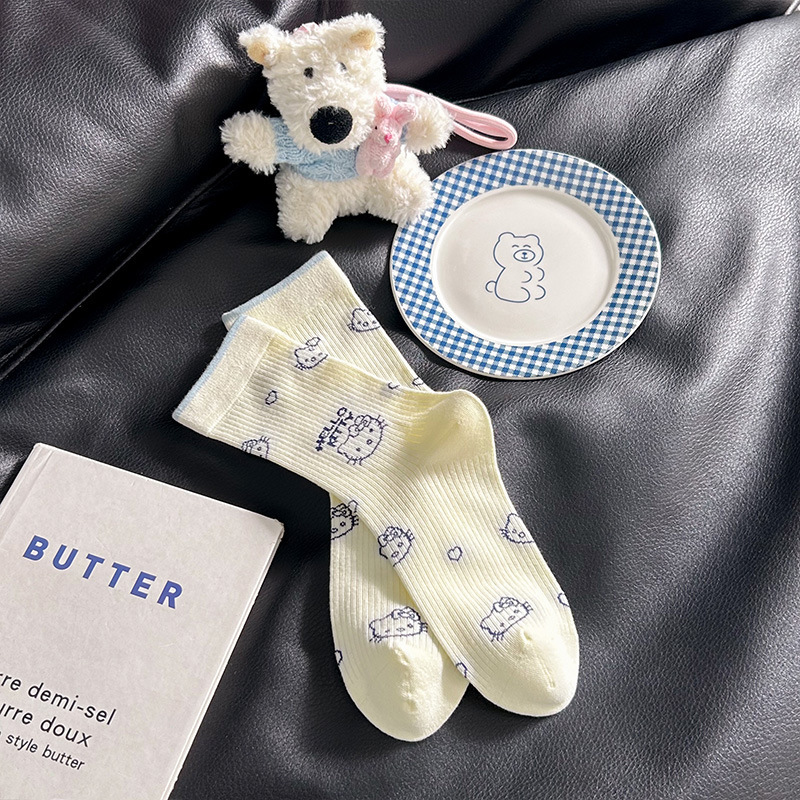 网红猫咪袜子女2025秋季新款可爱卡通中筒袜蓝白色系堆堆袜子日系