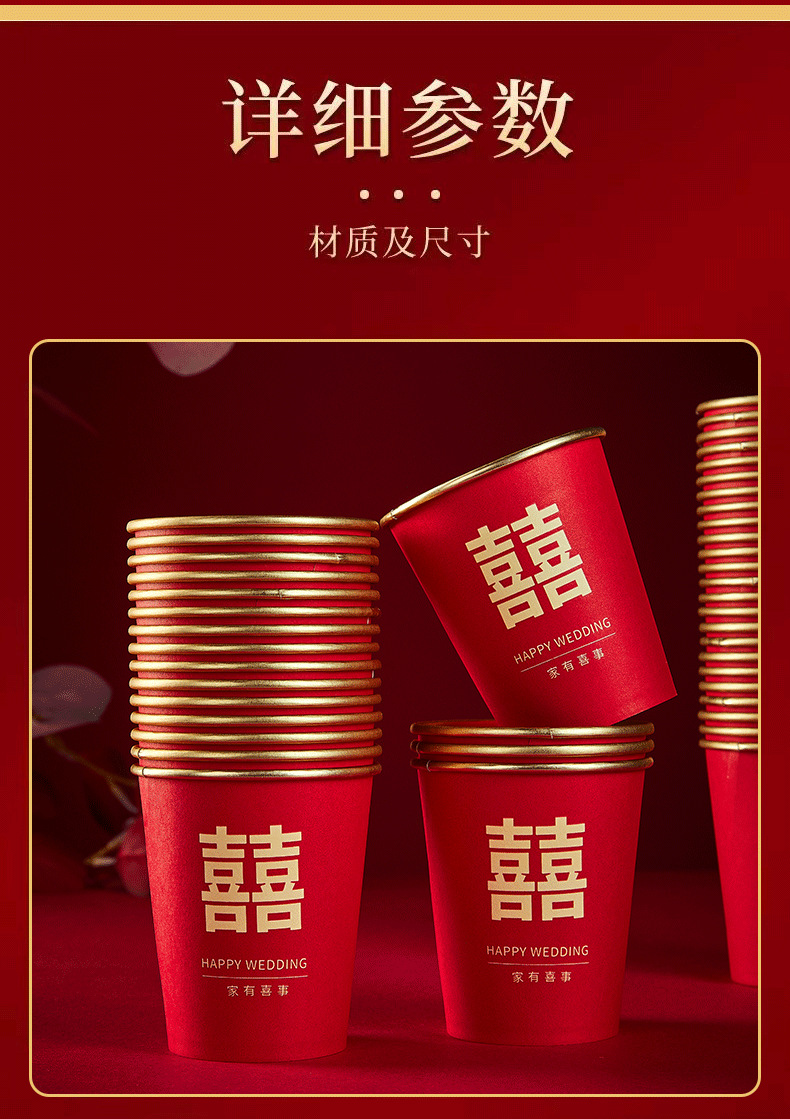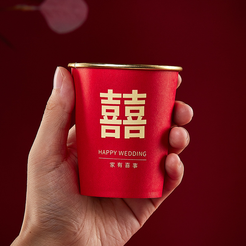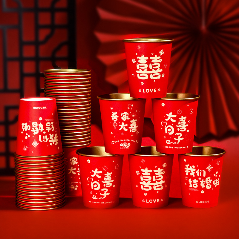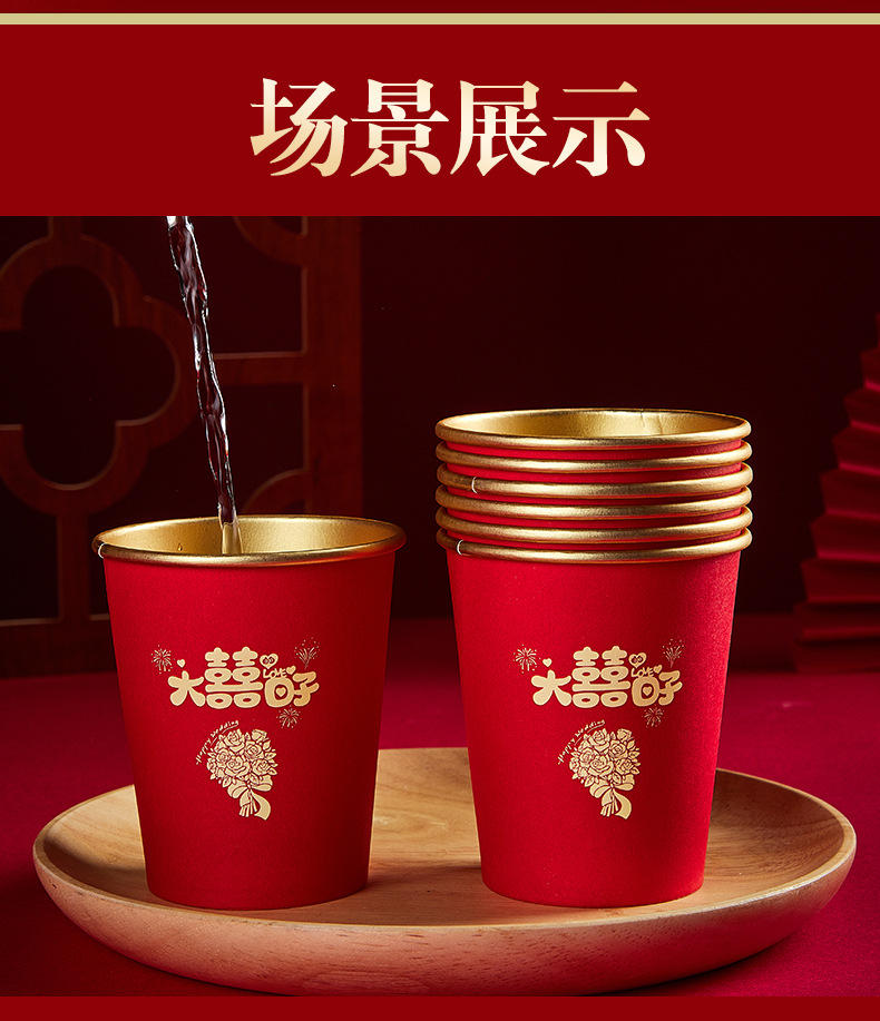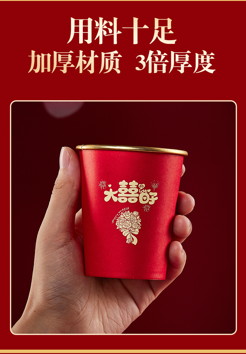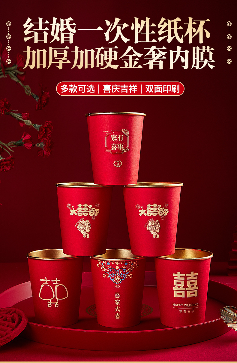 结婚纸杯加厚金箔一次性水杯喜庆婚宴红色家用茶水杯婚礼用品大全