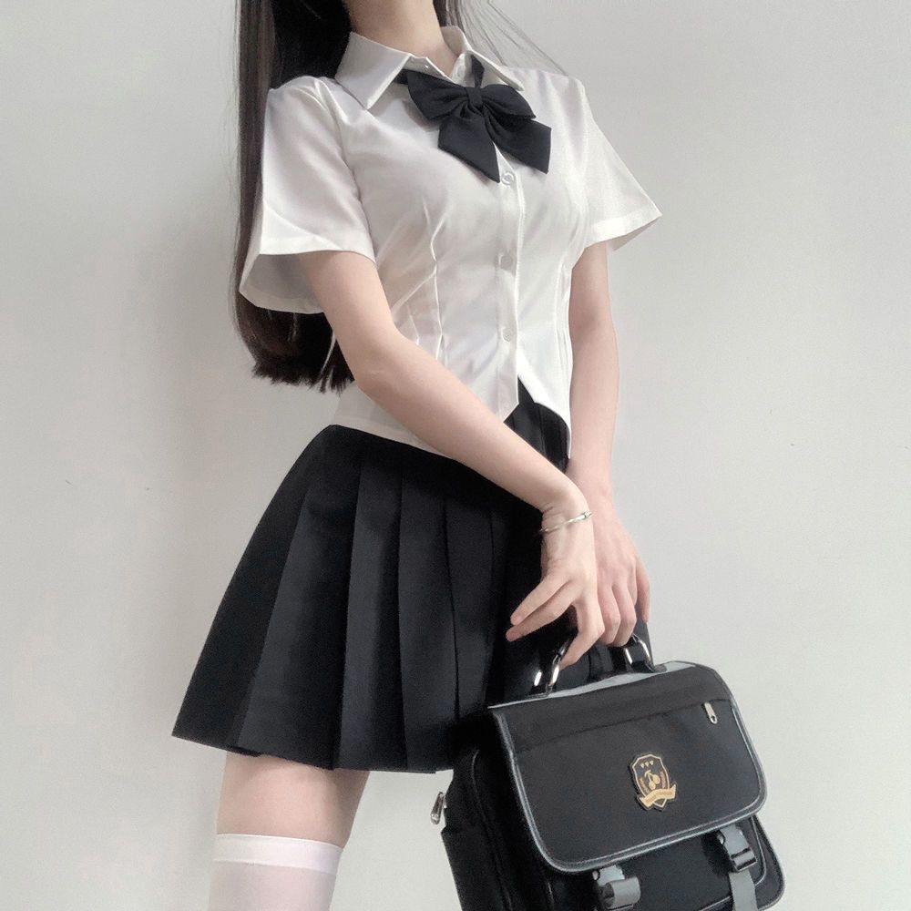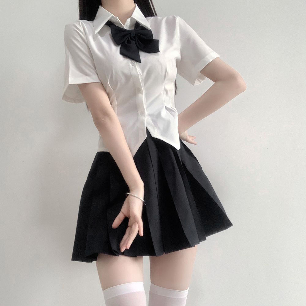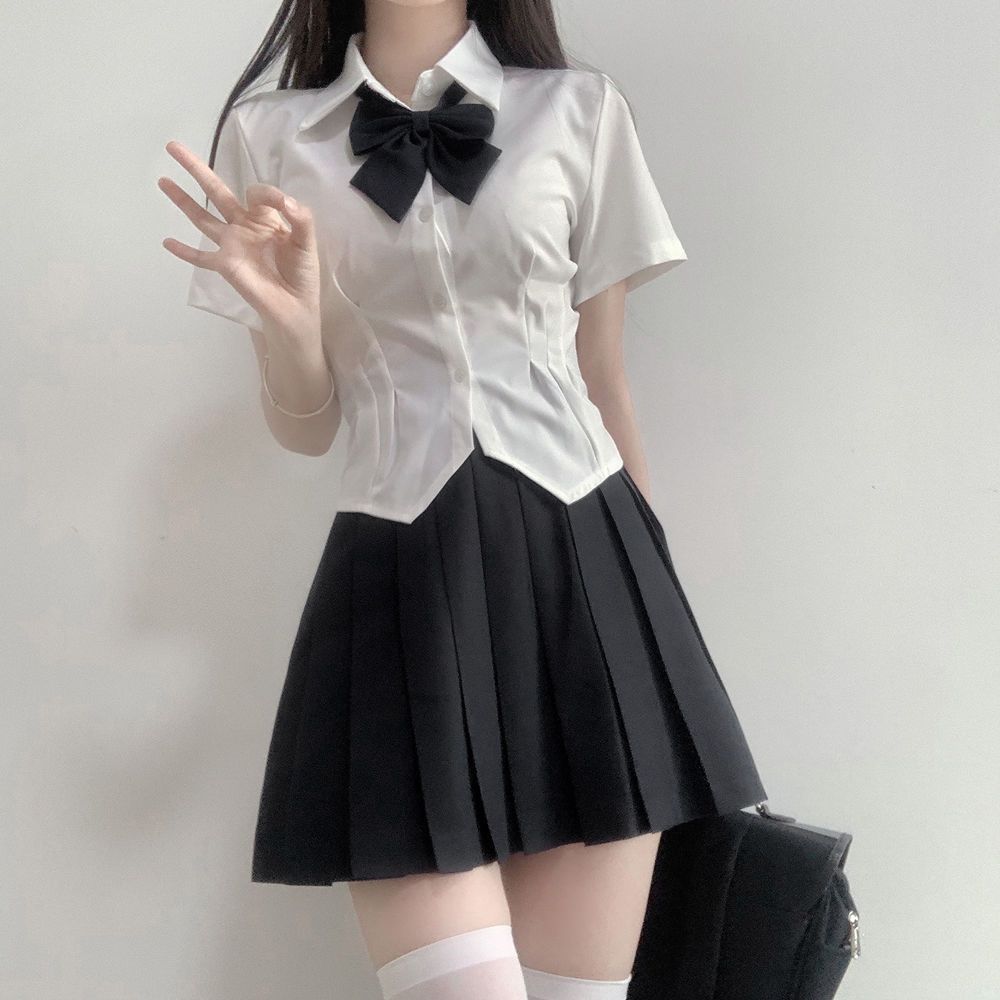 收腰衬衫女生纯欲风性感小个子短袖白色衬衫jk制服衬衫百褶裙套装