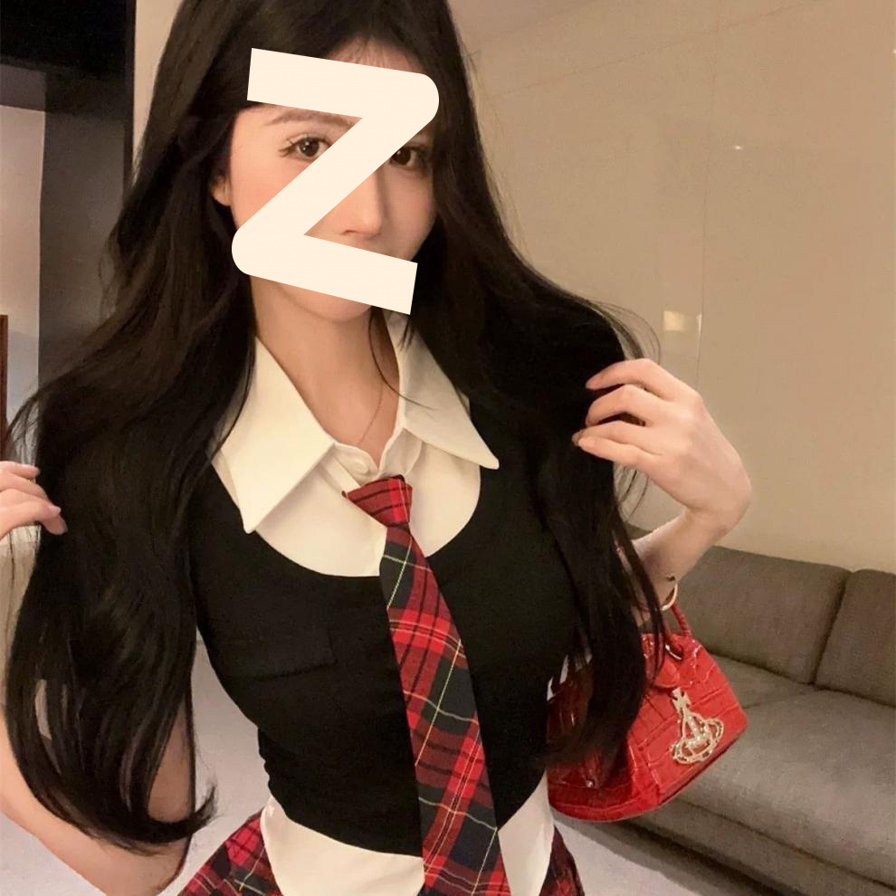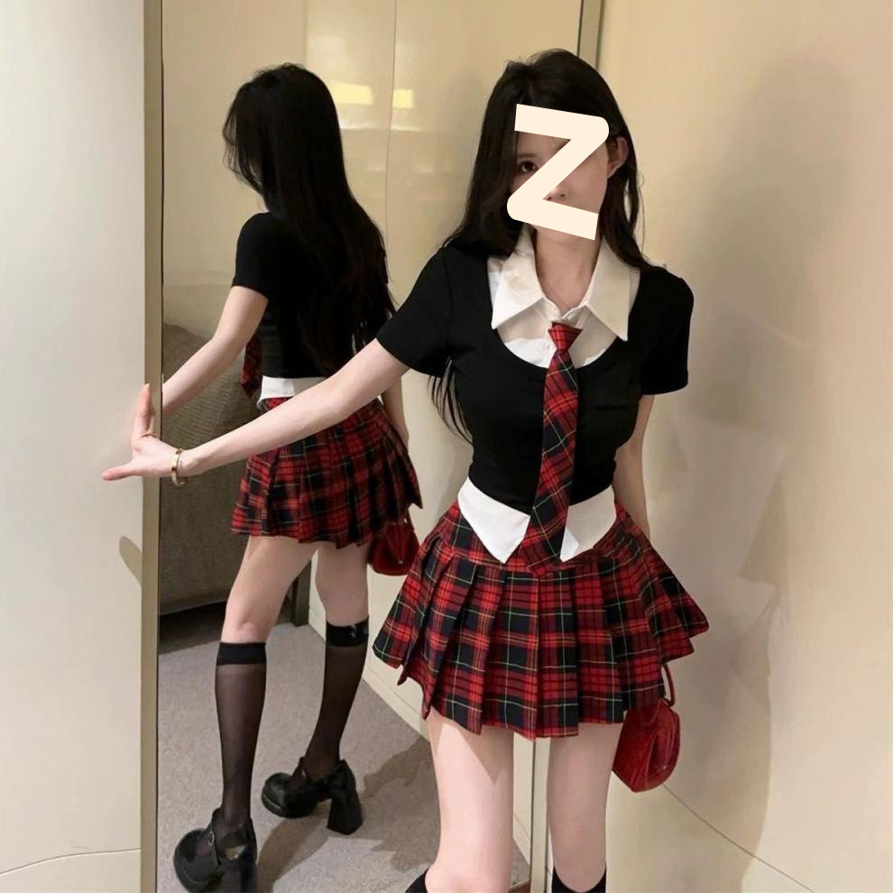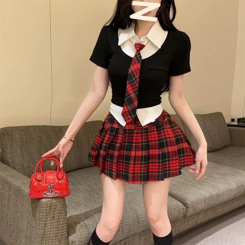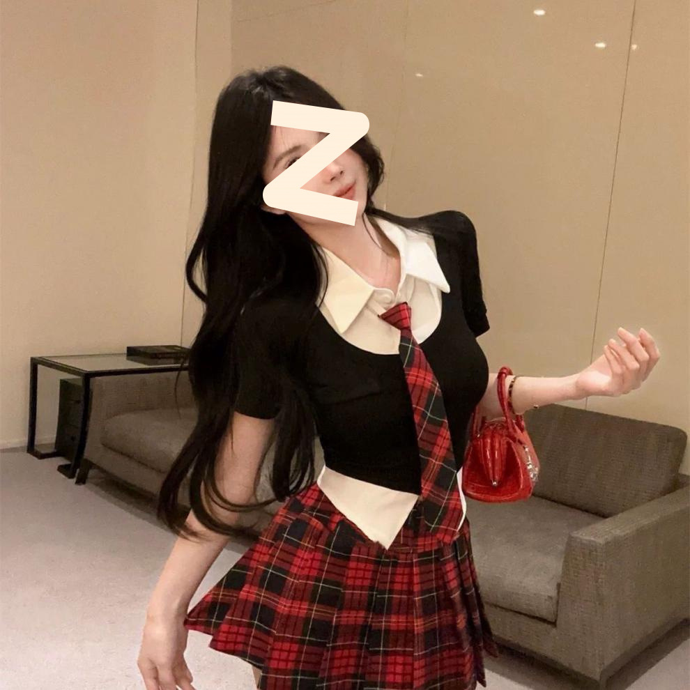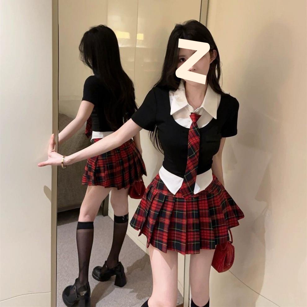 学院风制服套装女夏季辣妹假两件polo领短袖上衣+高腰jk格子短裙