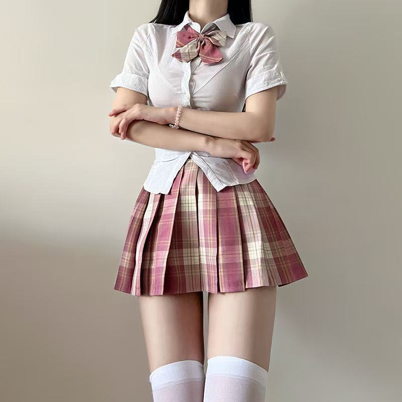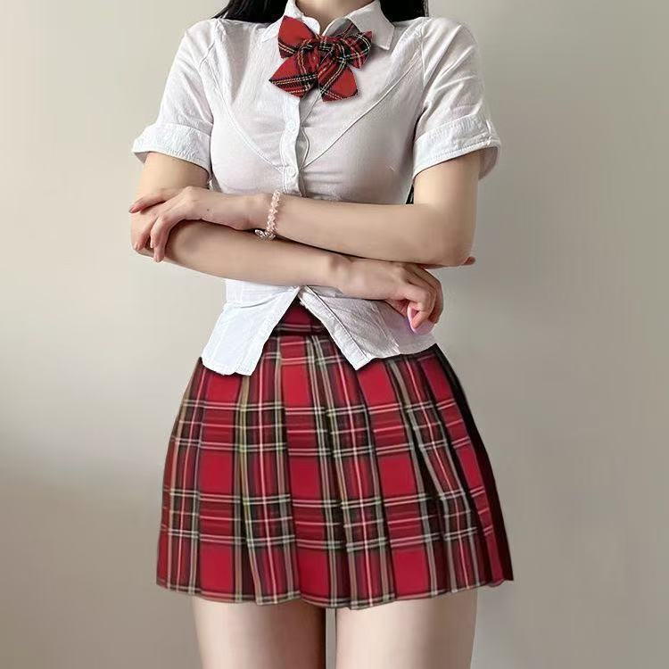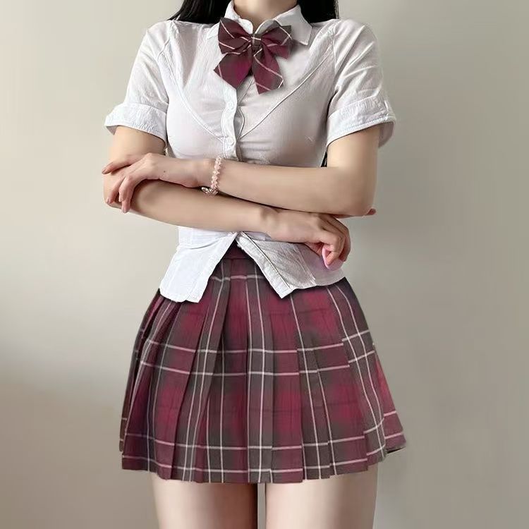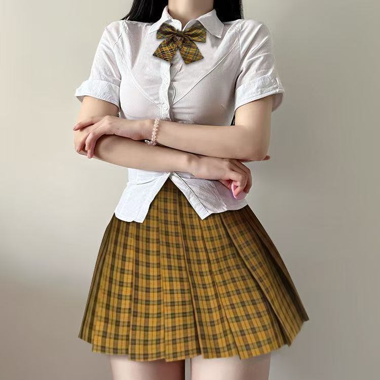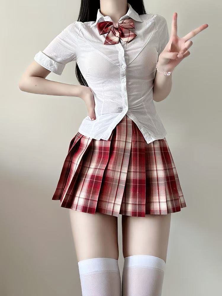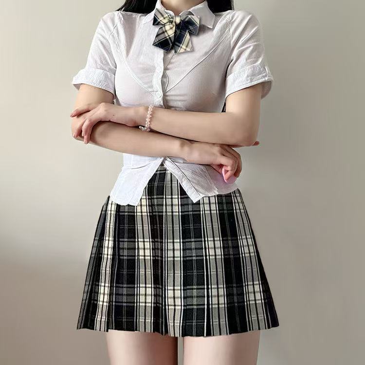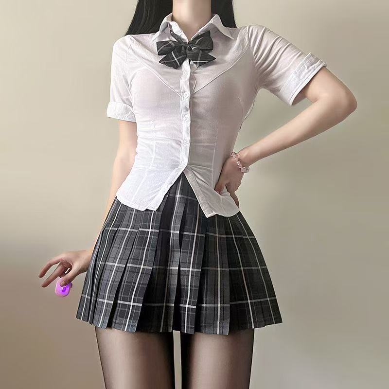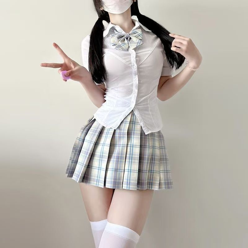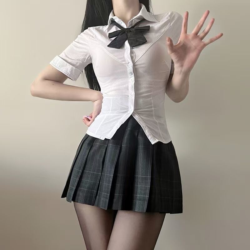原创纯欲jk辣妹制服收腰修身显瘦白色衬衫百褶裙上衣套装学院风