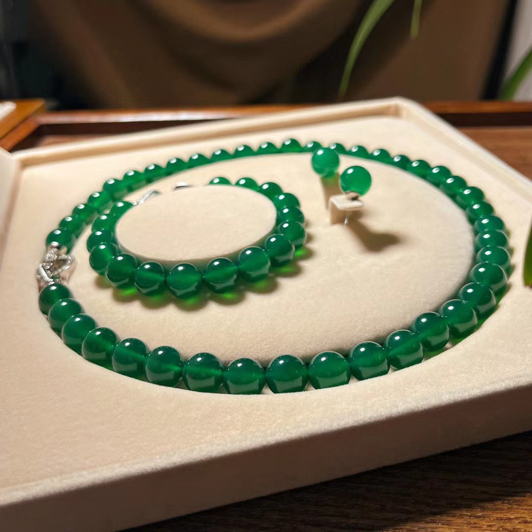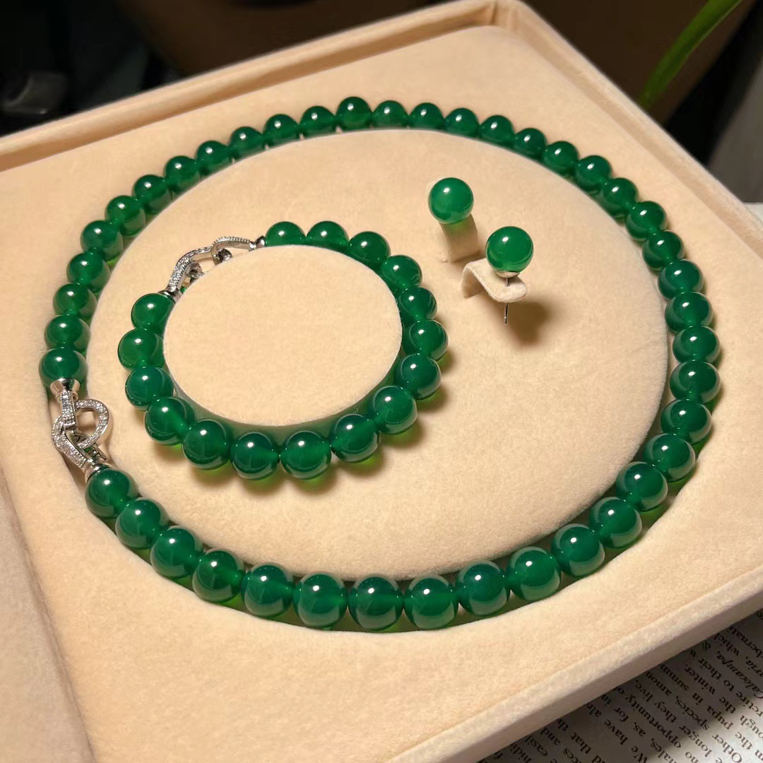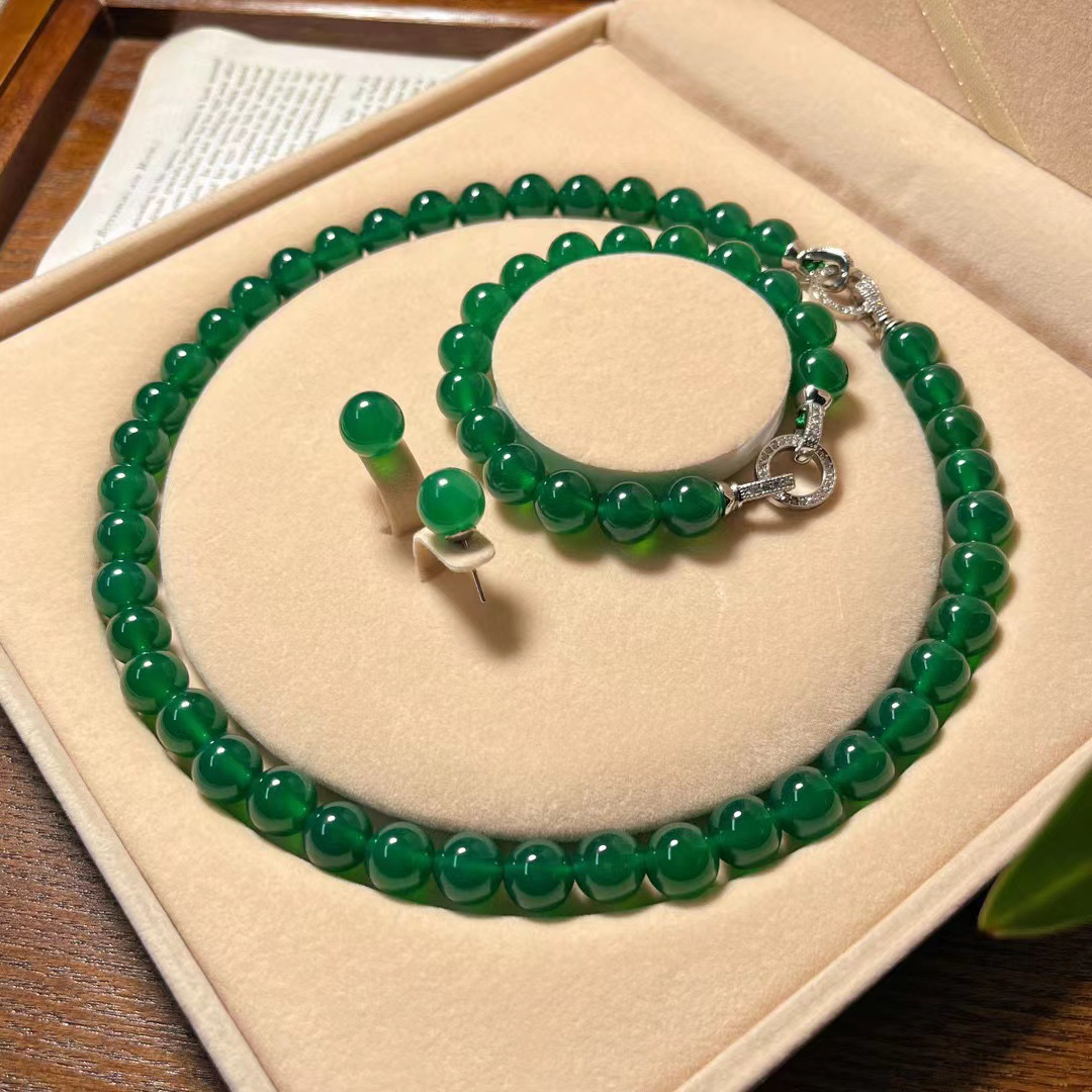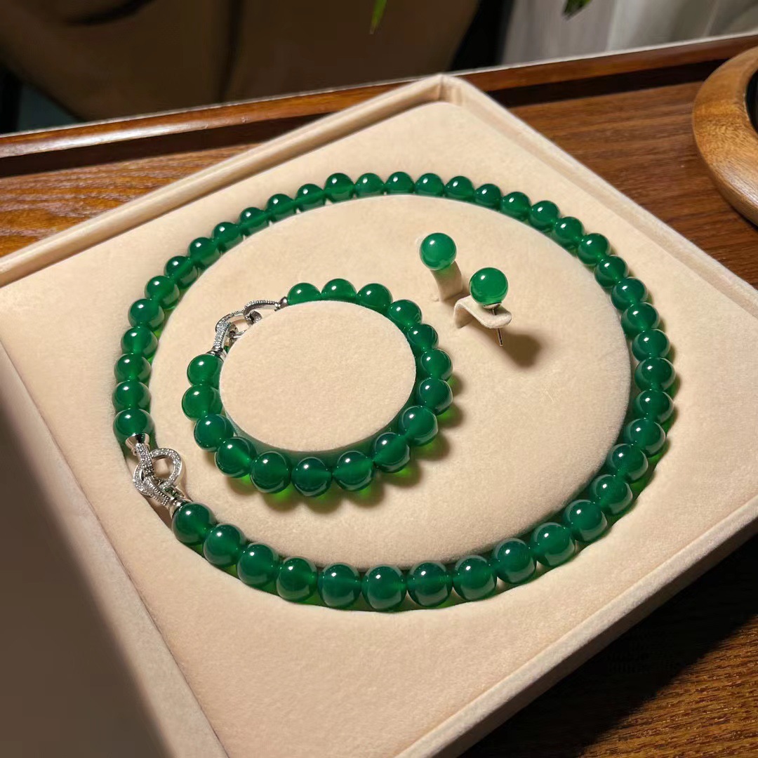 翡翠色起光天然绿玉髓玛瑙项链手链耳钉 母亲节妈妈项链手链套盒