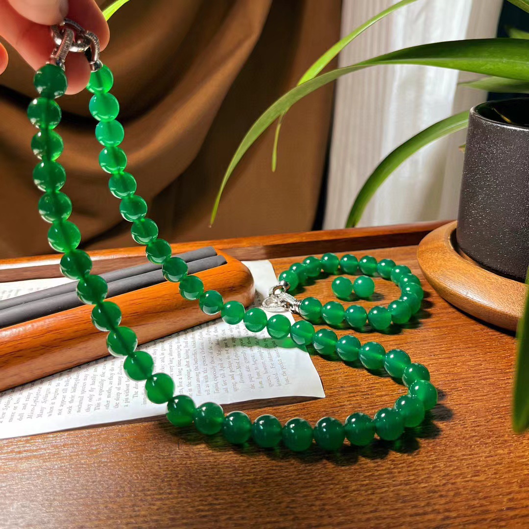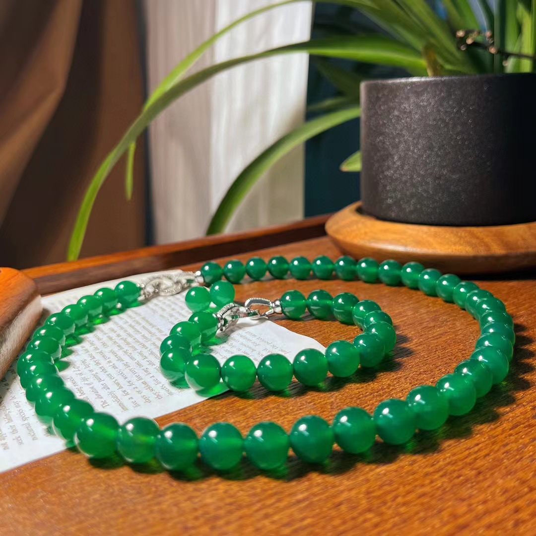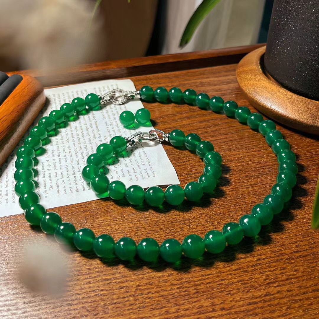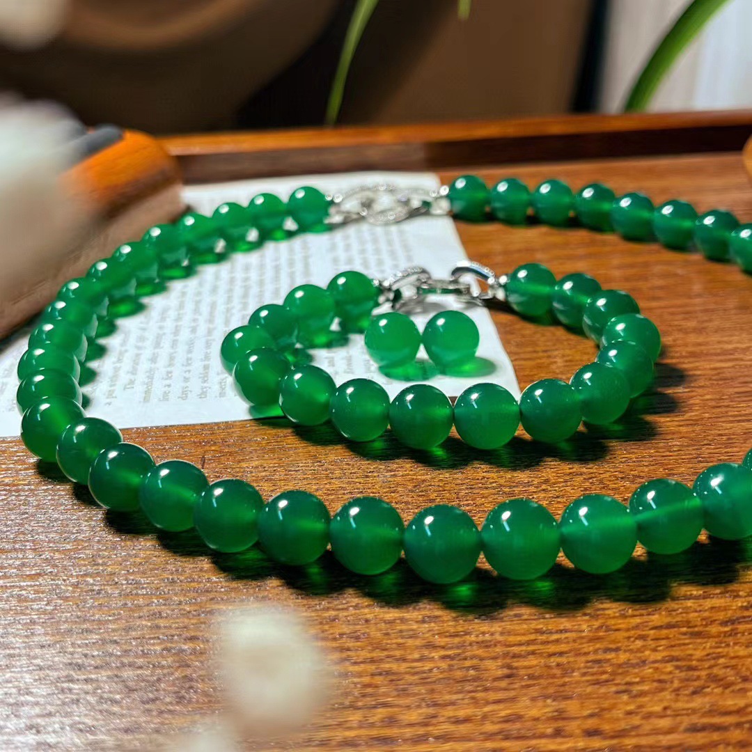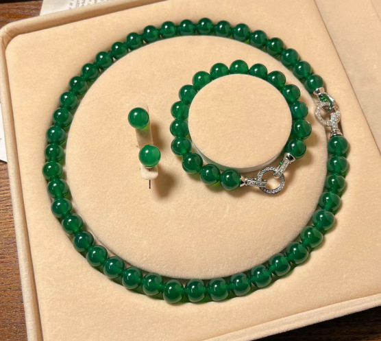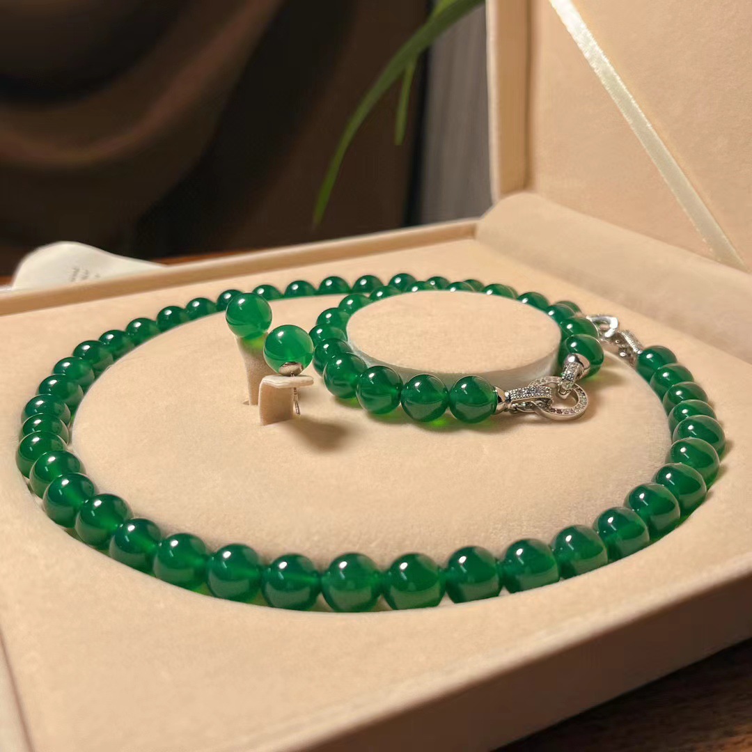 翡翠色起光天然绿玉髓玛瑙项链手链耳钉 母亲节妈妈项链手链套盒