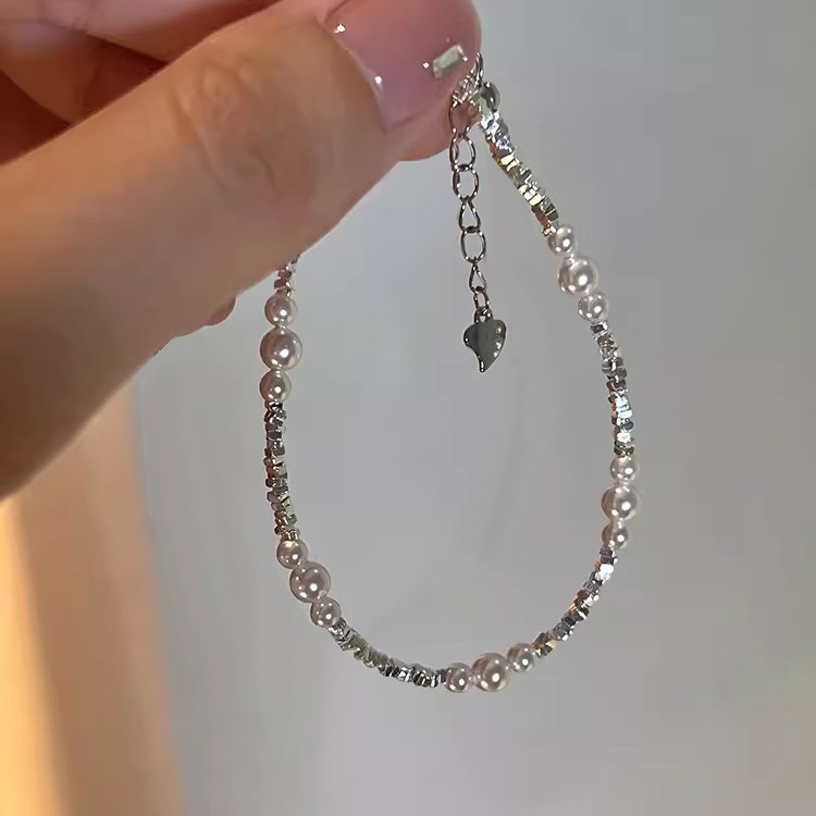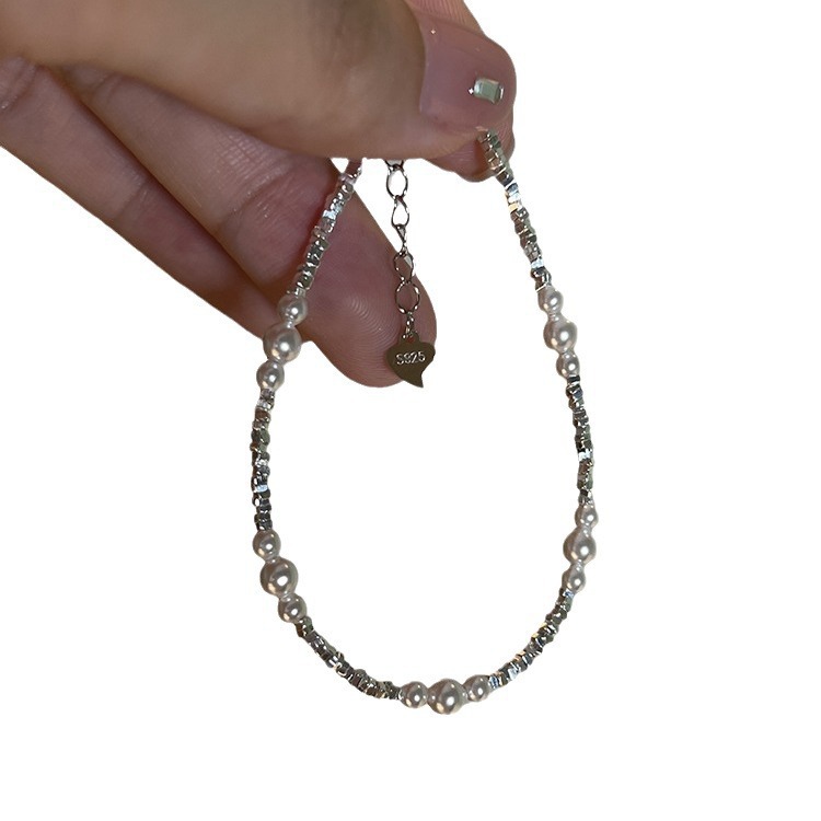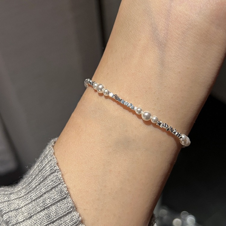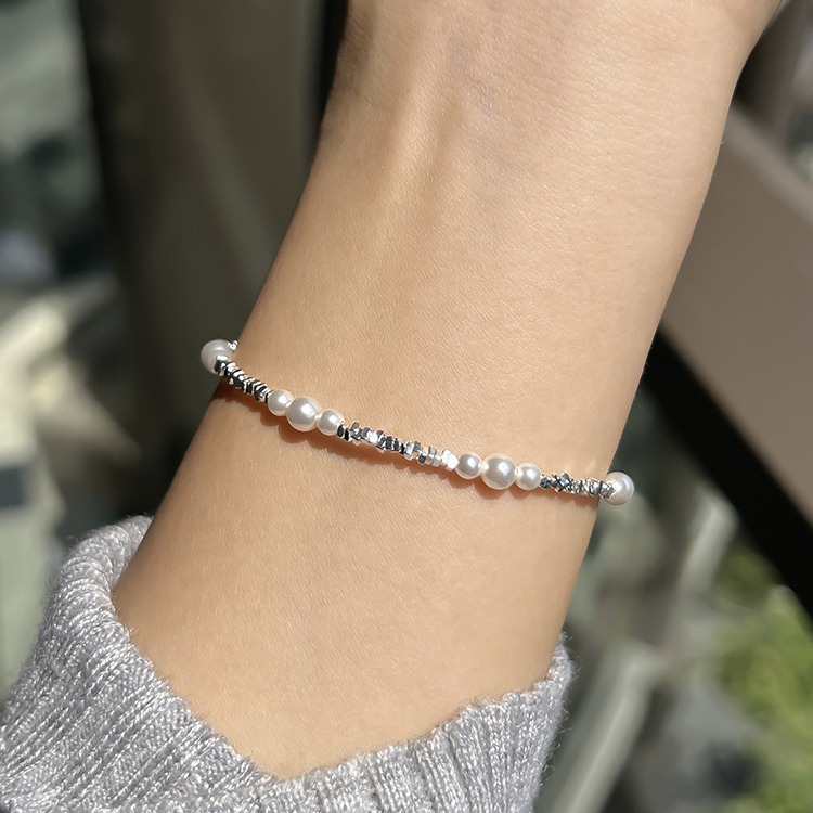925银手链碎银子施家正圆大小强光珍珠手链女小众设计感手链