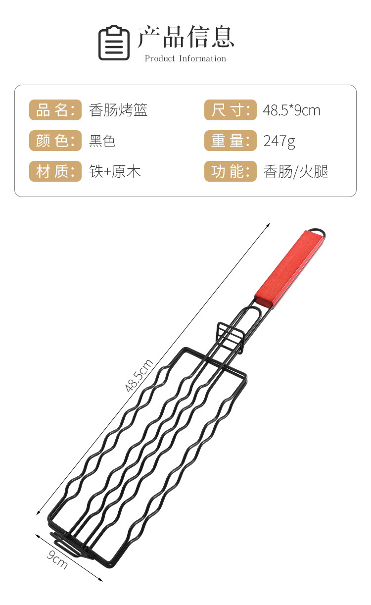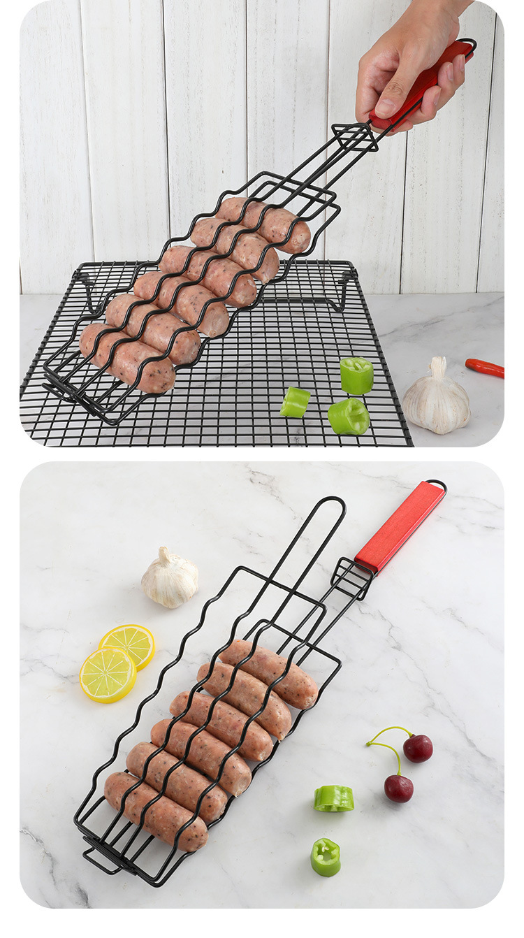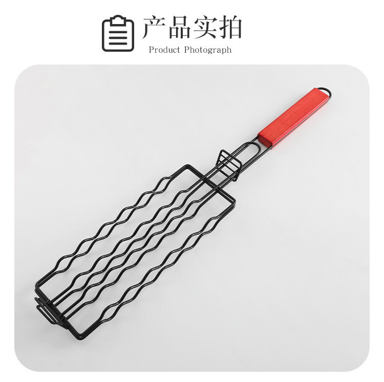 可拆卸香肠烧烤网 木柄热狗烧烤架BBQ不粘烧烤夹户外火煺肠烧烤网