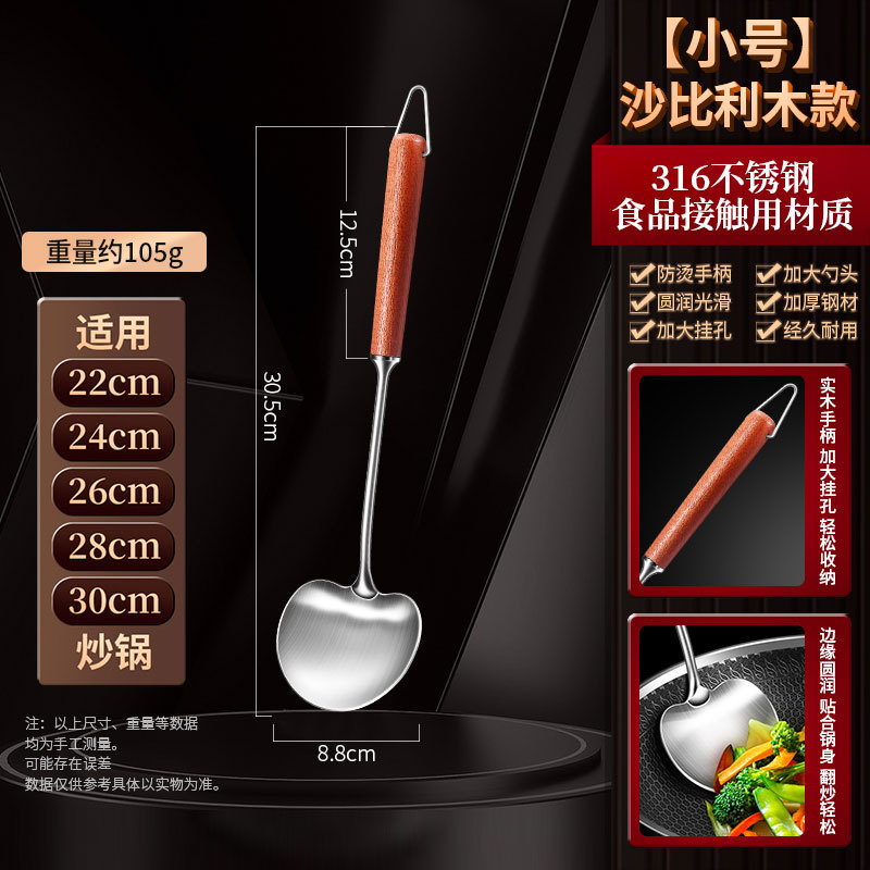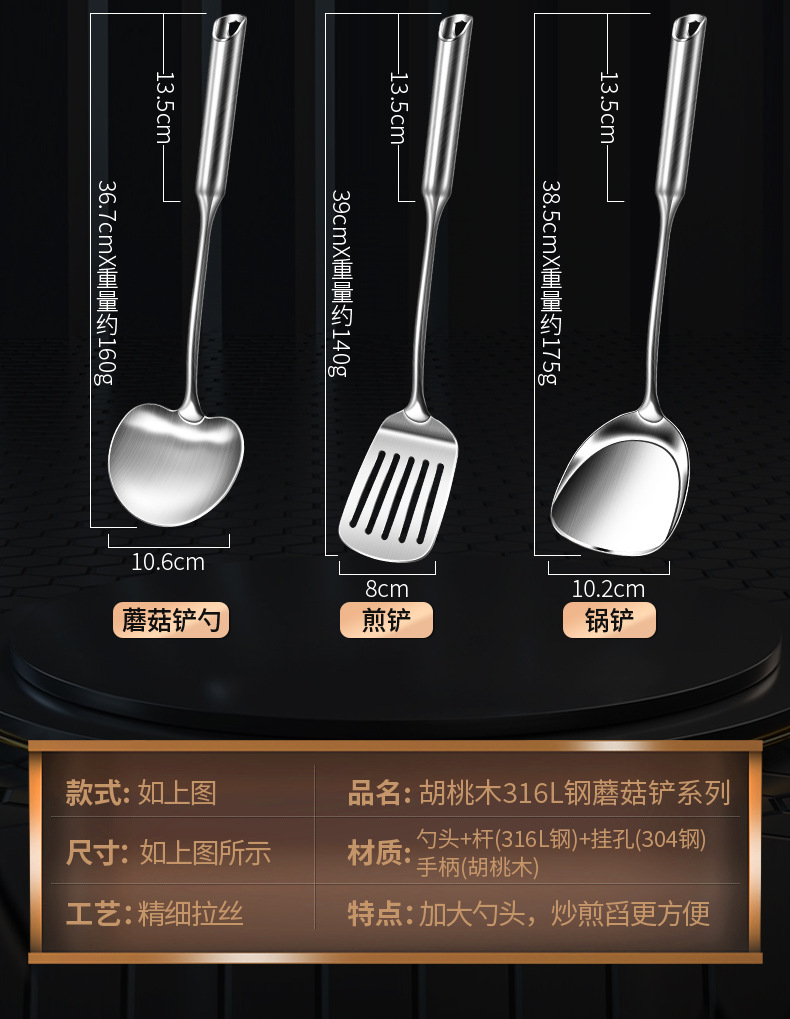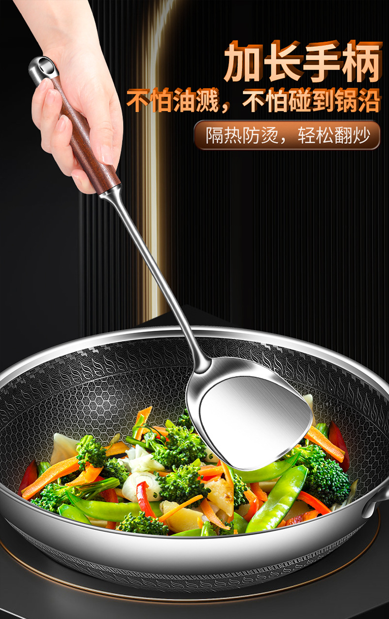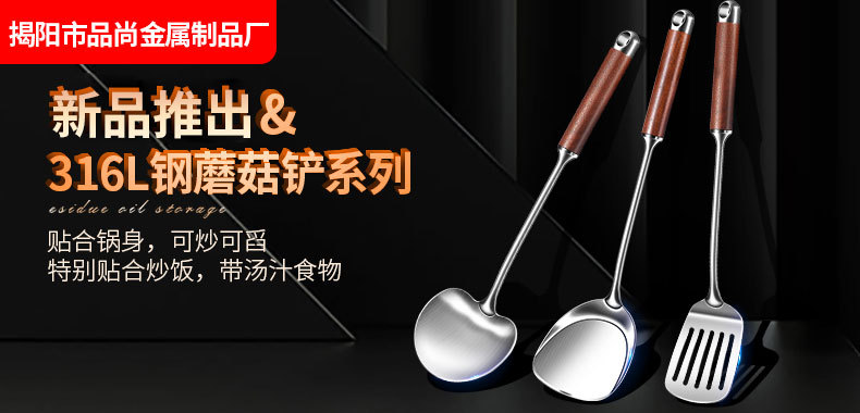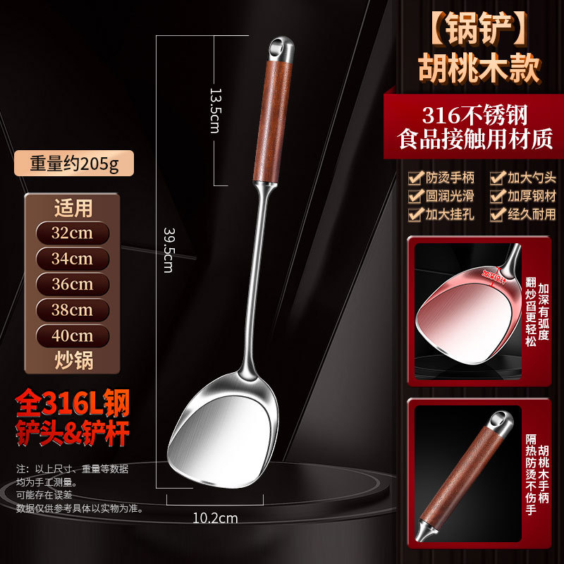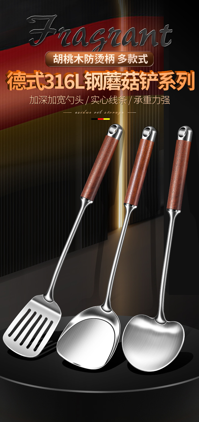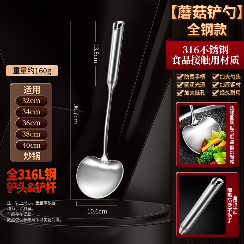 316L不锈钢蘑菇铲实木防烫炒铲厨房加长锅铲家用烹饪汤勺加厚煎铲