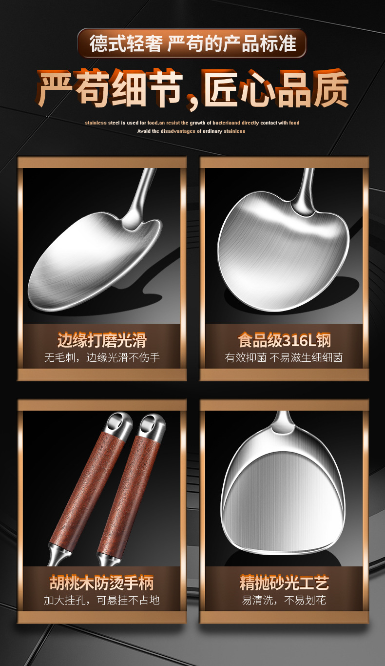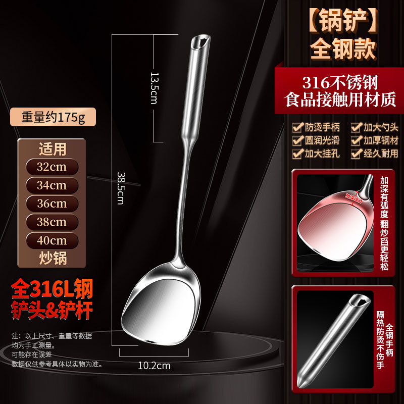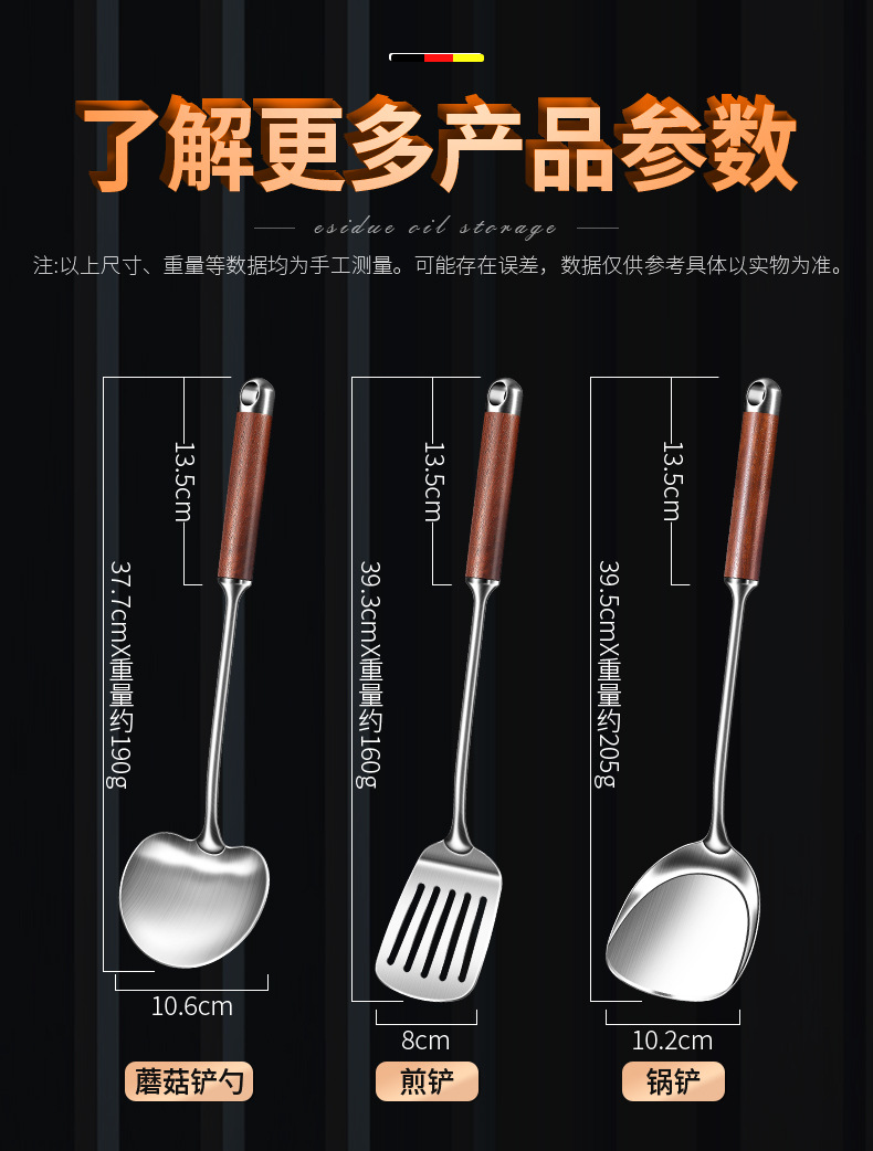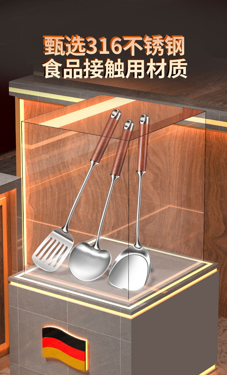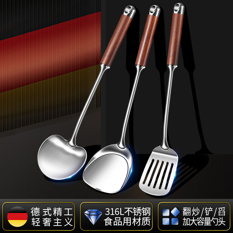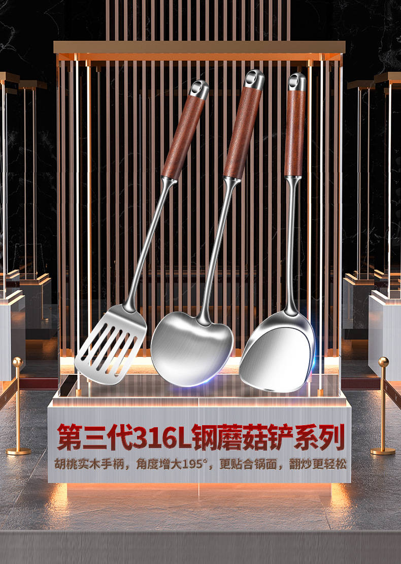 316L不锈钢蘑菇铲实木防烫炒铲厨房加长锅铲家用烹饪汤勺加厚煎铲
