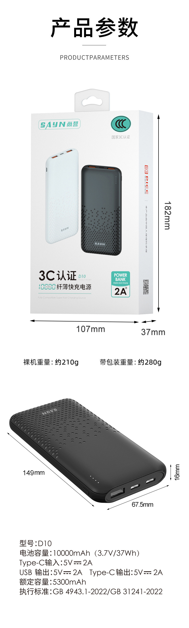 现货3C认证快充移动电源1万毫安实标聚合物电池礼品定制 充电宝