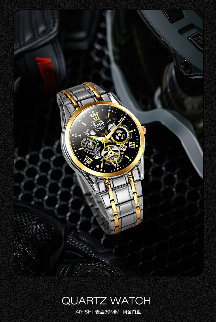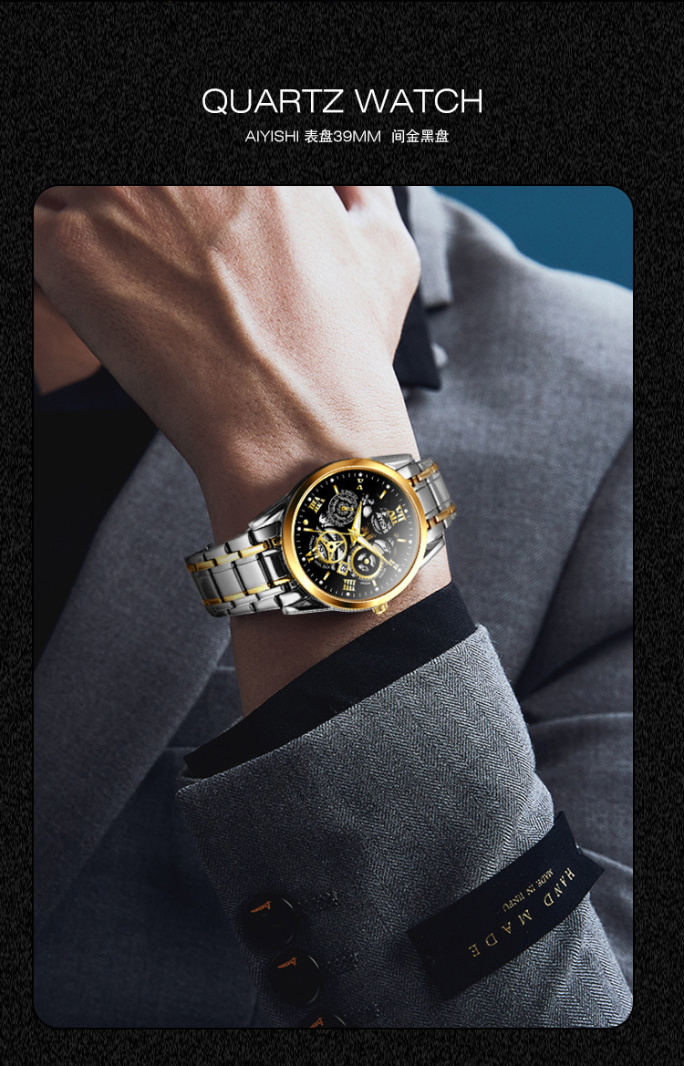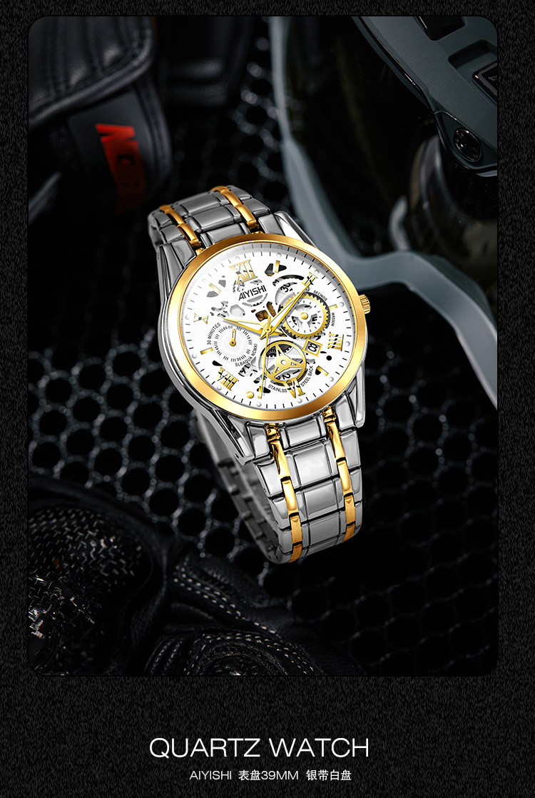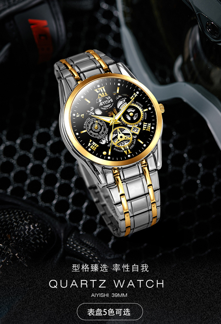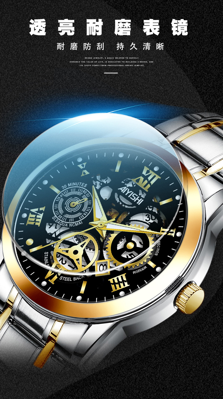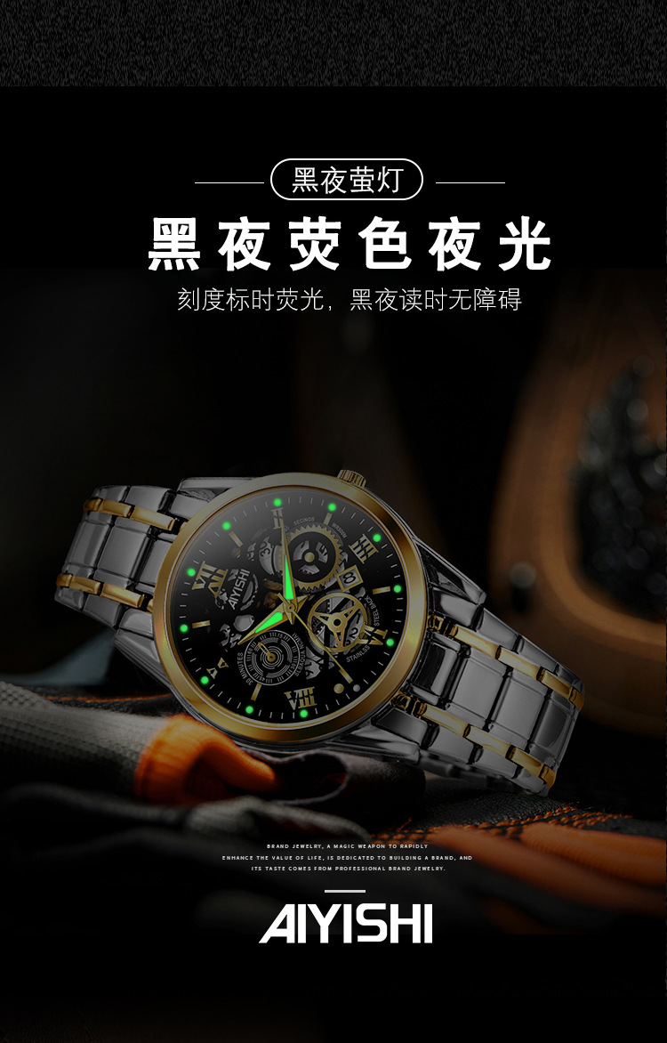 正品手表男全自动非机械男表 精钢防水 石英日历男士手表钢带夜光