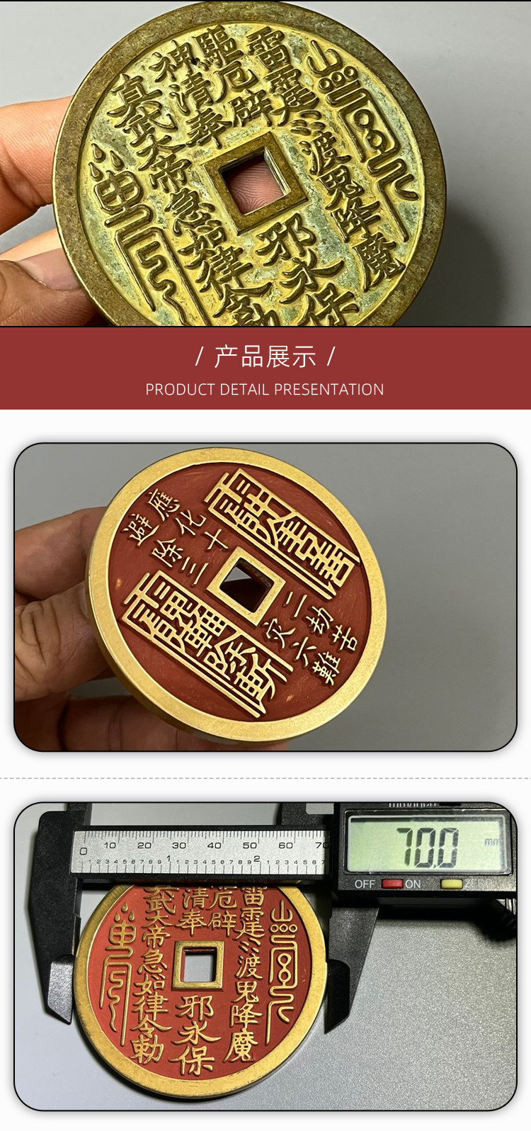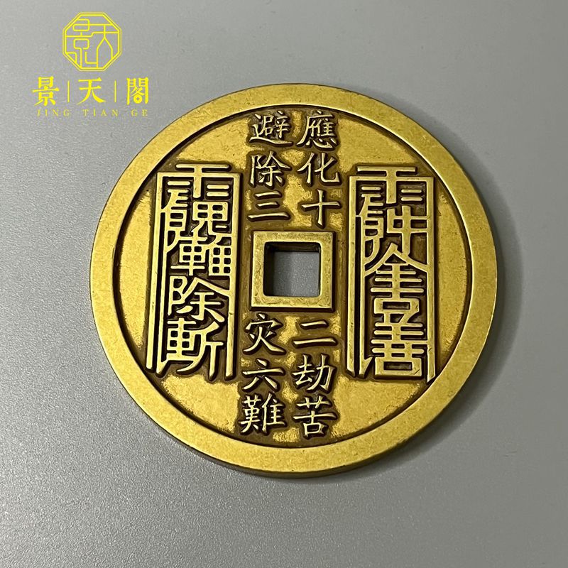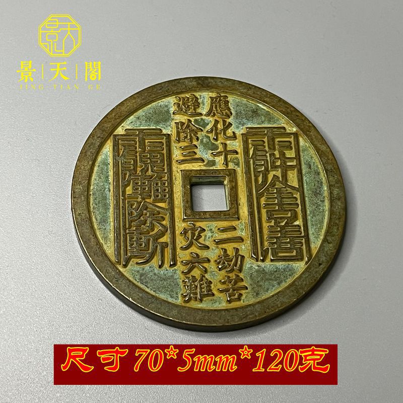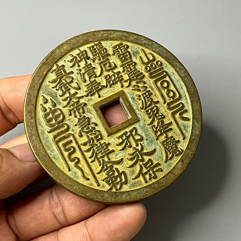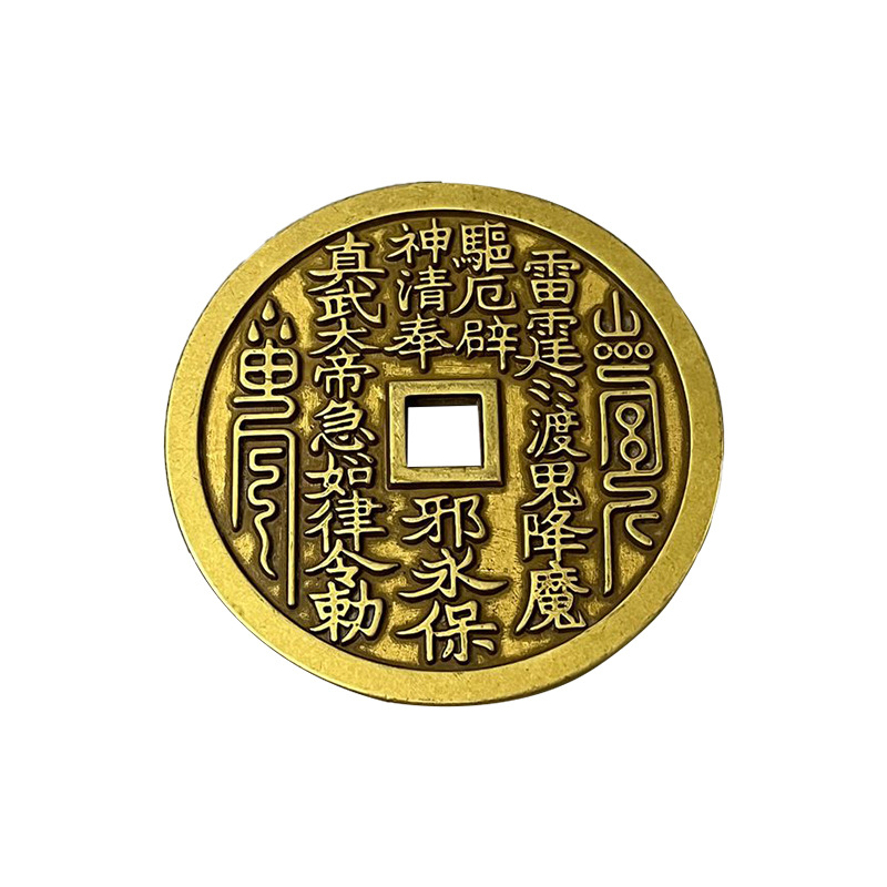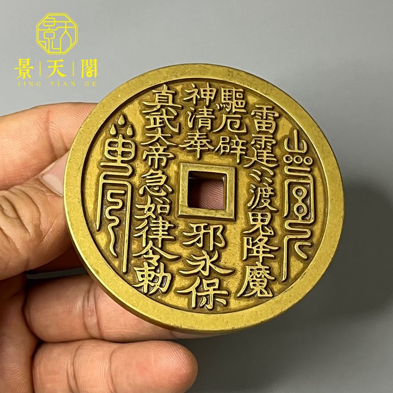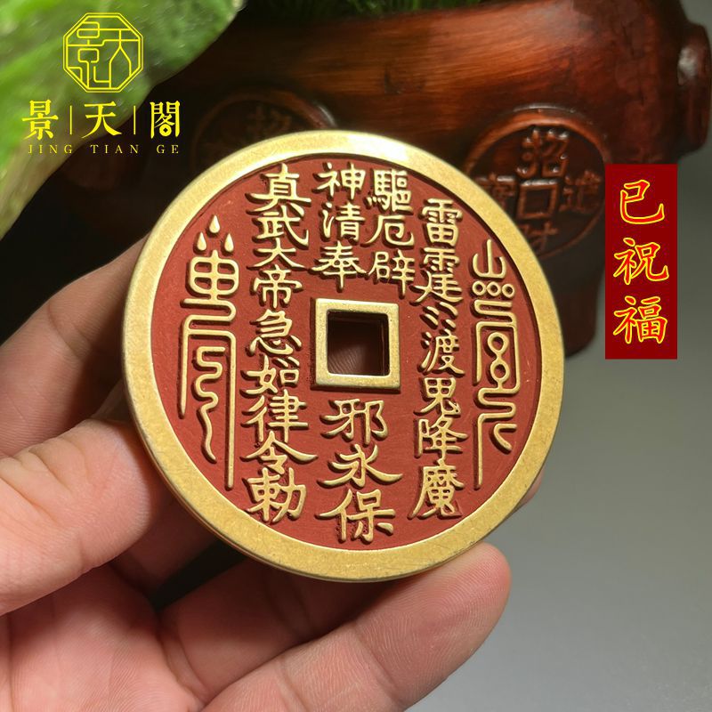 纯铜大号朱砂绿锈黄亮真武大帝精雕方孔山鬼雷局花钱厌胜钱 收藏