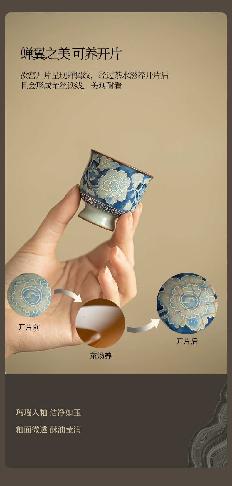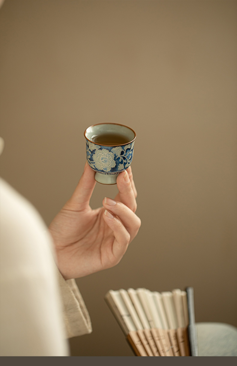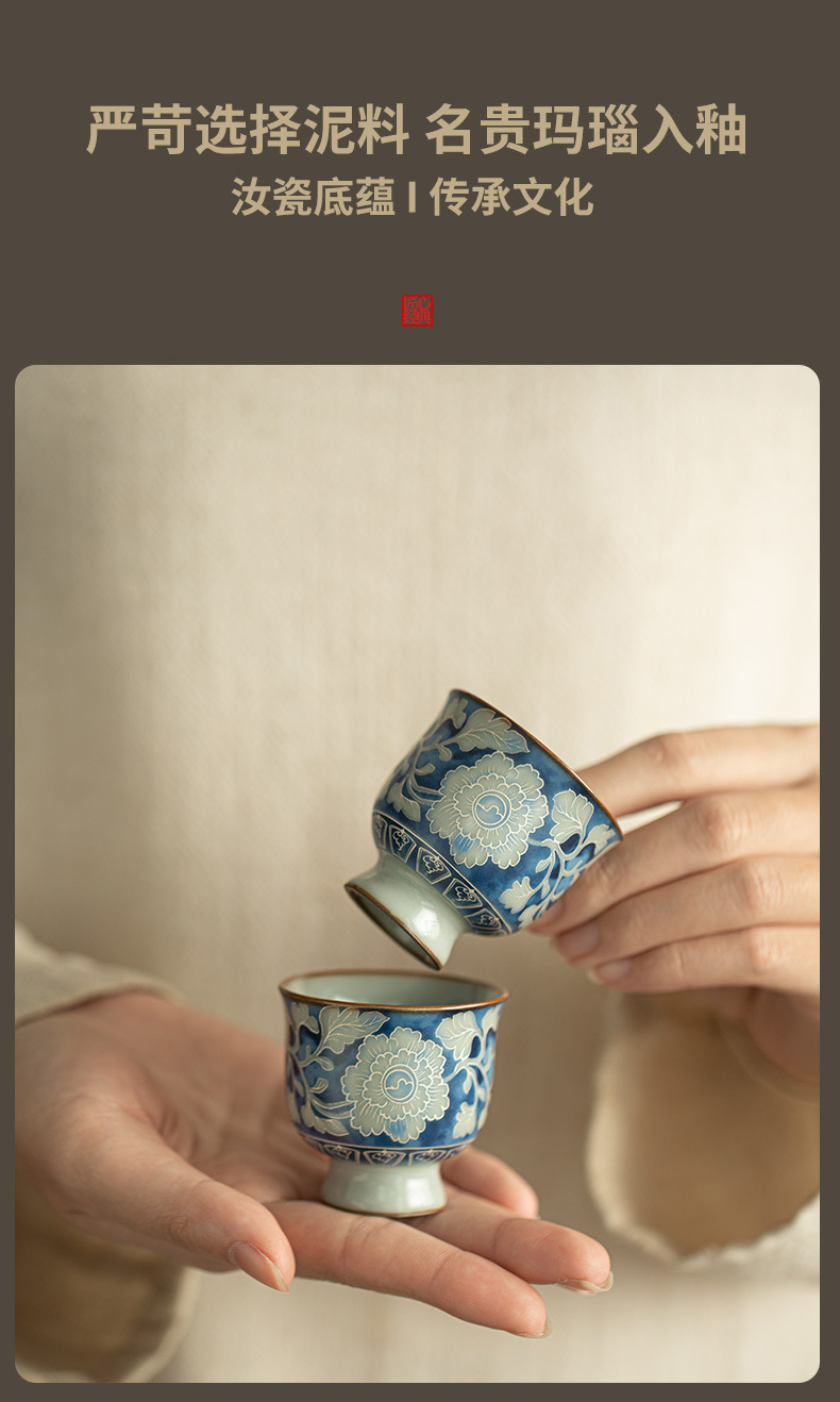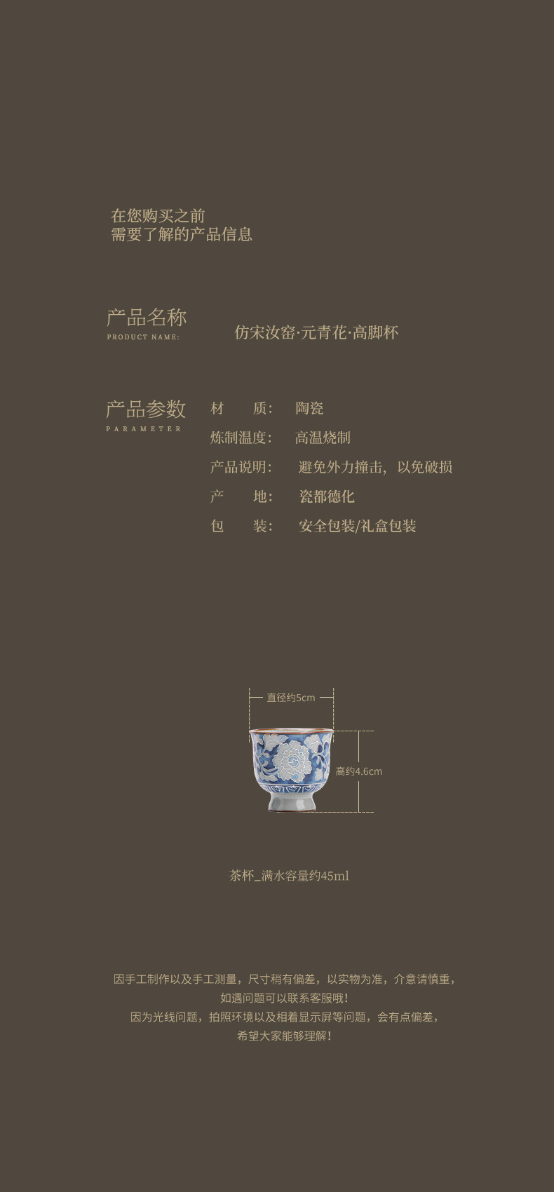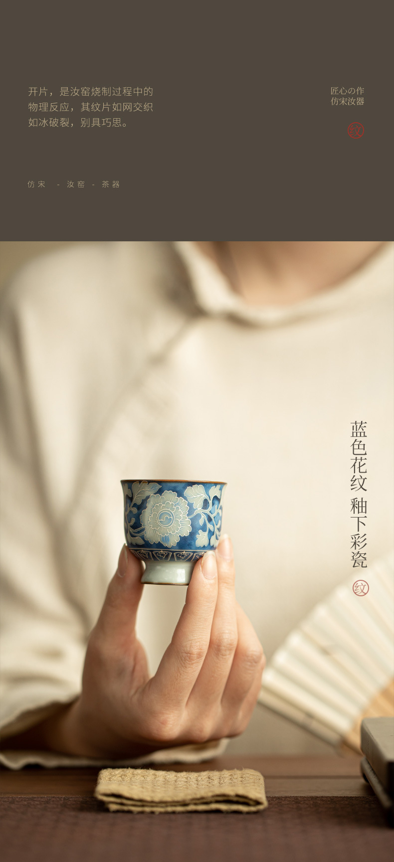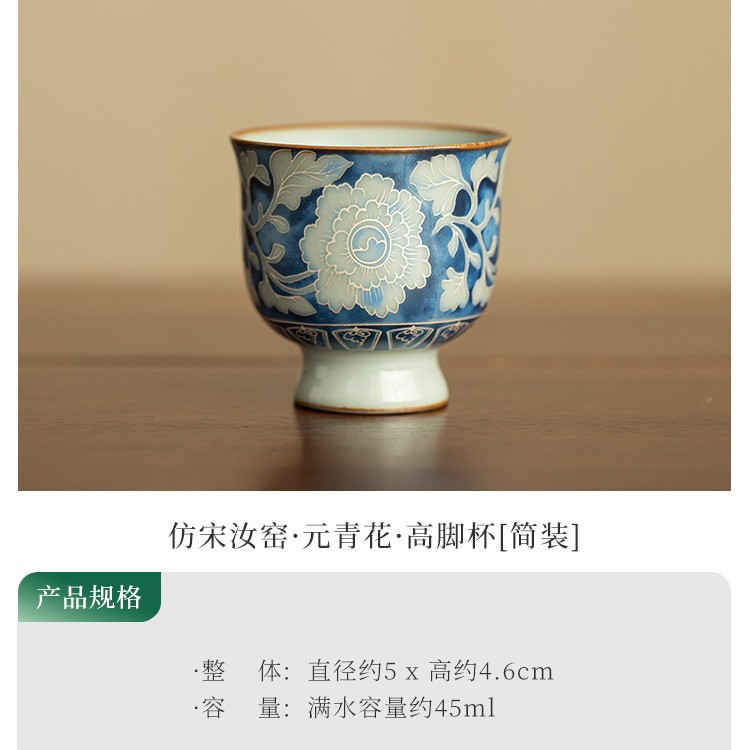 仿宋汝窑元青花茶杯主人杯客杯陶瓷茶具高脚杯开片可养牡丹品茗杯