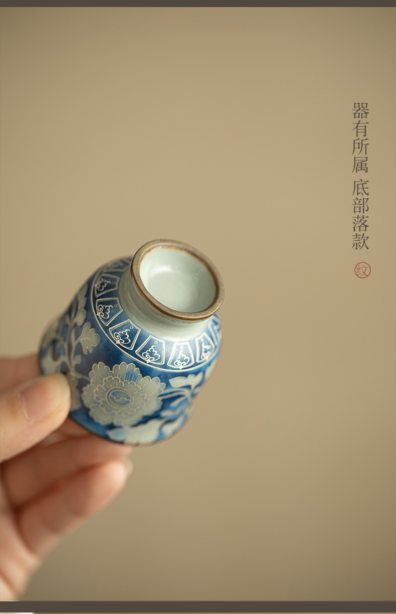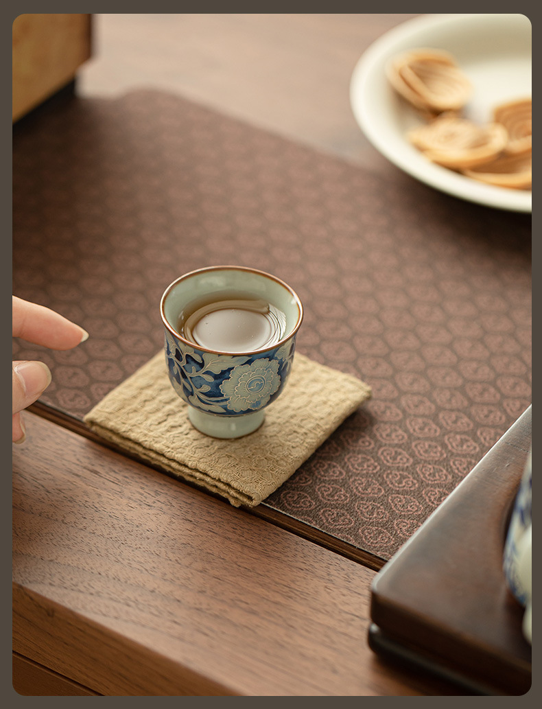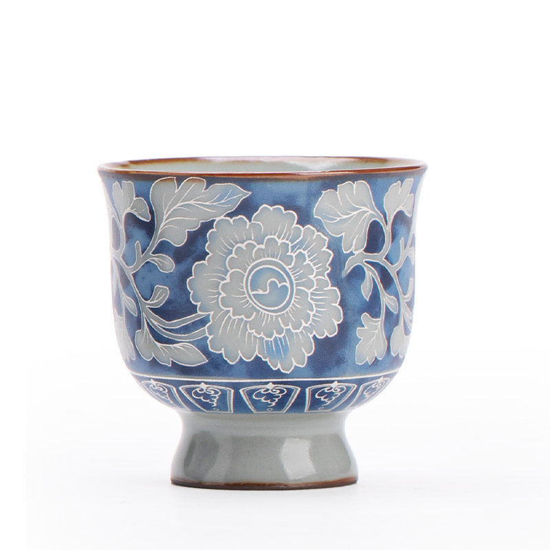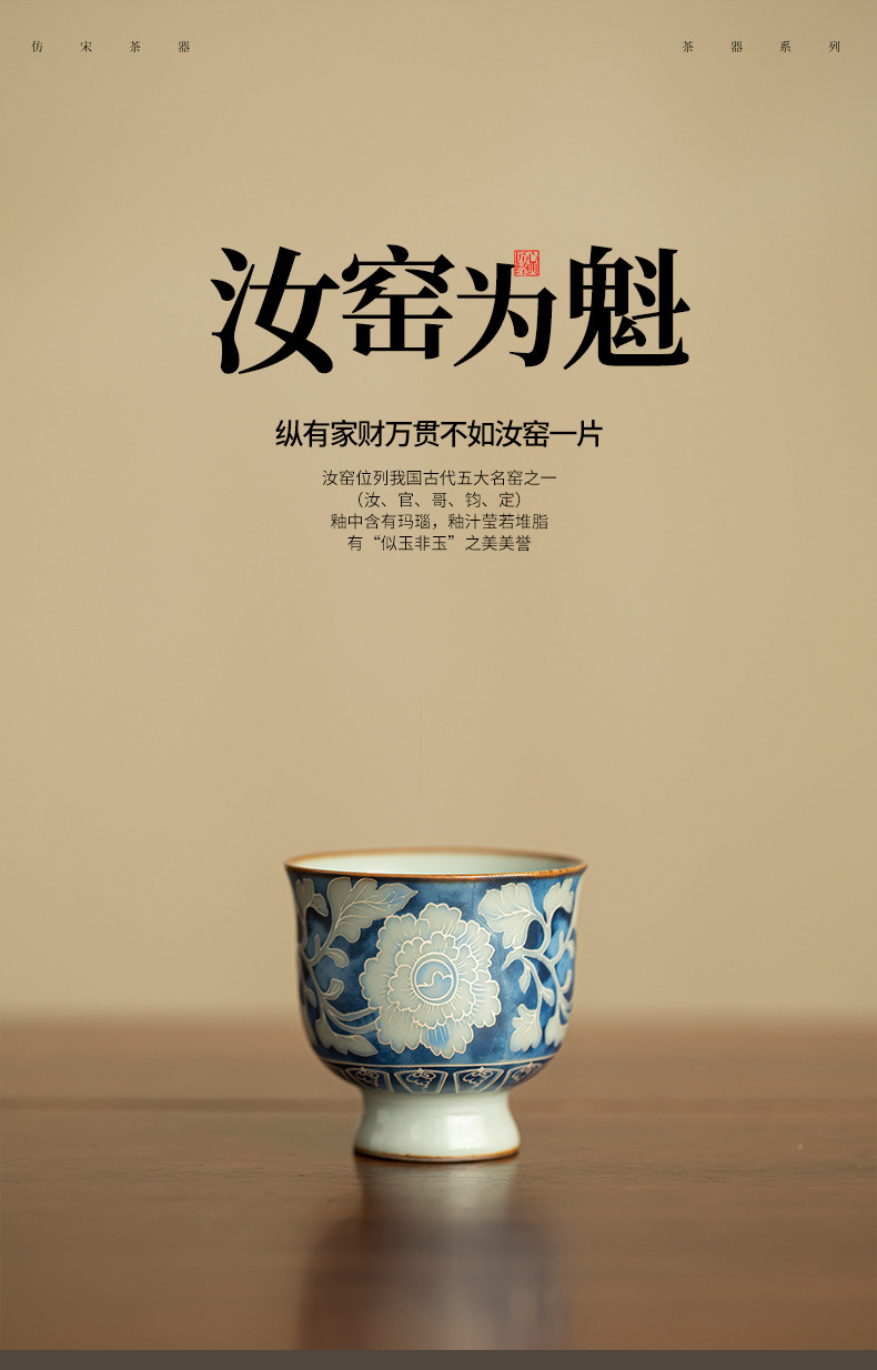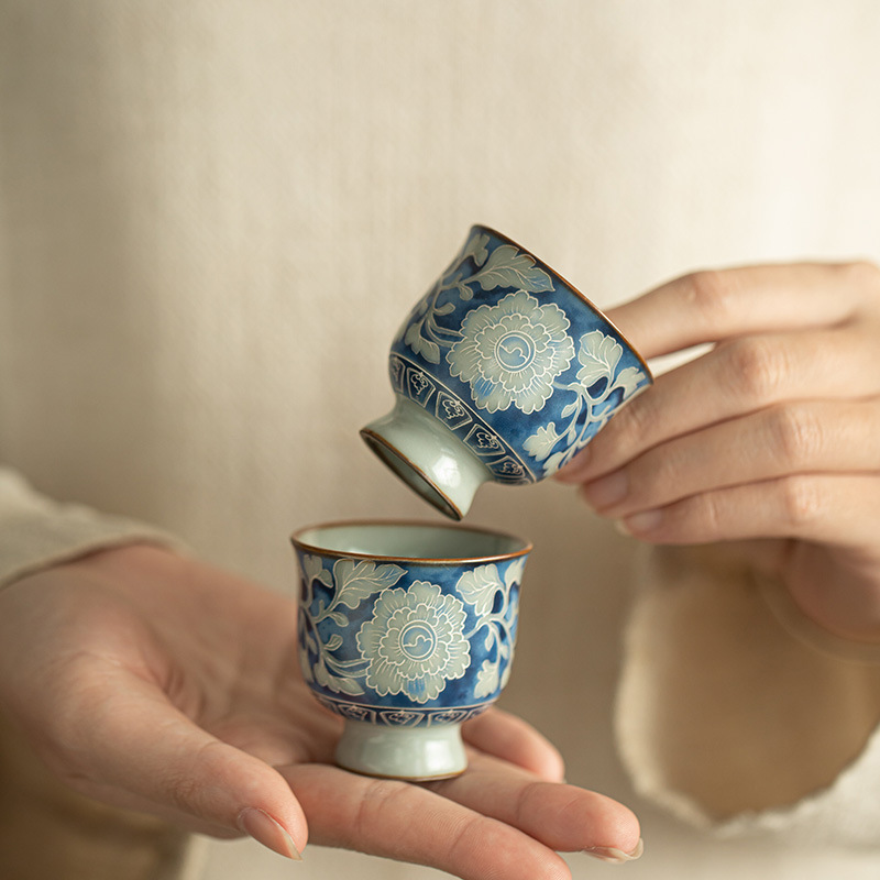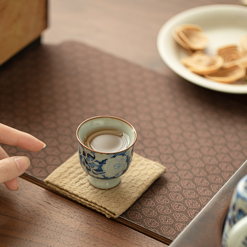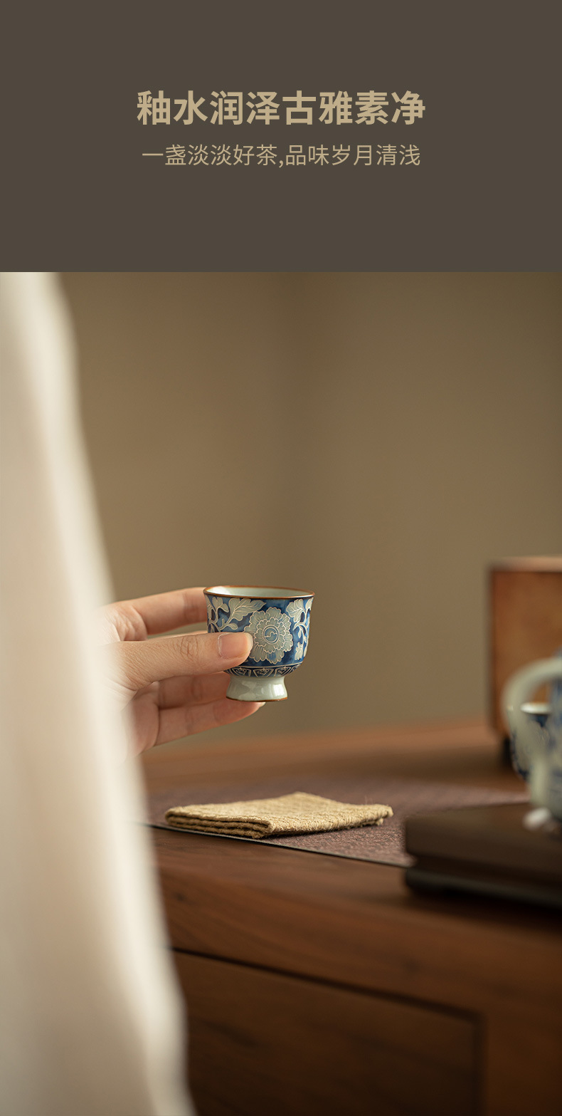 仿宋汝窑元青花茶杯主人杯客杯陶瓷茶具高脚杯开片可养牡丹品茗杯