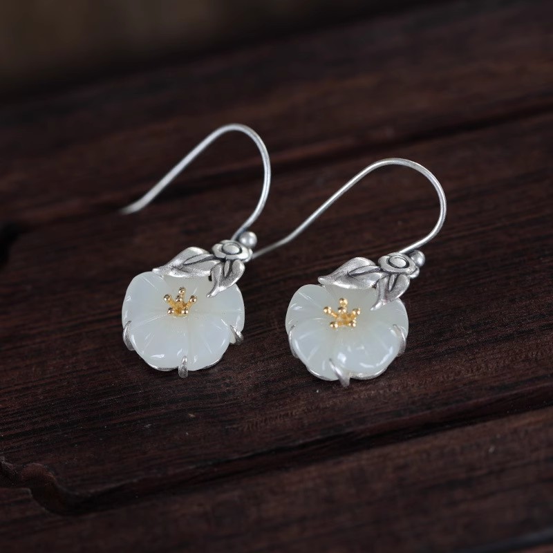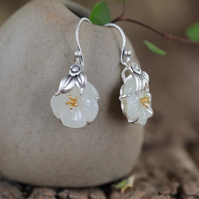 和田白玉花朵耳钩女中国风小众设计高级感泰银复古蜜蜂山茶花耳环
