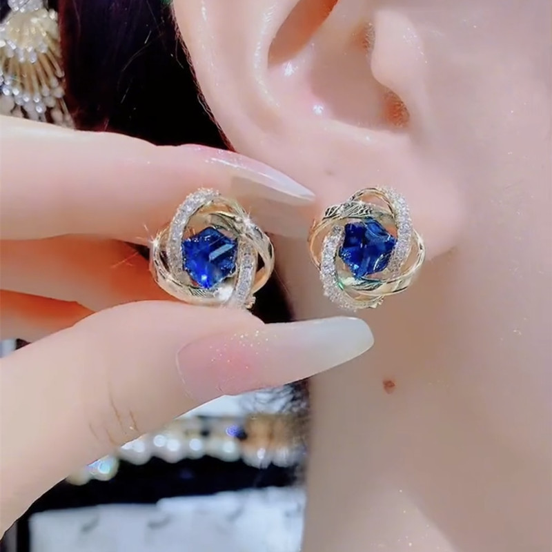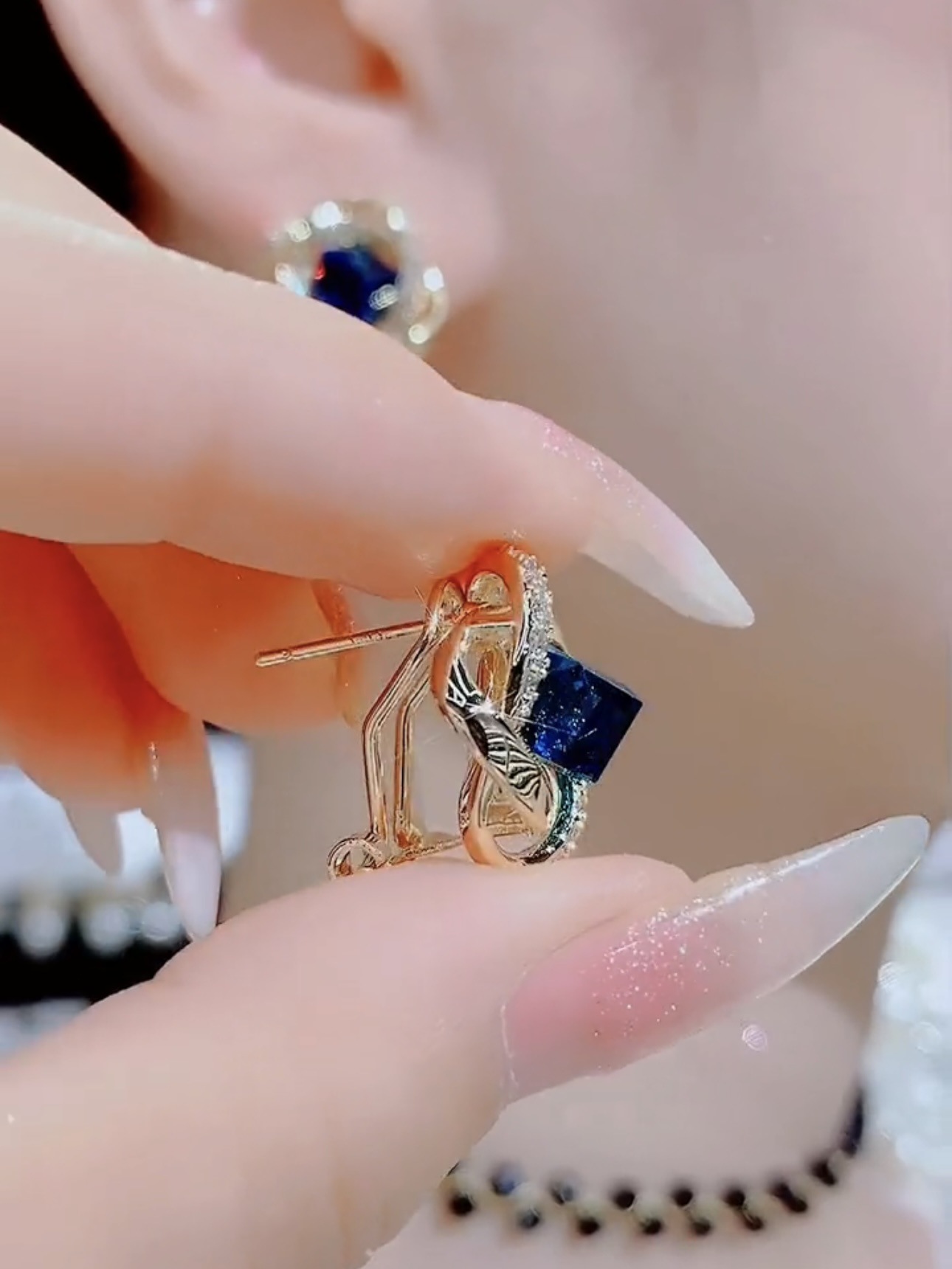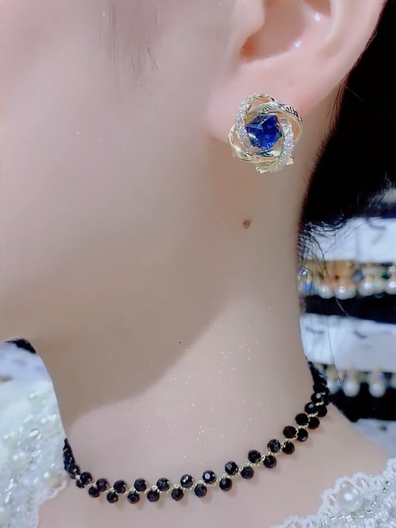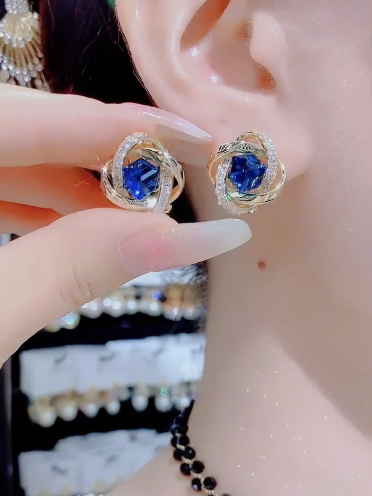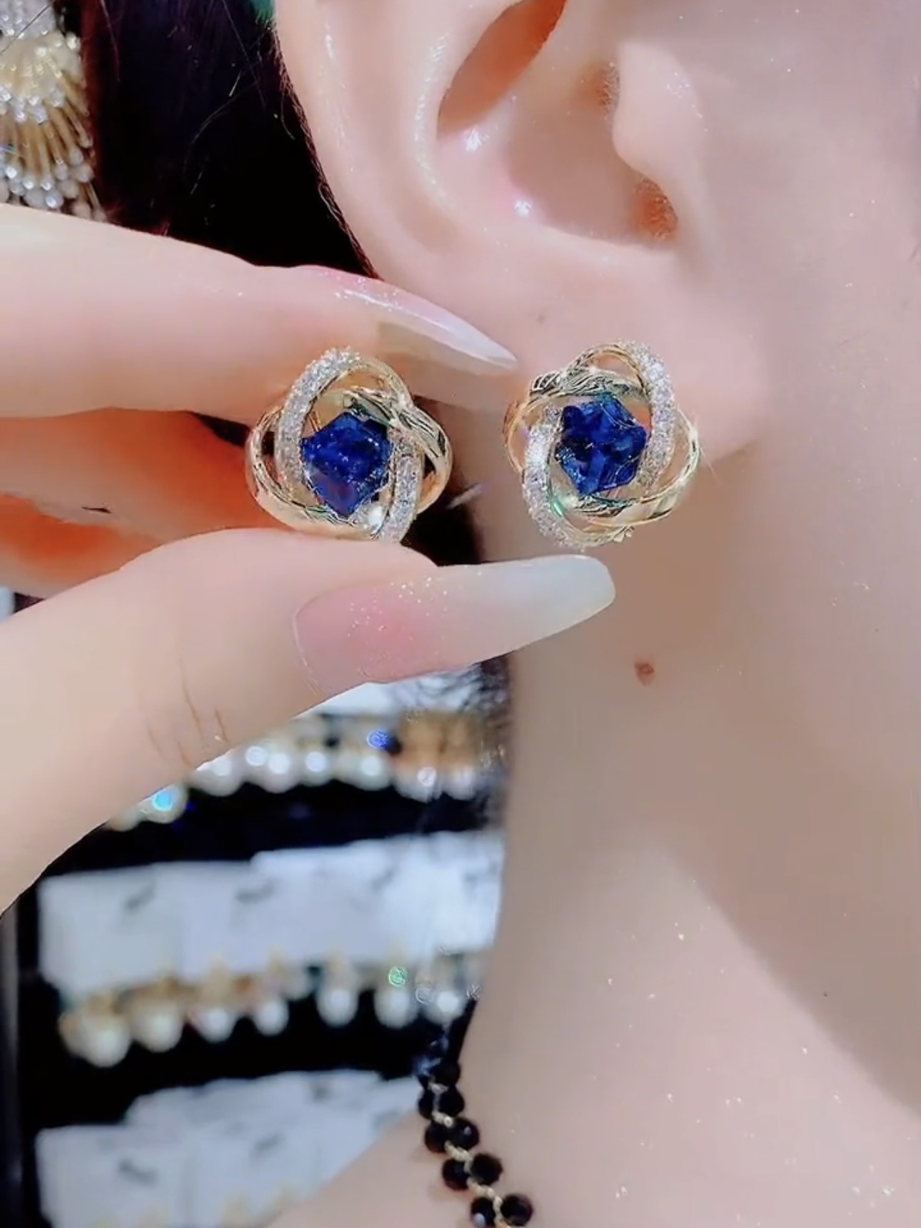2025年新款潮轻奢高级感缠绕满钻蓝色耳钉时尚网红大脸显瘦耳环女
