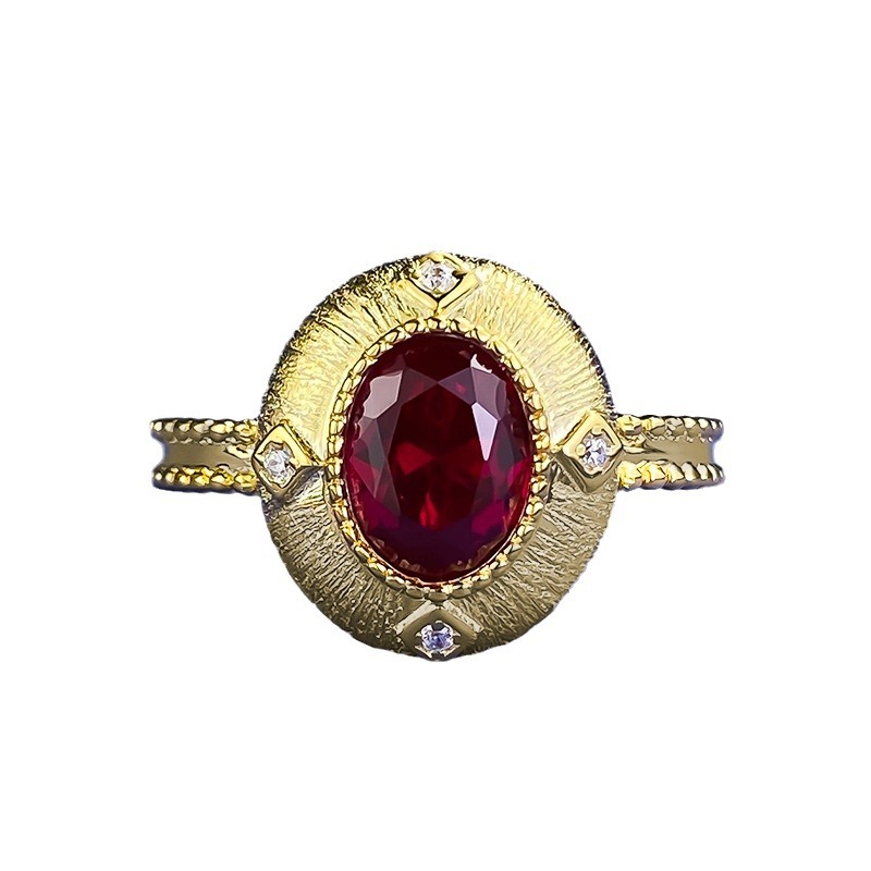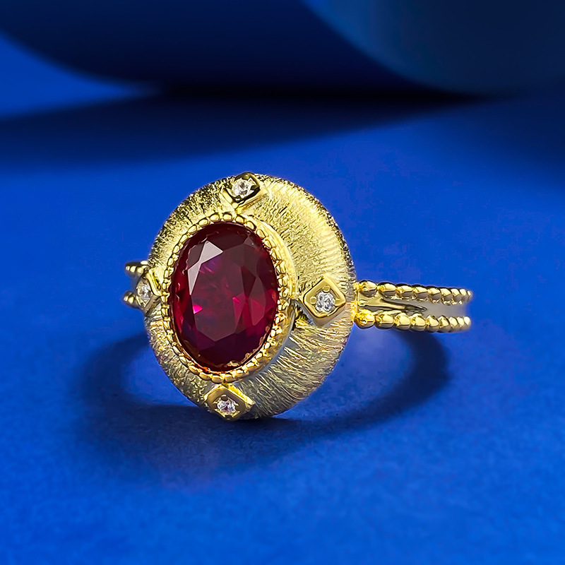 慕景珠宝S925银古法鸽子蛋7*9mm鸽血红拉丝戒指国潮新中式戒指环